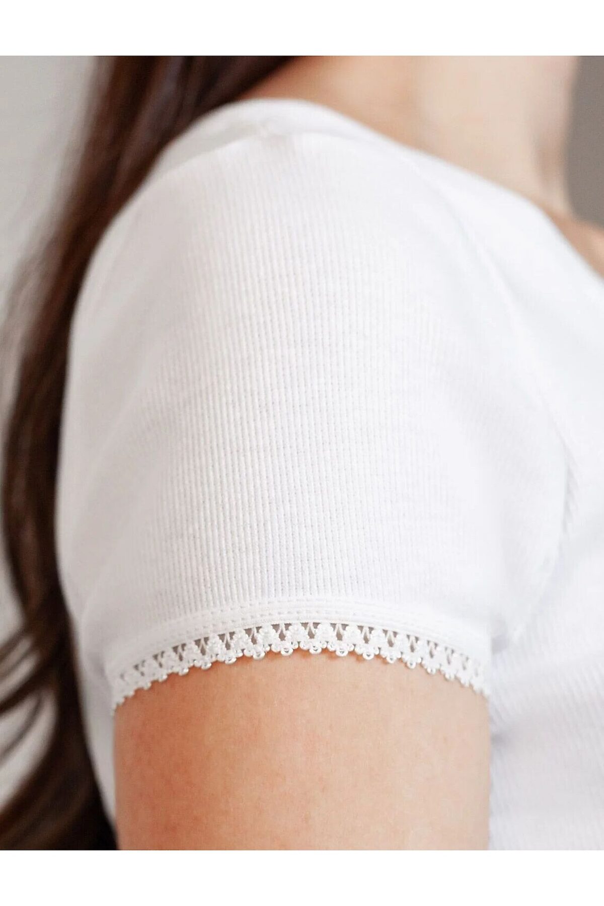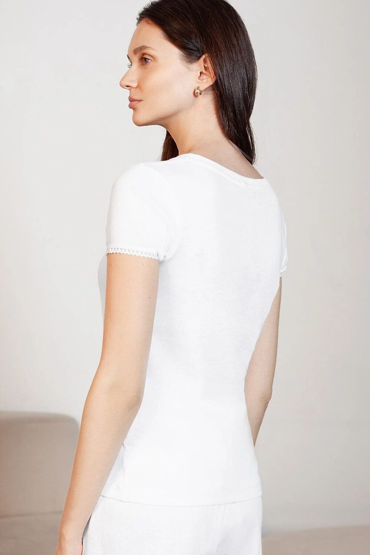 Футболка белого цвета с круглым вырезом из из фактурного трикотажа в рубчик идеально сочетается с повседневным стилем и подходит для домашней носки или отдыха. Мягкое полотно из хлопка обеспечивает максимальный комфорт даже в течение длительного времени. Особенность этого изделия — эластичная структура ткани, благодаря чему она хорошо тянется и подстраивается под особенности фигуры. Короткие рукава делают модель легкой и универсальной. На рукавах отделка нежным кружевом в тон основного цвета добавляет нотку романтичности. Футболка подойдет для девушек и женщин, которые ценят уют и удобство. Нежная ткань приятна к телу, не вызывает дискомфорта и позволяет коже дышать, что особенно важно в повседневной жизни. Футболка в мелкий рубчик полуприлегающего кроя визуально вытягивает силуэт и делает фигуру более стройной. Разнообразие размеров позволяет выбрать подходящий вариант для любых параметров, в том числе на большие размеры. Эта красивая футболка практична и незаменима для тех, кто ищет качественные и стильные вещи на каждый день. Рекомендуем сочетать с артикулами: D48.011, D48.012, D44.160, D44.161, D44.162, D44.163, D46.058, D40.001, D40.002, D40.003