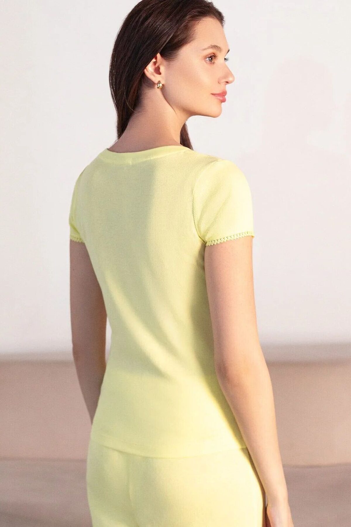 Футболка лимонного цвета с круглым вырезом из из фактурного трикотажа в рубчик идеально сочетается с повседневным стилем и подходит для домашней носки или отдыха. Мягкое полотно из хлопка обеспечивает максимальный комфорт даже в течение длительного времени. Особенность этого изделия — эластичная структура ткани, благодаря чему она хорошо тянется и подстраивается под особенности фигуры. Короткие рукава делают модель легкой и универсальной. На рукавах отделка нежным кружевом в тон основного цвета добавляет нотку романтичности. Футболка подойдет для девушек и женщин, которые ценят уют и удобство. Нежная ткань приятна к телу, не вызывает дискомфорта и позволяет коже дышать, что особенно важно в повседневной жизни. Футболка в мелкий рубчик полуприлегающего кроя визуально вытягивает силуэт и делает фигуру более стройной. Разнообразие размеров позволяет выбрать подходящий вариант для любых параметров, в том числе на большие размеры. Эта красивая футболка практична и незаменима для тех, кто ищет качественные и стильные вещи на каждый день. Рекомендуем сочетать с артикулами: D48.011, D48.012, D44.160, D44.161, D44.162, D44.163, D46.058, D40.001, D40.002, D40.003