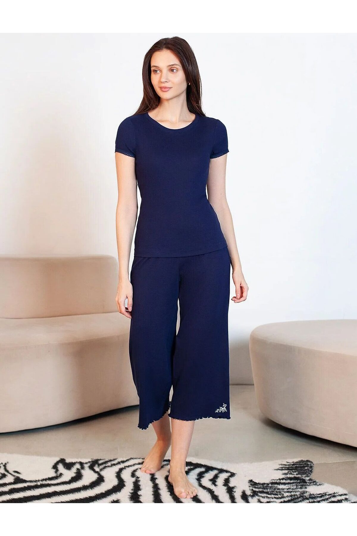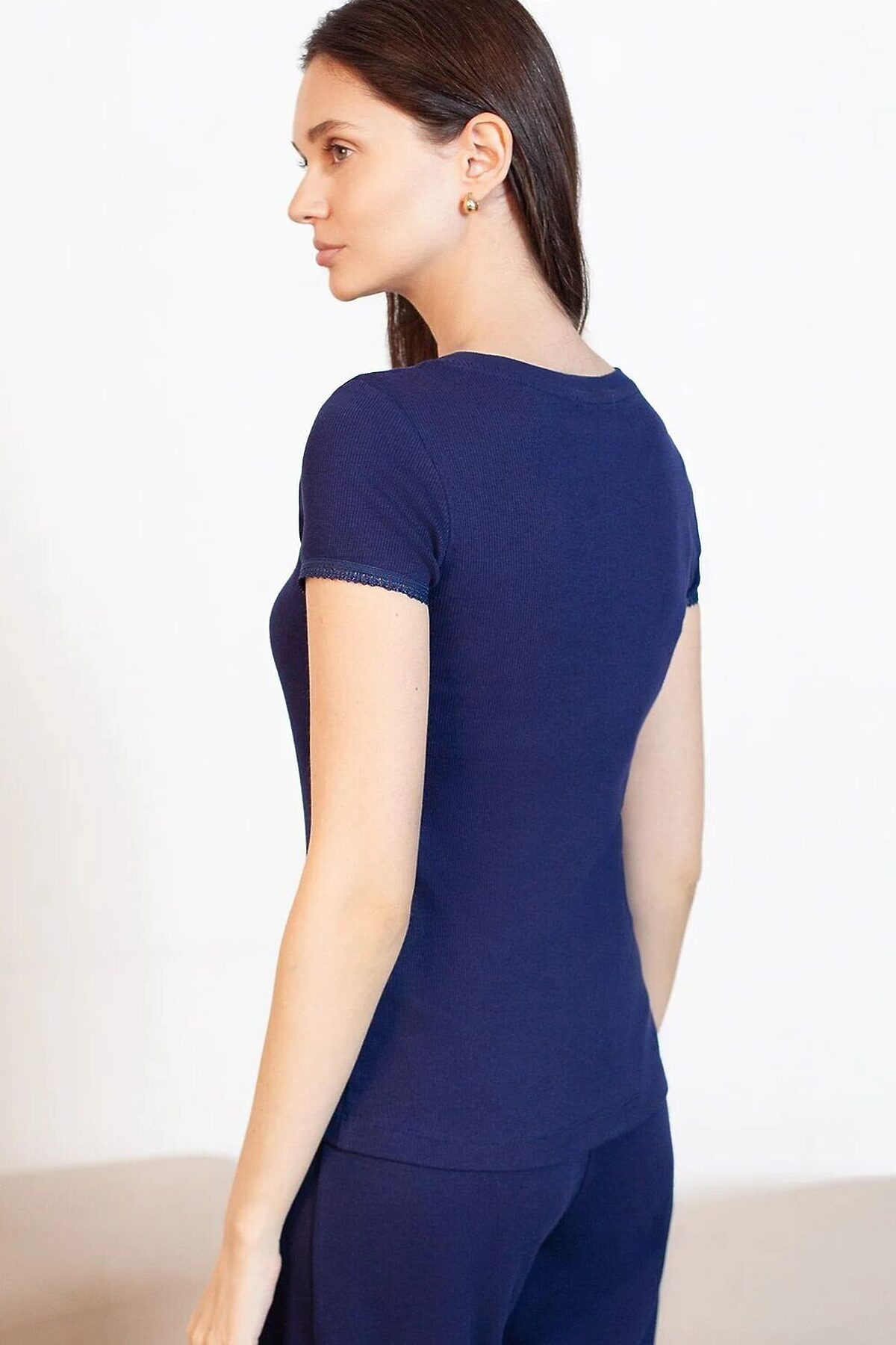 Футболка темно-синего цвета с круглым вырезом из фактурного трикотажа в рубчик идеально сочетается с повседневным стилем и подходит для домашней носки или отдыха. Мягкое полотно из хлопка обеспечивает максимальный комфорт даже в течение длительного времени. Особенность этого изделия — эластичная структура ткани, благодаря чему она хорошо тянется и подстраивается под особенности фигуры. Короткие рукава делают модель легкой и универсальной. На рукавах отделка нежным кружевом в тон основного цвета добавляет нотку романтичности. Футболка подойдет для девушек и женщин, которые ценят уют и удобство. Нежная ткань приятна к телу, не вызывает дискомфорта и позволяет коже дышать, что особенно важно в повседневной жизни. Футболка в мелкий рубчик полуприлегающего кроя визуально вытягивает силуэт и делает фигуру более стройной. Разнообразие размеров позволяет выбрать подходящий вариант для любых параметров, в том числе на большие размеры. Эта красивая футболка практична и незаменима для тех, кто ищет качественные и стильные вещи на каждый день. Рекомендуем сочетать с артикулами: D48.011, D48.012, D44.160, D44.161, D44.162, D44.163, D46.058, D40.001, D40.002, D40.003