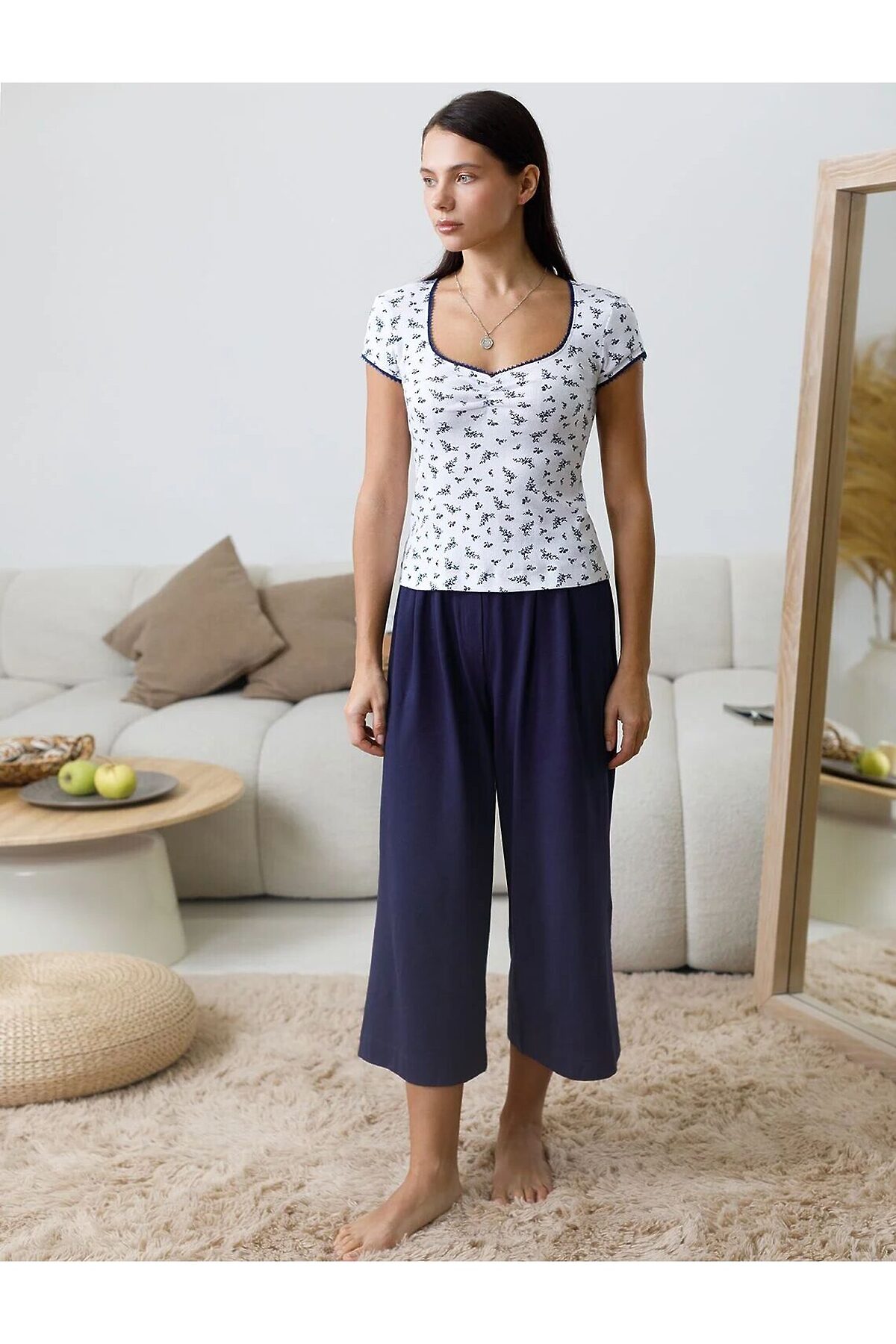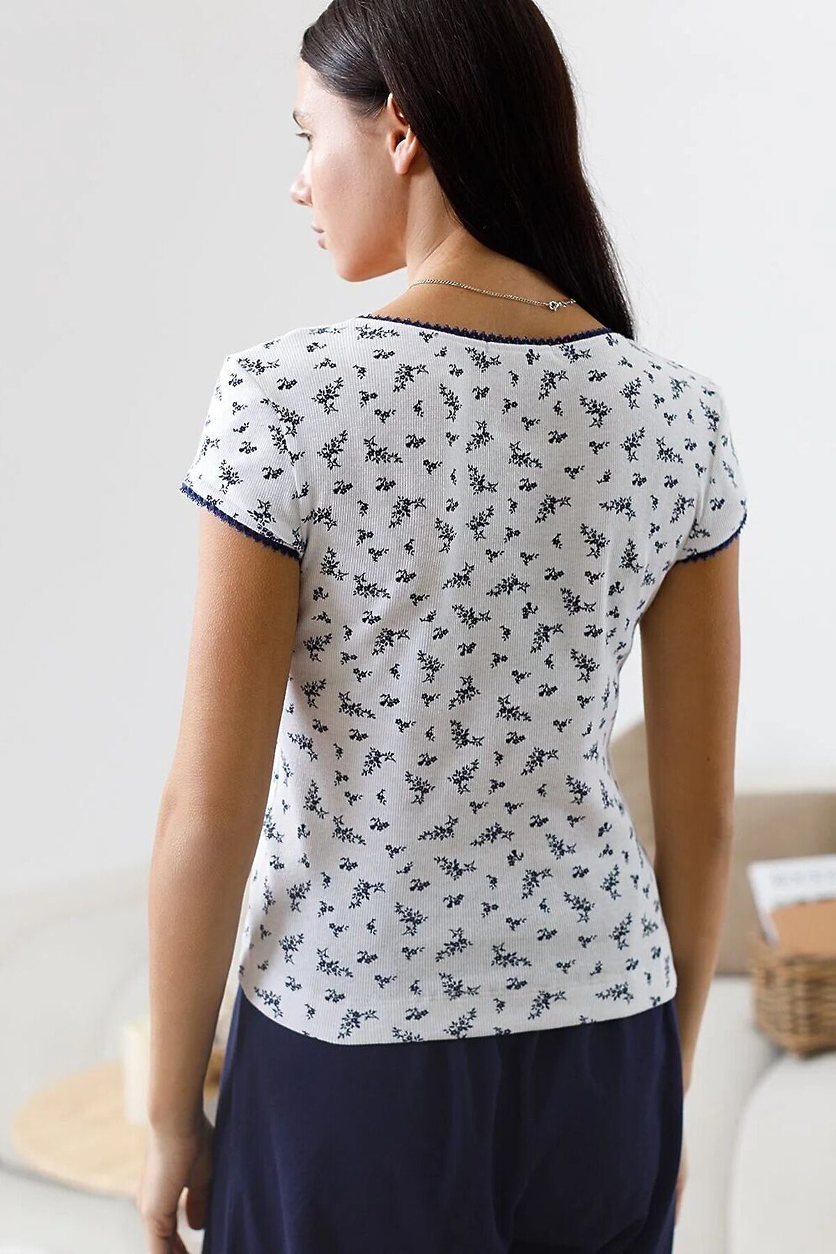Футболка с фигурным вырезом каре из эластичного трикотажа кашкорсе VILATTE, белый-т.синий цветы