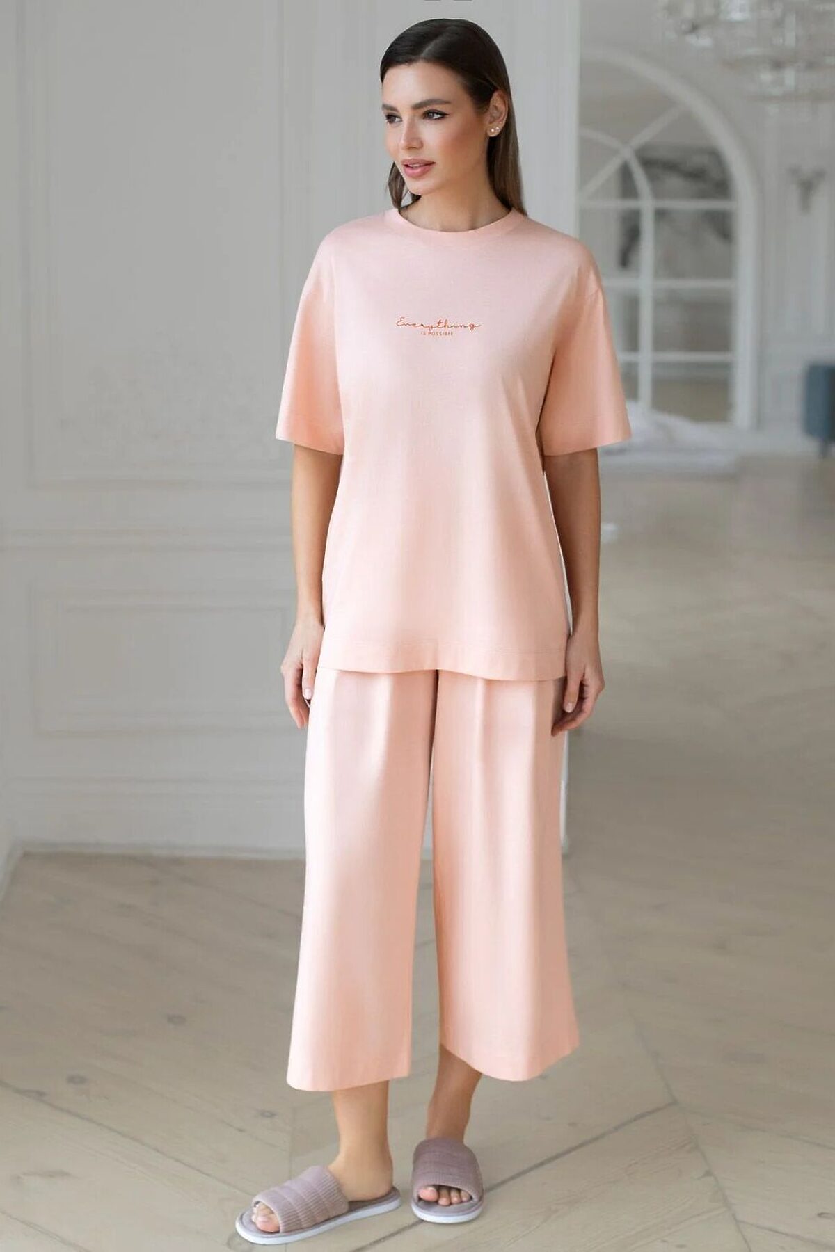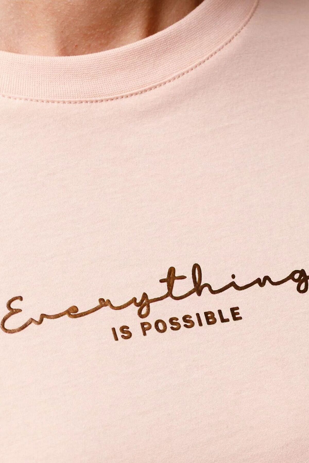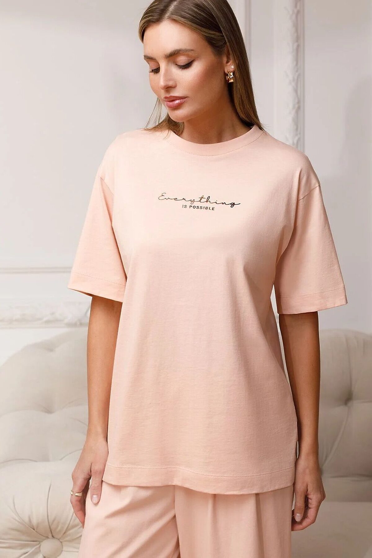 Оверсайз футболка пудрового цвета изготовлена из премиального 100% хлопка обеспечивает невероятное ощущение уюта и легкости. Натуральный материал сохраняет форму и цвет после множества стирок, обеспечивая долговечность изделия, а его высокая воздухопроницаемость создает ощущение свежести даже в течение долгого дня. Особое внимание привлекает стильный принт в виде надписи. Перевод надписи: Everything is possible - Все возможно. Принт выполнен красками с устойчивым покрытием, который добавляет футболке оригинальности и позволяет выразить индивидуальность. Свободный крой футболки дарит удобство и не стесняет движений, что делает ее идеальной для повседневной носки или активного отдыха, подчеркивает современный взгляд на моду. Подойдет девушкам и женщинам на любую фигуру, вы будете чувствовать себя в ней уверенно и комфортно. Отлично впишется в гардероб благодаря универсальному дизайну, который легко сочетать с любыми низами. Рекомендуем сочетать с артикулами: D44.163, D44.162, D44.161, D46.058, D48.011, D48.012