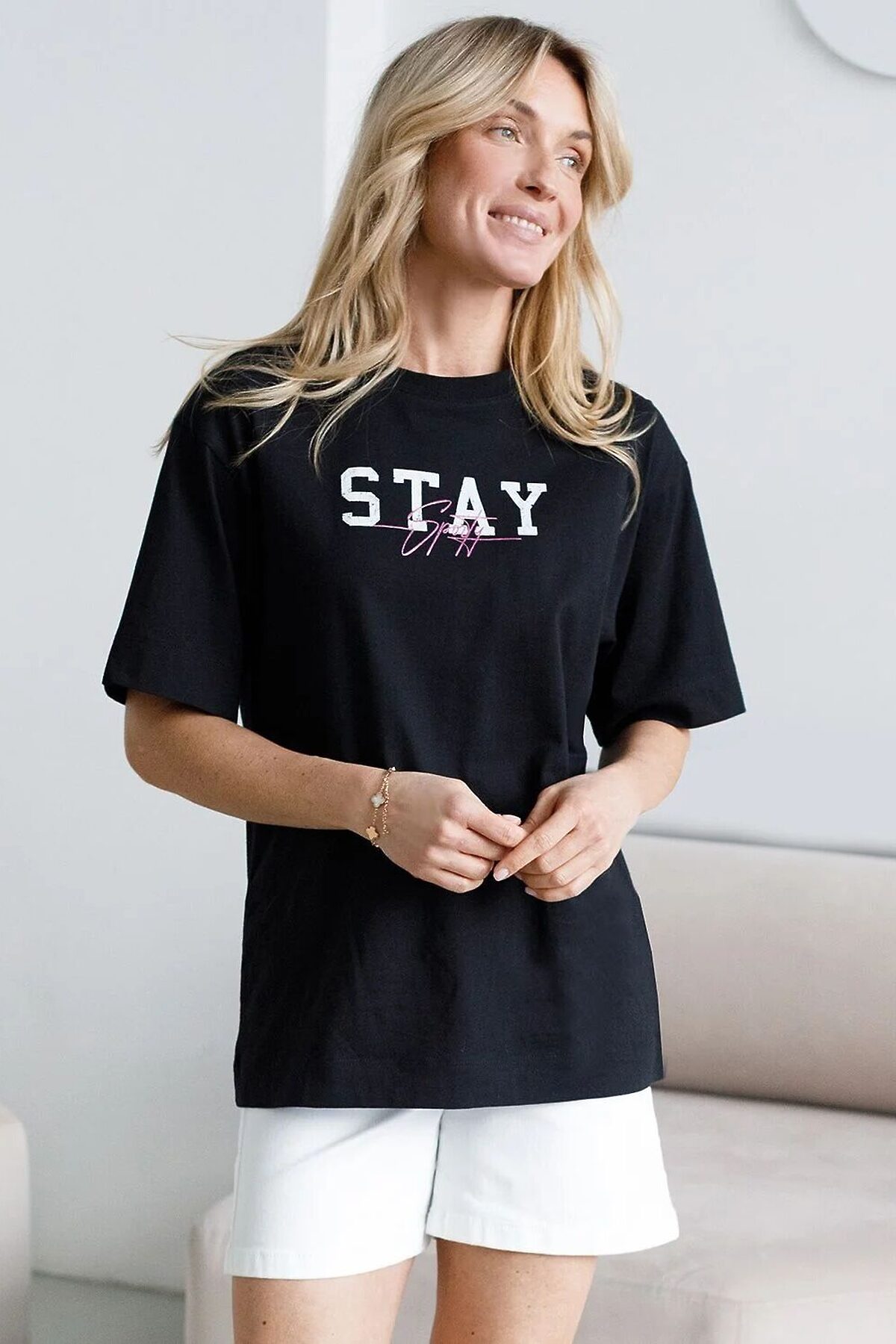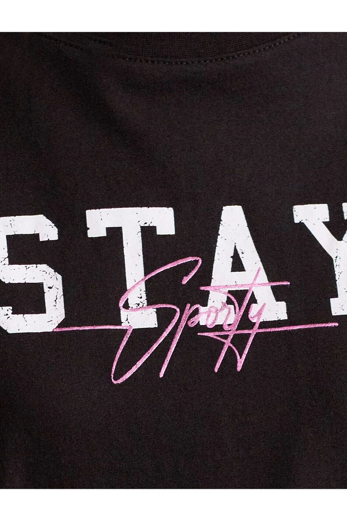 Оверсайз футболка черного цвета изготовлена из премиального 100% хлопка, она обеспечивает невероятное ощущение уюта и легкости. Натуральный материал сохраняет форму и цвет после множества стирок, обеспечивая долговечность изделия, а его высокая воздухопроницаемость создает ощущение свежести даже в течение долгого дня. Особое внимание привлекает стильный принт в виде надписи. Перевод надписи: Stay Sporty - Оставайся спортивной. Принт выполнен красками с устойчивым покрытием, который добавляет футболке оригинальности и позволяет выразить индивидуальность. Свободный крой футболки дарит удобство и не стесняет движений, что делает ее идеальной для повседневной носки или активного отдыха, подчеркивает современный взгляд на моду. Подойдет девушкам и женщинам на любую фигуру, вы будете чувствовать себя в ней уверенно и комфортно. Отлично впишется в гардероб благодаря универсальному дизайну, который легко сочетать с любыми низами. Рекомендуем сочетать с артикулами: D44.163, D44.162, D44.161, D46.058, D48.011, D48.012