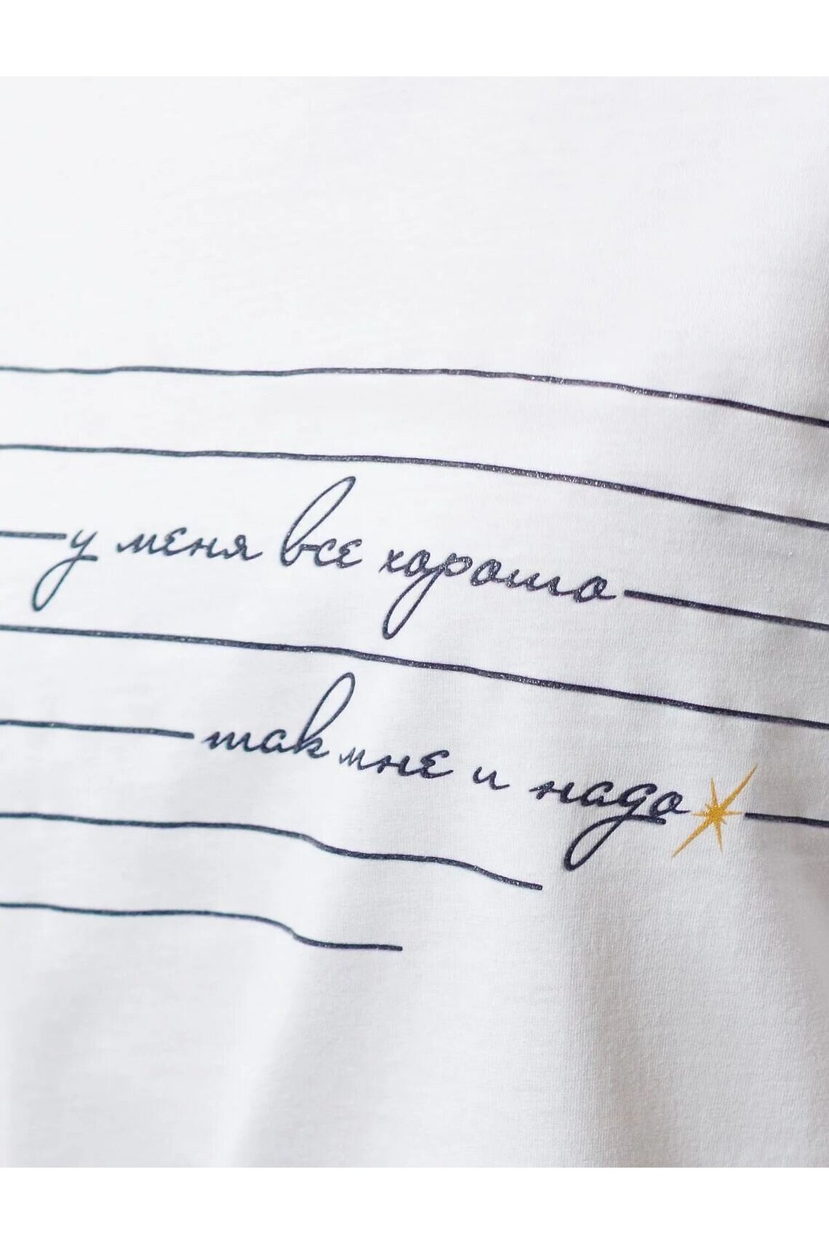Футболка белого цвета изготовлена из премиального 100% хлопка, благодаря чему изделие приятно прилегает к телу, не вызывает дискомфорта и идеально подходит для чувствительной кожи. Натуральный материал сохраняет форму и цвет после множества стирок, обеспечивая долговечность изделия, а его высокая воздухопроницаемость создает ощущение свежести даже в течение долгого дня. Особое внимание привлекает стильный принт контрастного цвета в виде полосок с надписью: У меня все хорошо, так мне и надо. Принт выполнен красками с устойчивым покрытием, который добавляет изделию оригинальности и позволяет выразить индивидуальность. Свободный крой футболки дарит удобство и не стесняет движений, что делает ее идеальной для повседневной носки или активного отдыха, подчеркивает современный взгляд на моду. Подойдет девушкам и женщинам на любую фигуру, вы будете чувствовать себя в ней уверенно и комфортно. Лаконичный современный принт делает изделие универсальным: можно создавать стильные образы для прогулок, встреч, занятий спортом и домашних дел. Базовая футболка подходит для любой ситуации и сочетается с разными элементами гардероба. Рекомендуем сочетать с артикулами: D44.163, D44.162, D44.161, D46.058, D48.011, D48.012