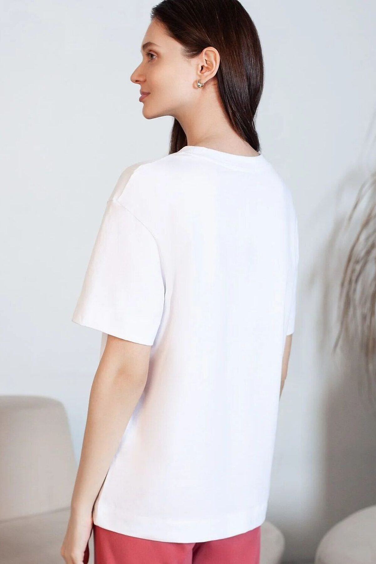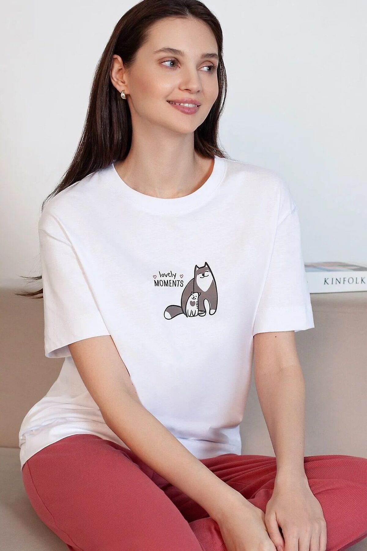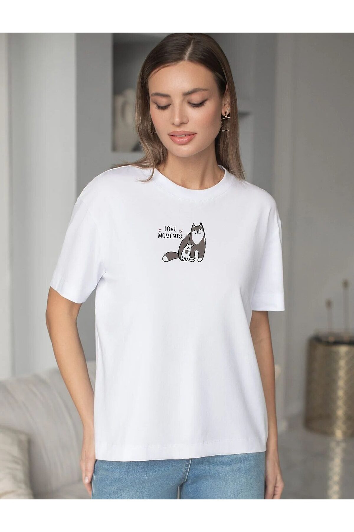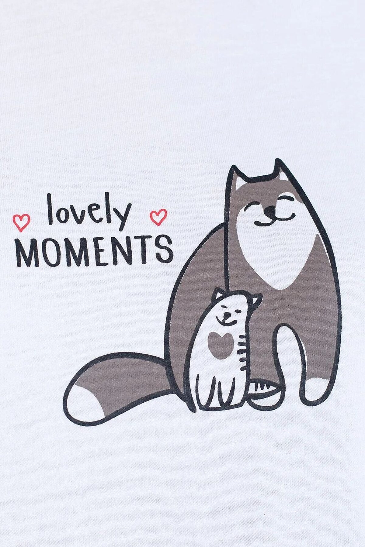 Футболка белого цвета изготовлена из премиального 100% хлопка, благодаря чему изделие приятно прилегает к телу, не вызывает дискомфорта и идеально подходит для чувствительной кожи. Натуральный материал сохраняет форму и цвет после множества стирок, обеспечивая долговечность изделия, а его высокая воздухопроницаемость создает ощущение свежести даже в течение долгого дня. Особое внимание привлекает стильный принт контрастного цвета в виде котиков с надписью. Перевод надписи: Love moments - Моменты любви. Принт выполнен красками с устойчивым покрытием, который добавляет изделию оригинальности и позволяет выразить индивидуальность. Свободный крой футболки дарит удобство и не стесняет движений, что делает ее идеальной для повседневной носки или активного отдыха, подчеркивает современный взгляд на моду. Подойдет девушкам и женщинам на любую фигуру, вы будете чувствовать себя в ней уверенно и комфортно. Лаконичный современный принт делает изделие универсальным: можно создавать стильные образы для прогулок, встреч, занятий спортом и домашних дел. Базовая футболка подходит для любой ситуации и сочетается с разными элементами гардероба. Рекомендуем сочетать с артикулами: D44.163, D44.162, D44.161, D46.058, D48.011, D48.012