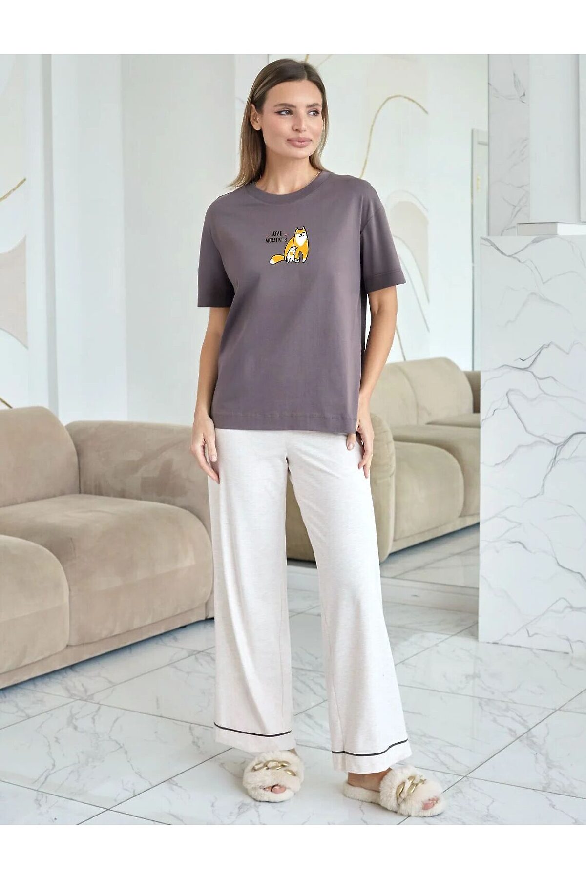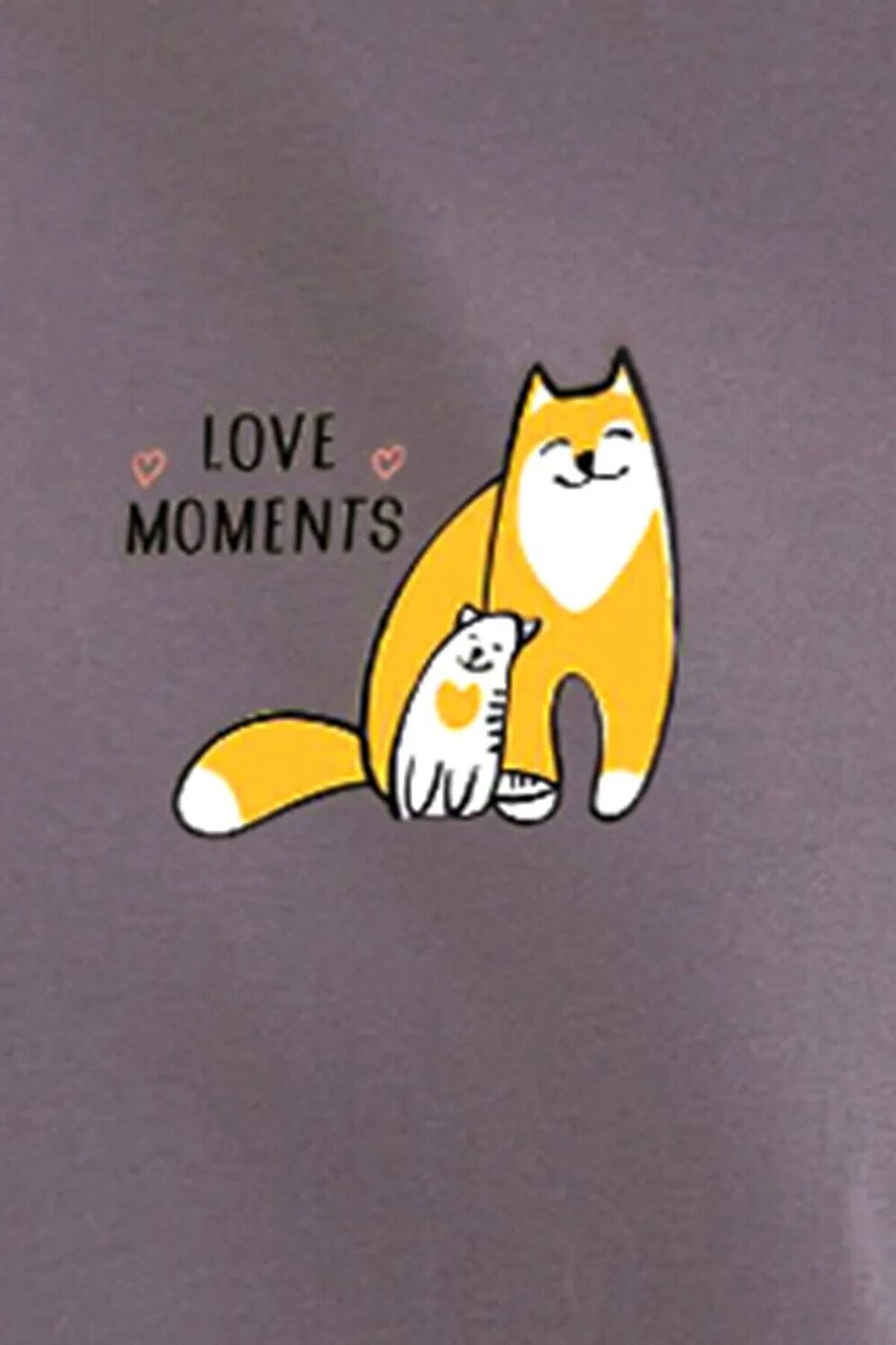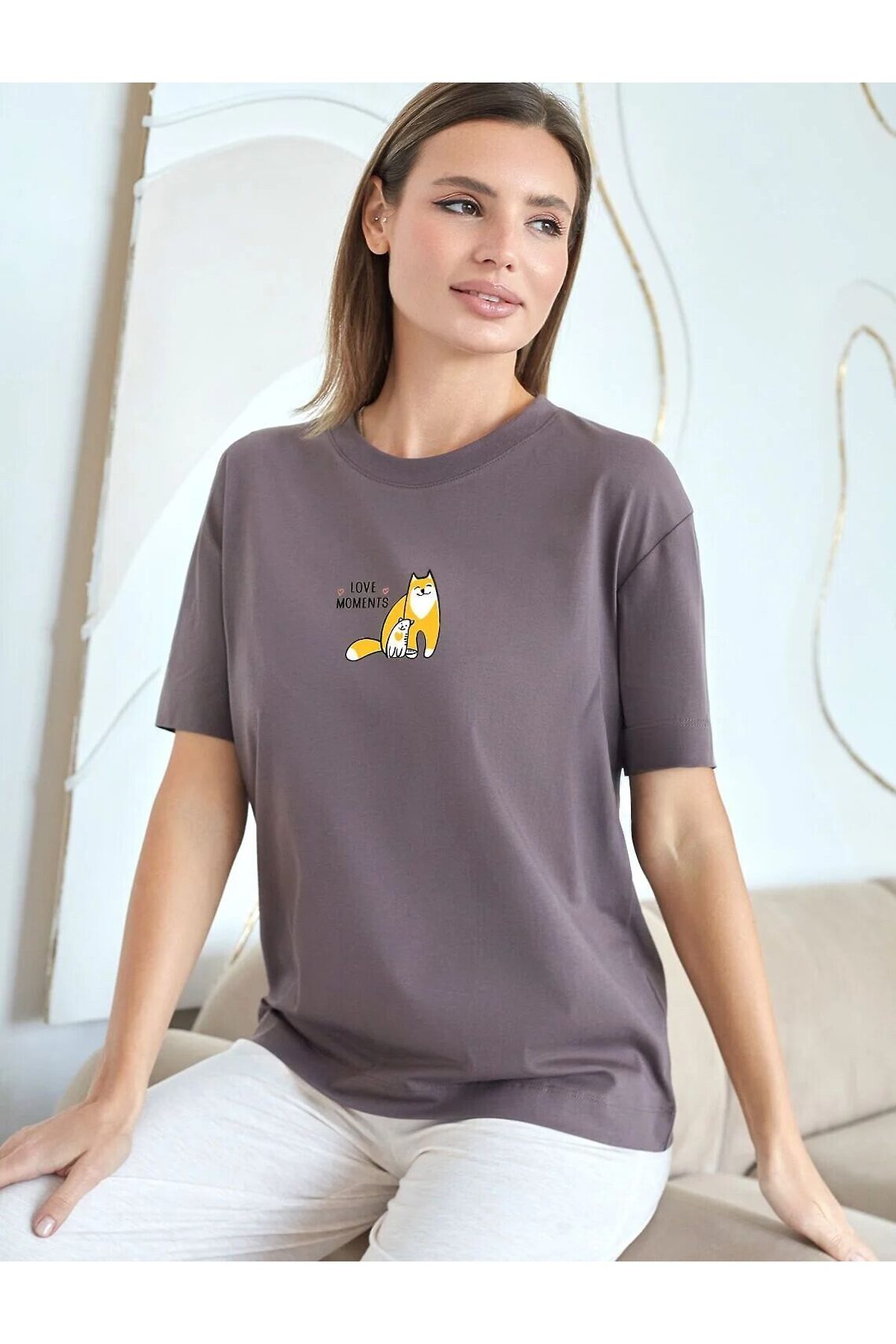 Футболка кофейного цвета изготовлена из премиального 100% хлопка, благодаря чему изделие приятно прилегает к телу, не вызывает дискомфорта и идеально подходит для чувствительной кожи. Натуральный материал сохраняет форму и цвет после множества стирок, обеспечивая долговечность изделия, а его высокая воздухопроницаемость создает ощущение свежести даже в течение долгого дня. Особое внимание привлекает стильный принт контрастного цвета в виде котиков с надписью. Перевод надписи: Love moments - Моменты любви. Принт выполнен красками с устойчивым покрытием, который добавляет изделию оригинальности и позволяет выразить индивидуальность. Свободный крой футболки дарит удобство и не стесняет движений, что делает ее идеальной для повседневной носки или активного отдыха, подчеркивает современный взгляд на моду. Подойдет девушкам и женщинам на любую фигуру, вы будете чувствовать себя в ней уверенно и комфортно. Лаконичный современный принт делает изделие универсальным: можно создавать стильные образы для прогулок, встреч, занятий спортом и домашних дел. Базовая футболка подходит для любой ситуации и сочетается с разными элементами гардероба. Рекомендуем сочетать с артикулами: D44.163, D44.162, D44.161, D46.058, D48.011, D48.012