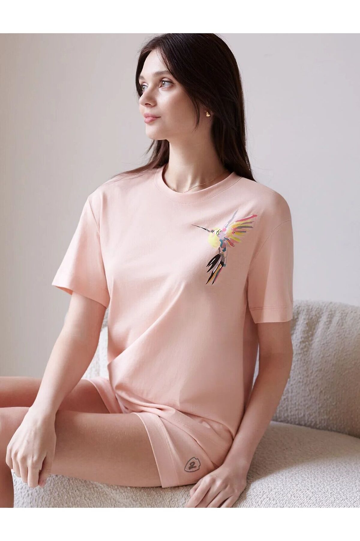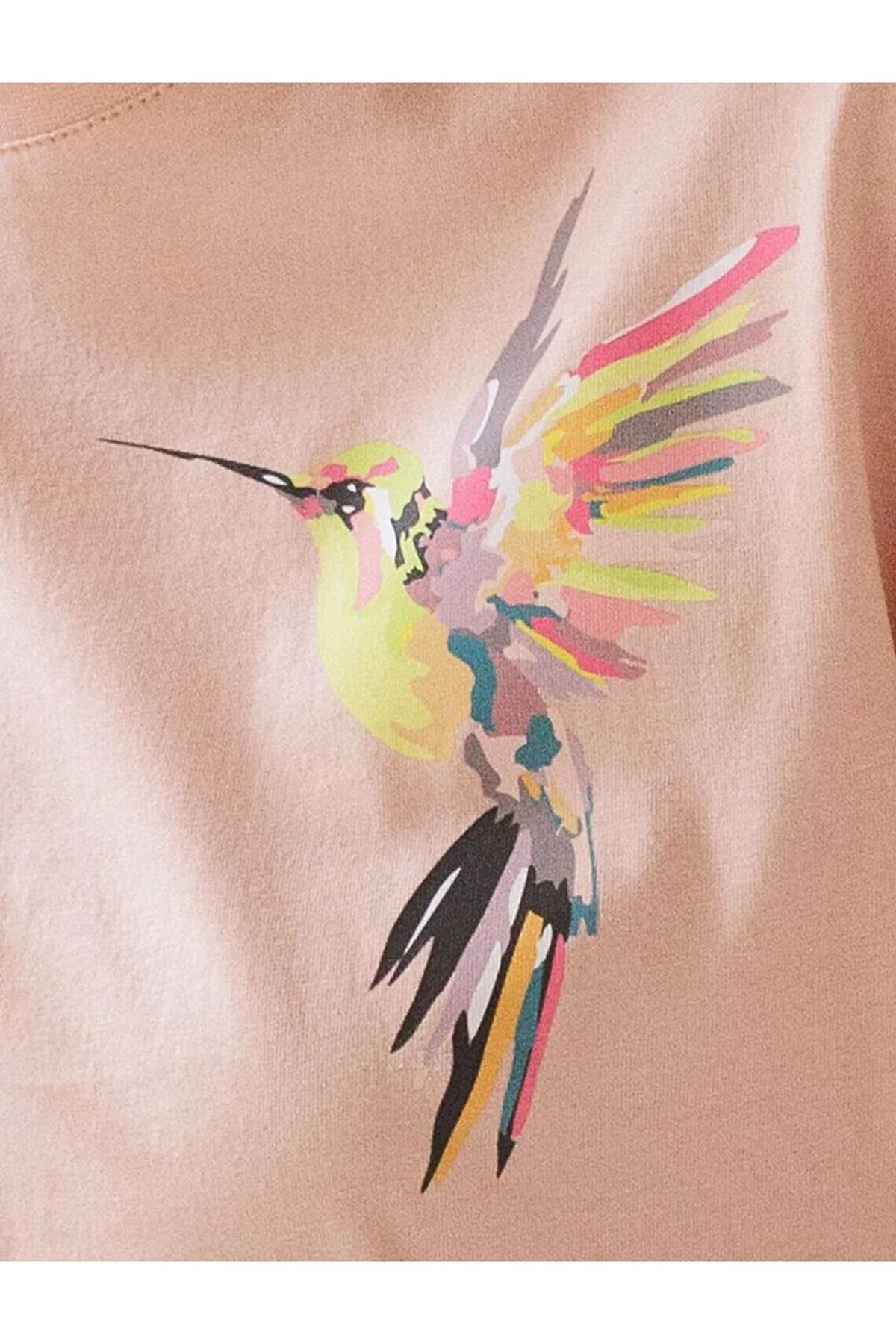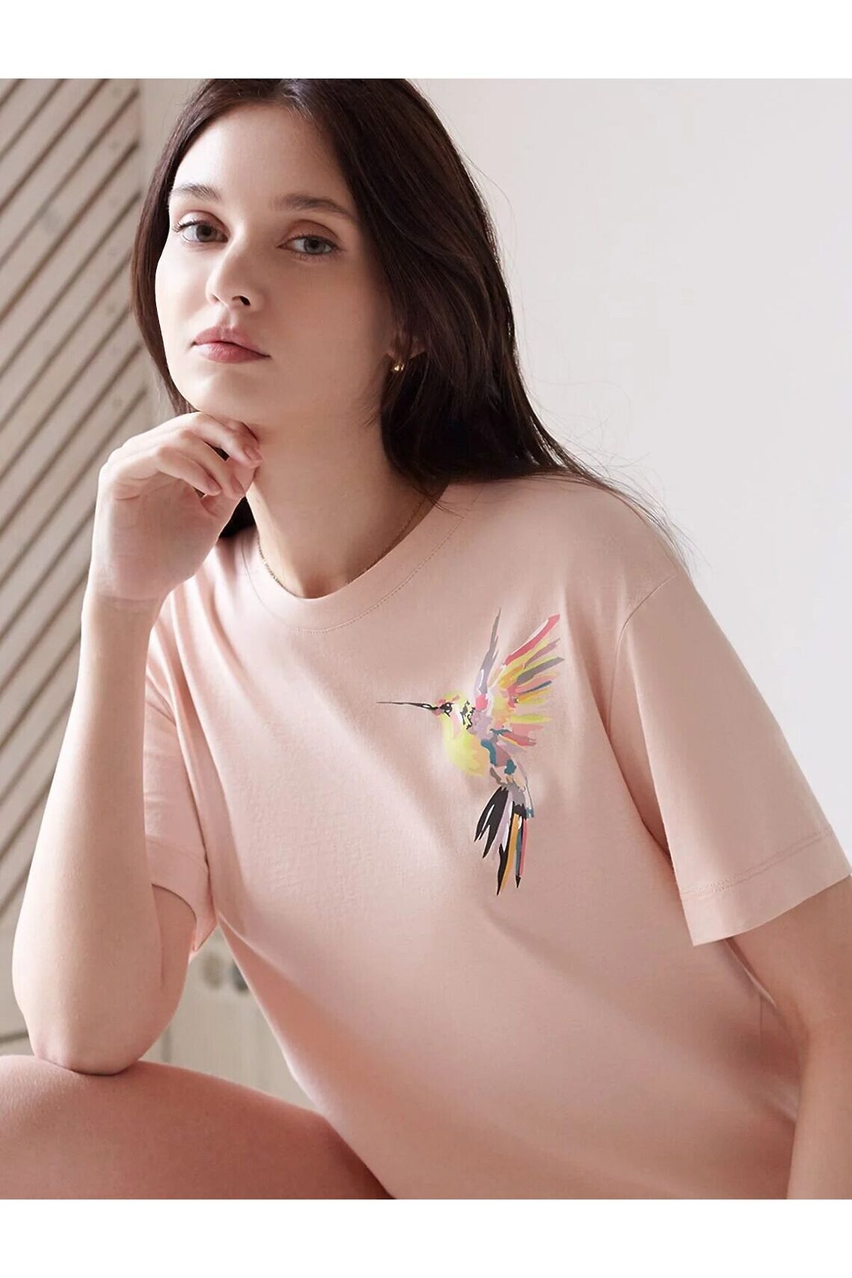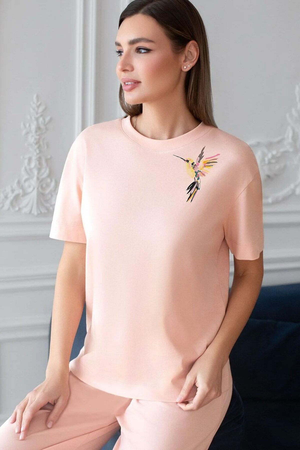 Футболка пудрового цвета изготовлена из премиального 100% хлопка, благодаря чему изделие приятно прилегает к телу, не вызывает дискомфорта и идеально подходит для чувствительной кожи. Натуральный материал сохраняет форму и цвет после множества стирок, обеспечивая долговечность изделия, а его высокая воздухопроницаемость создает ощущение свежести даже в течение долгого дня. Особое внимание привлекает стильный принт контрастного цвета в виде колибри. Принт выполнен красками с устойчивым покрытием, который добавляет изделию оригинальности и позволяет выразить индивидуальность. Свободный крой футболки дарит удобство и не стесняет движений, что делает ее идеальной для повседневной носки или активного отдыха, подчеркивает современный взгляд на моду. Подойдет девушкам и женщинам на любую фигуру, вы будете чувствовать себя в ней уверенно и комфортно. Лаконичный современный принт делает изделие универсальным: можно создавать стильные образы для прогулок, встреч, занятий спортом и домашних дел. Базовая футболка подходит для любой ситуации и сочетается с разными элементами гардероба. Рекомендуем сочетать с артикулами: D44.163, D44.162, D44.161, D46.058, D48.011, D48.012