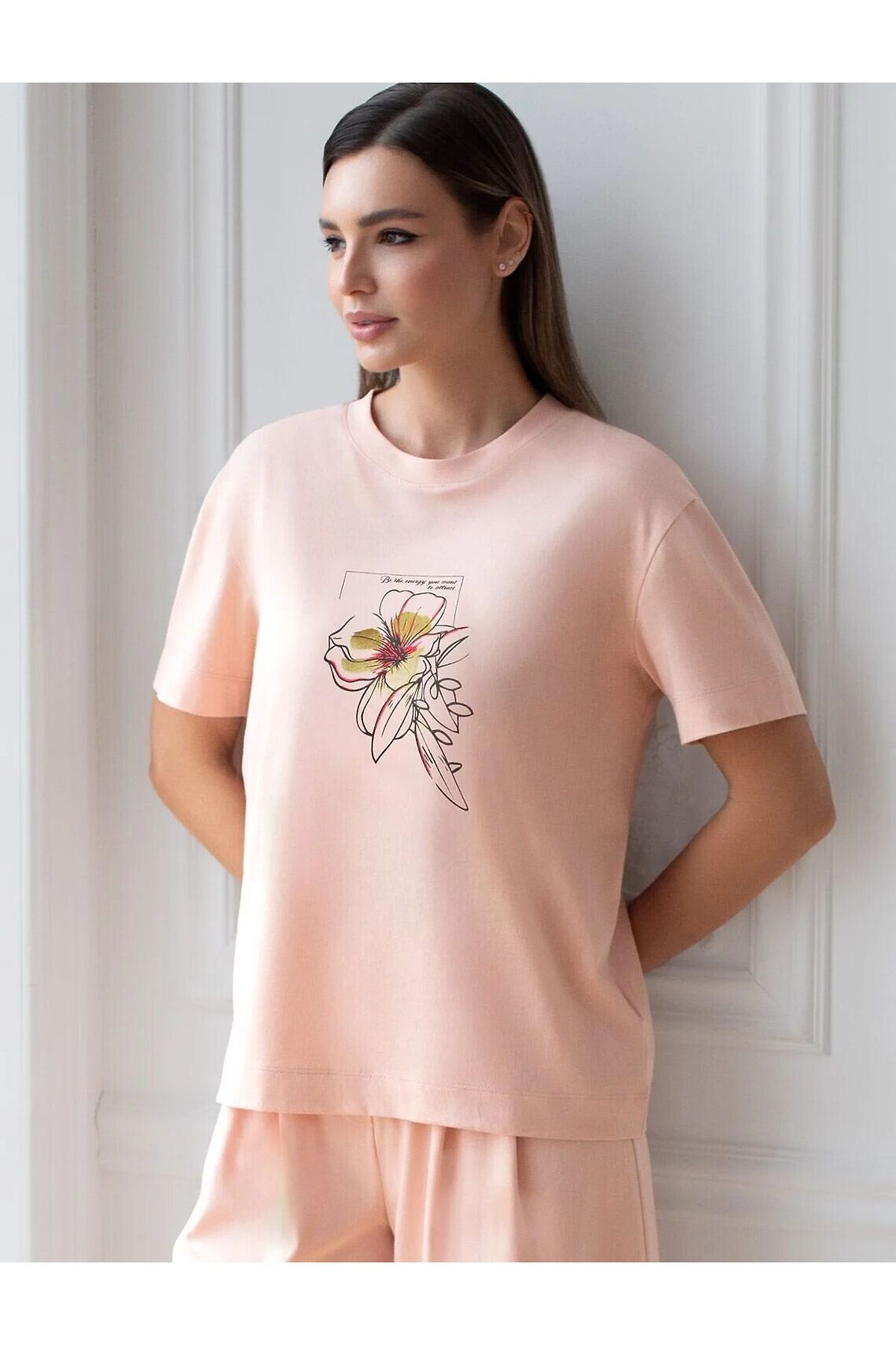Футболка пудрового цвета изготовлена из премиального 100% хлопка, благодаря чему изделие приятно прилегает к телу, не вызывает дискомфорта и идеально подходит для чувствительной кожи. Натуральный материал сохраняет форму и цвет после множества стирок, обеспечивая долговечность изделия, а его высокая воздухопроницаемость создает ощущение свежести даже в течение долгого дня. Особое внимание привлекает стильный принт контрастного цвета в виде цветка с надписью. Перевод надписи: Be the energy you vant to attract - Будь той энергией, которую хочешь привлечь. Принт выполнен красками с устойчивым покрытием, который добавляет изделию оригинальности и позволяет выразить индивидуальность. Свободный крой футболки дарит удобство и не стесняет движений, что делает ее идеальной для повседневной носки или активного отдыха, подчеркивает современный взгляд на моду. Подойдет девушкам и женщинам на любую фигуру, вы будете чувствовать себя в ней уверенно и комфортно. Лаконичный современный принт делает изделие универсальным: можно создавать стильные образы для прогулок, встреч, занятий спортом и домашних дел. Базовая футболка подходит для любой ситуации и сочетается с разными элементами гардероба. Рекомендуем сочетать с артикулами: D44.163, D44.162, D44.161, D46.058, D48.011, D48.012