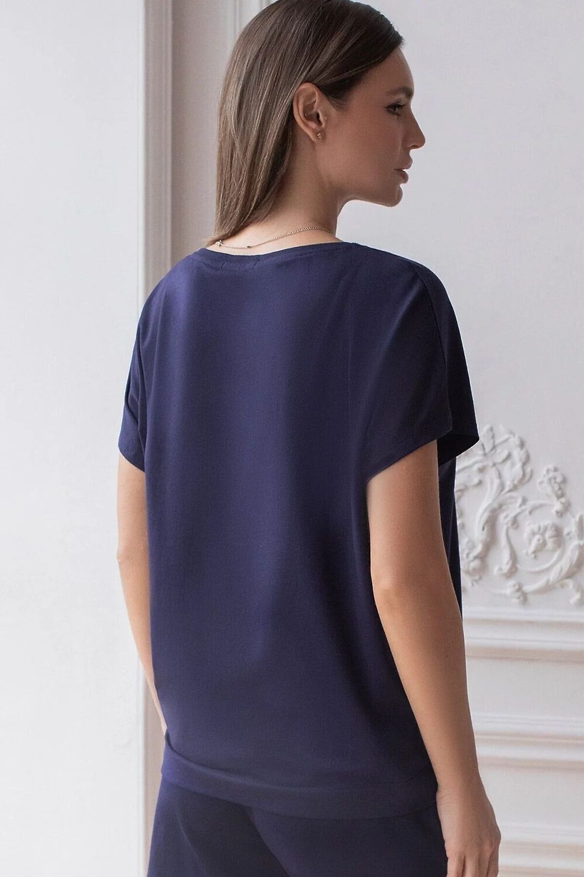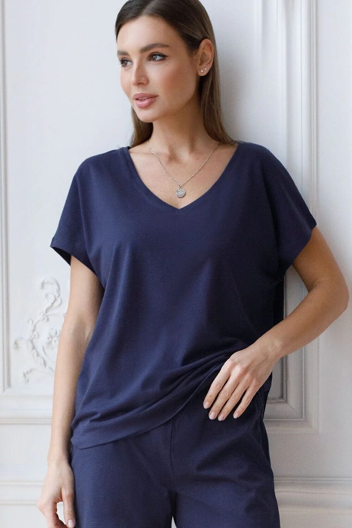 Свободная футболка темно-синего цвета с V-вырезом и цельнокроеным рукавом из натурального 100% хлопка создает красивый и легкий образ для дома и отдыха. Дышащая ткань бережно заботится о коже, в то время как декольте с V-вырезом утонченно подчеркивает линию шеи, а свободный крой скрывает возможные недостатки фигуры. Такая футболка отлично подойдет для тех, кто ценит комфорт и стиль одновременно. Благодаря натуральной хлопковой ткани, она идеально подходит для ежедневного использования, обеспечивая чувство легкости и свободы движений. Легкая структура материала поддерживает оптимальный микроклимат, что важно при длительном использовании. Эта футболка женственно смотрится и дарит ощущение уюта, делая ее необходимым элементом домашнего гардероба. Рекомендуем сочетать с артикулами: D44,160, D44.161, D44.162, D44.163, D44.161, D48.011, D48.012, D46.058