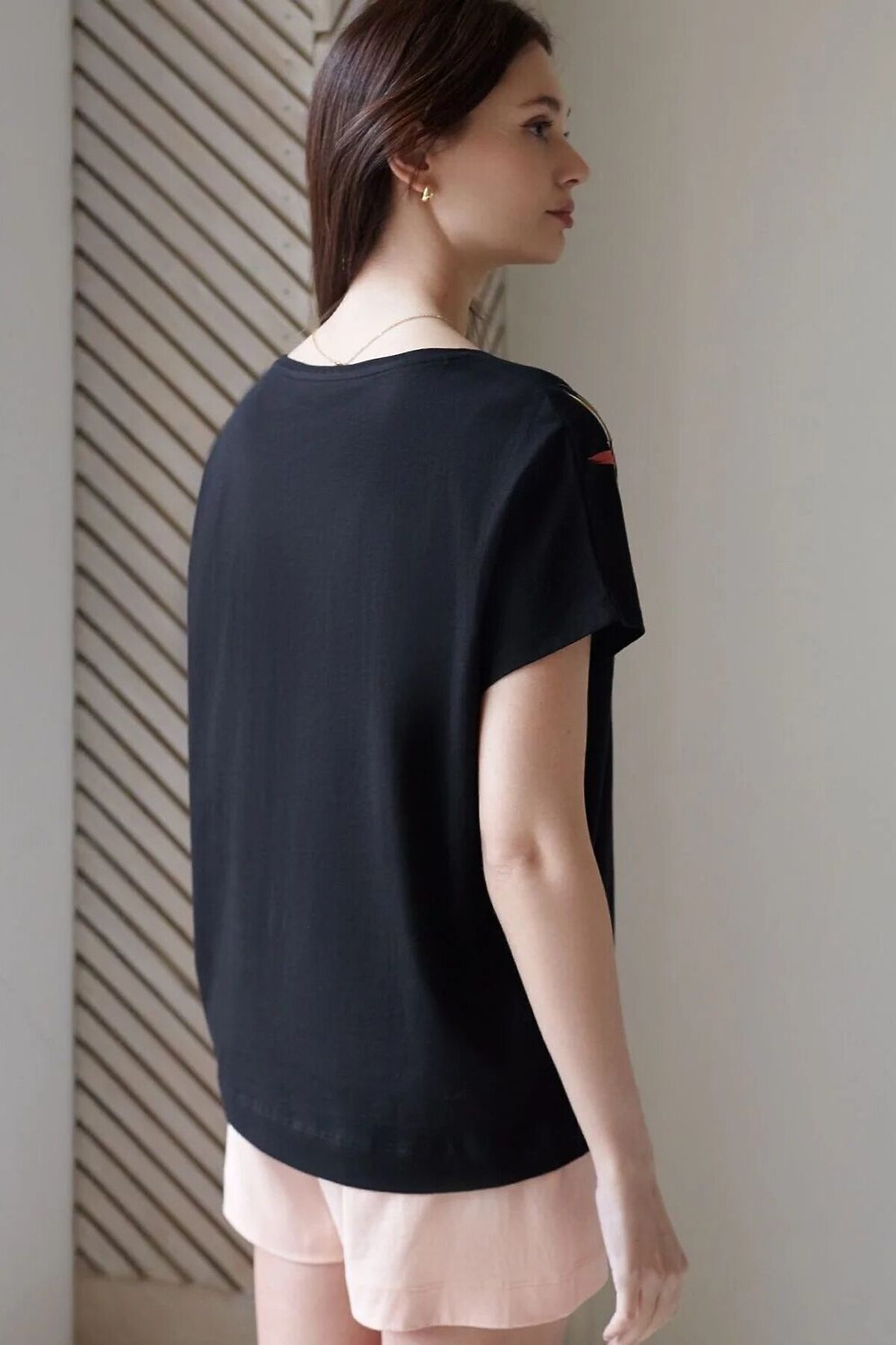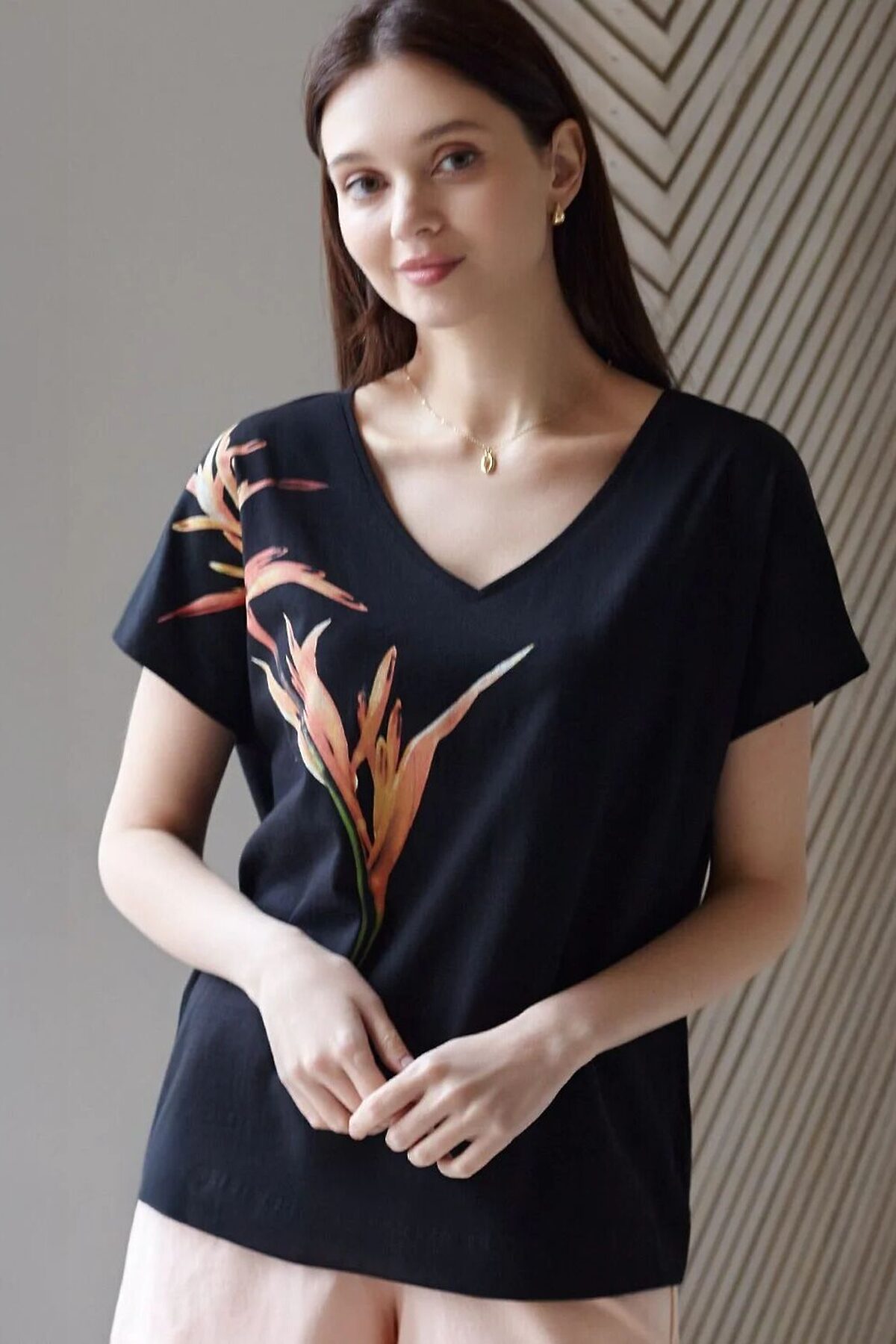 Свободная футболка черного цвета с V-вырезом и цельнокроеным рукавом из натурального 100% хлопка создает красивый и легкий образ для дома и отдыха. Дышащая ткань бережно заботится о коже, в то время как декольте с V-вырезом утонченно подчеркивает линию шеи, а свободный крой скрывает возможные недостатки фигуры. Такая футболка отлично подойдет для тех, кто ценит комфорт и стиль одновременно. Принт в виде ярких цветов добавляет повседневной футболке оригинальности и актуальности для любой домашней обстановки. Благодаря натуральной хлопковой ткани, она идеально подходит для ежедневного использования, обеспечивая чувство легкости и свободы движений. Легкая структура материала поддерживает оптимальный микроклимат, что важно при длительном использовании. Эта футболка женственно смотрится и дарит ощущение уюта, делая ее необходимым элементом домашнего гардероба. Рекомендуем сочетать с артикулами: D44,160, D44.161, D44.162, D44.163, D44.161, D48.011, D48.012, D46.058