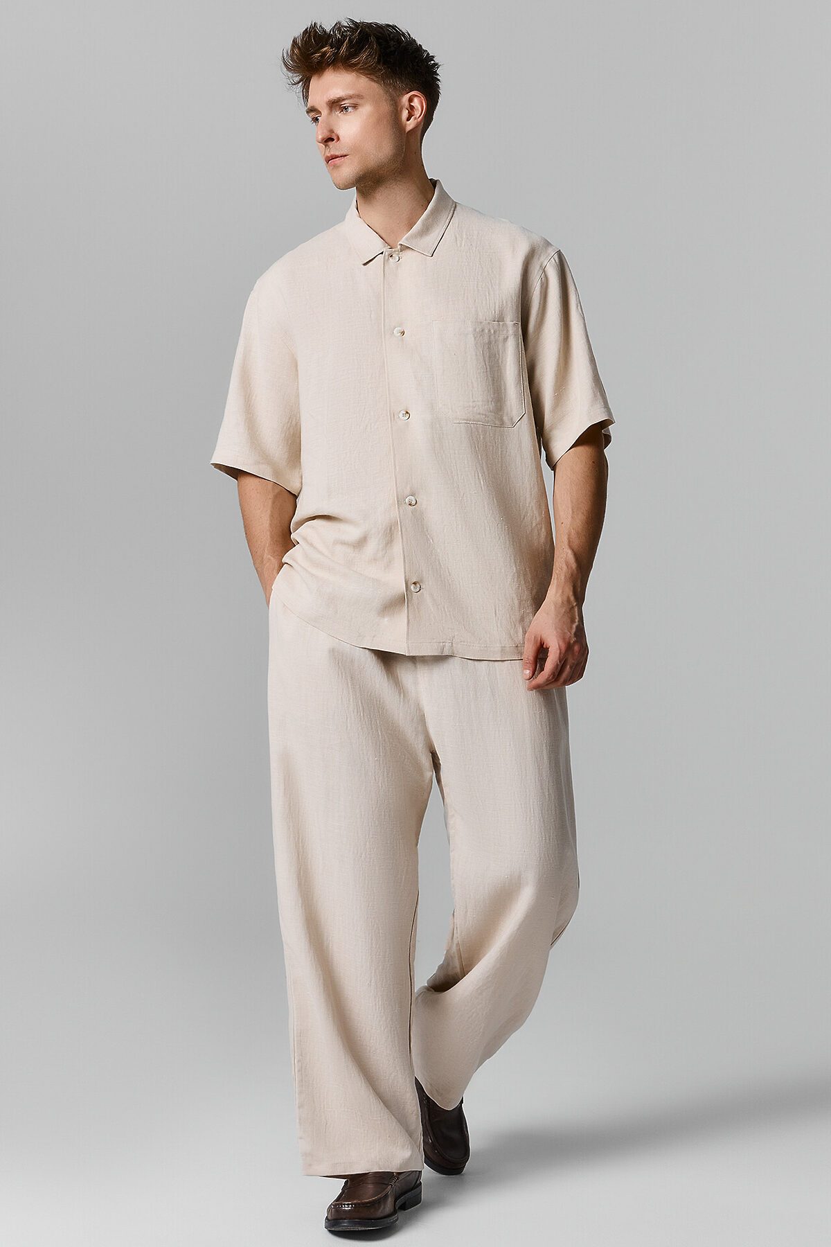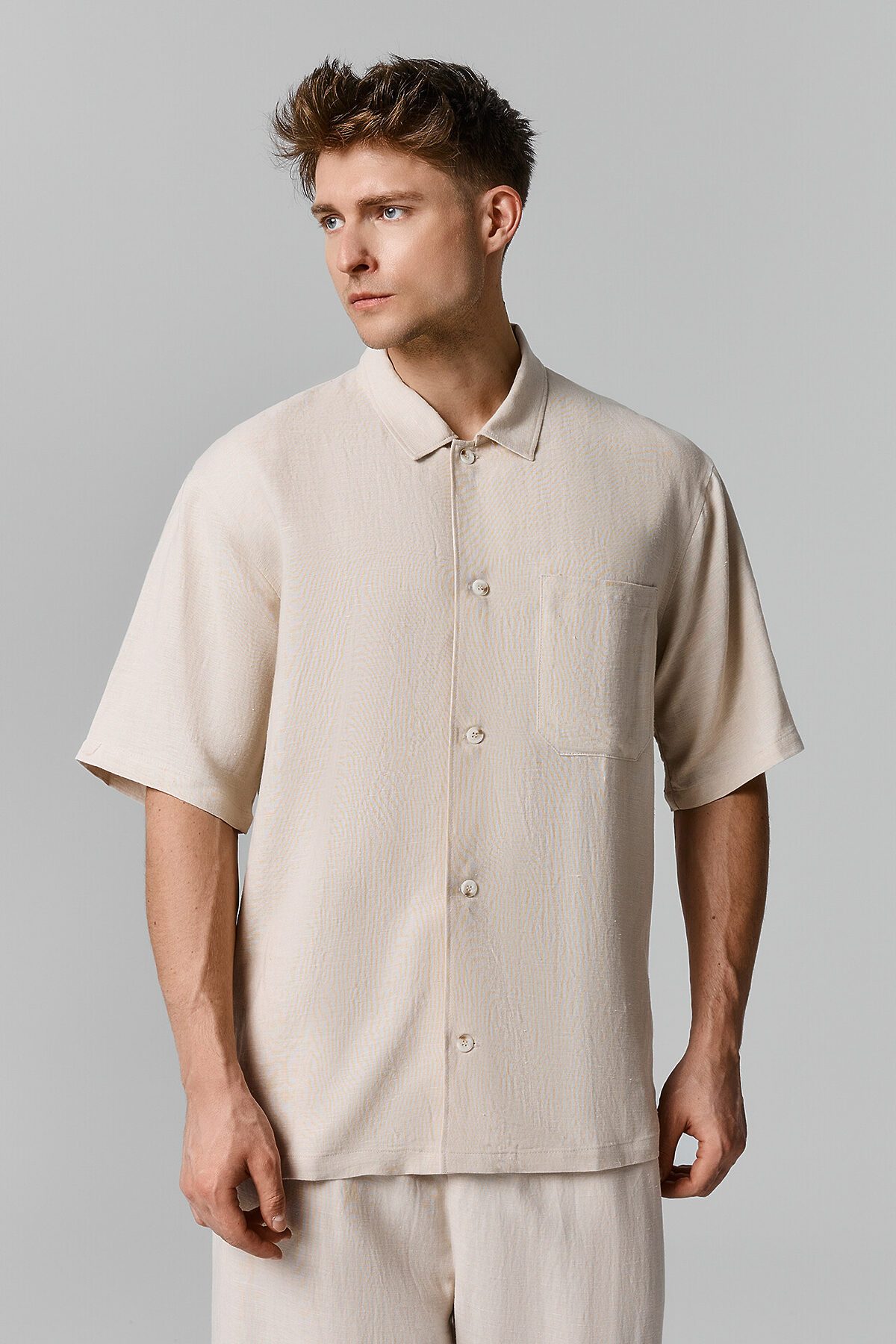 Стильная мужская рубашка с короткими рукавами сочетает в себе легкость льна и мягкость хлопка, что делает ее идеальной для жаркого лета. Спереди расположены застежка на петли и пуговицы, а воротник-стойка и горизонтальная двойная кокетка на спинке придают модели элегантный и современный вид. Эту рубашку можно носить как самостоятельный предмет гардероба или поверх футболок и маек, создавая разнообразные образы. Широкий размерный ряд позволяет подобрать идеальный вариант для любого мужчины. Рекомендуем для лаконичных городских образов, обеспечивая комфорт и стиль в любое время дня.