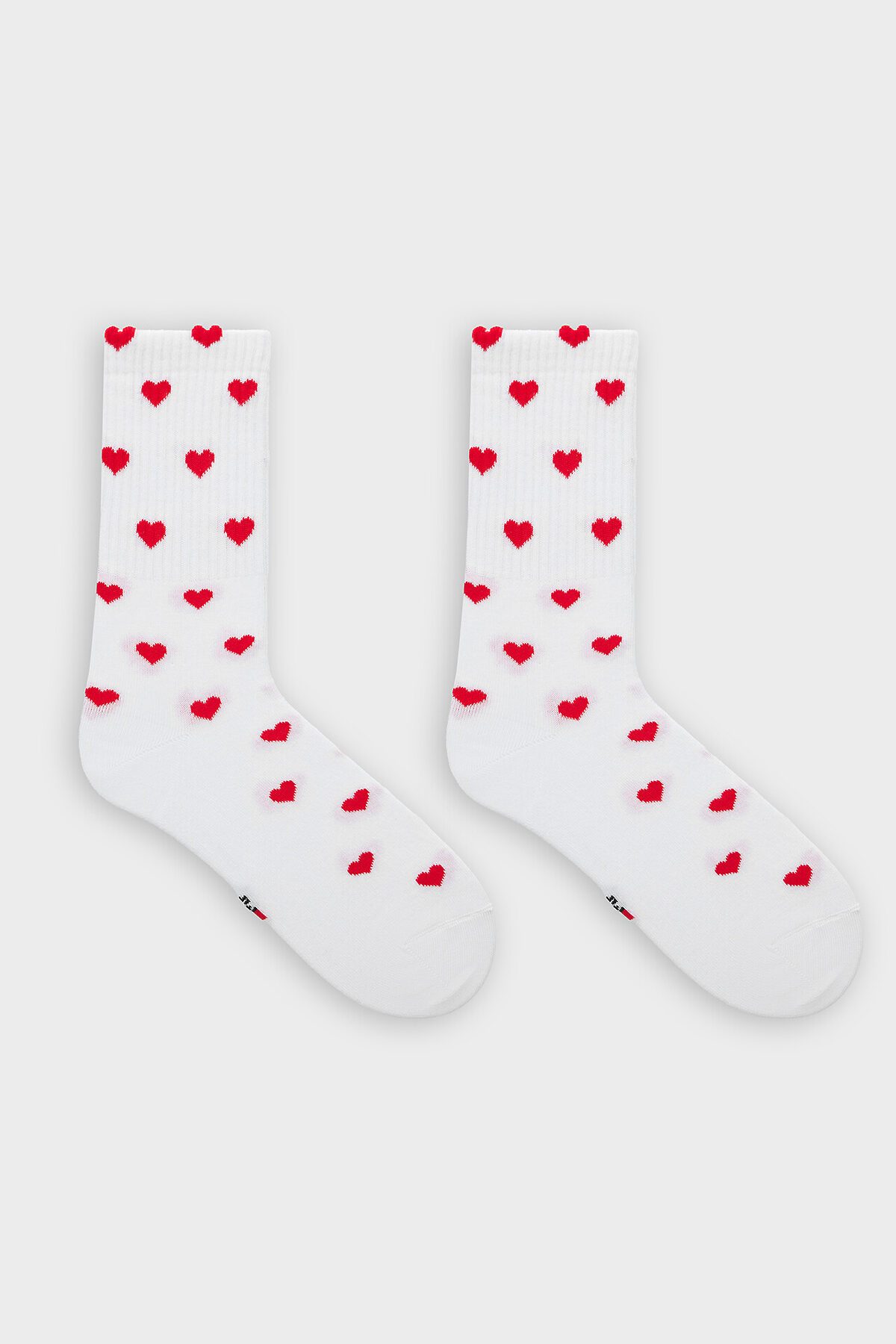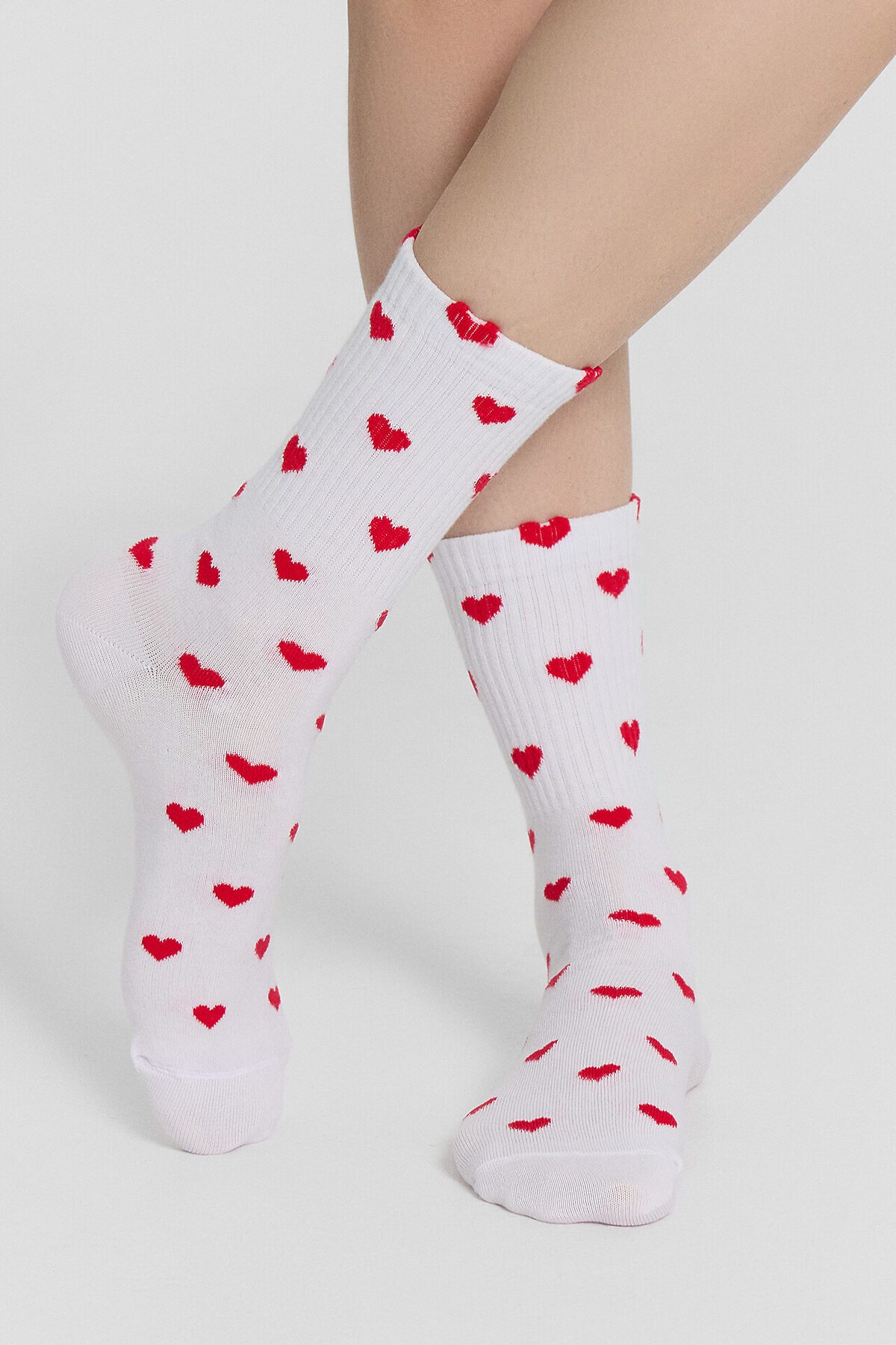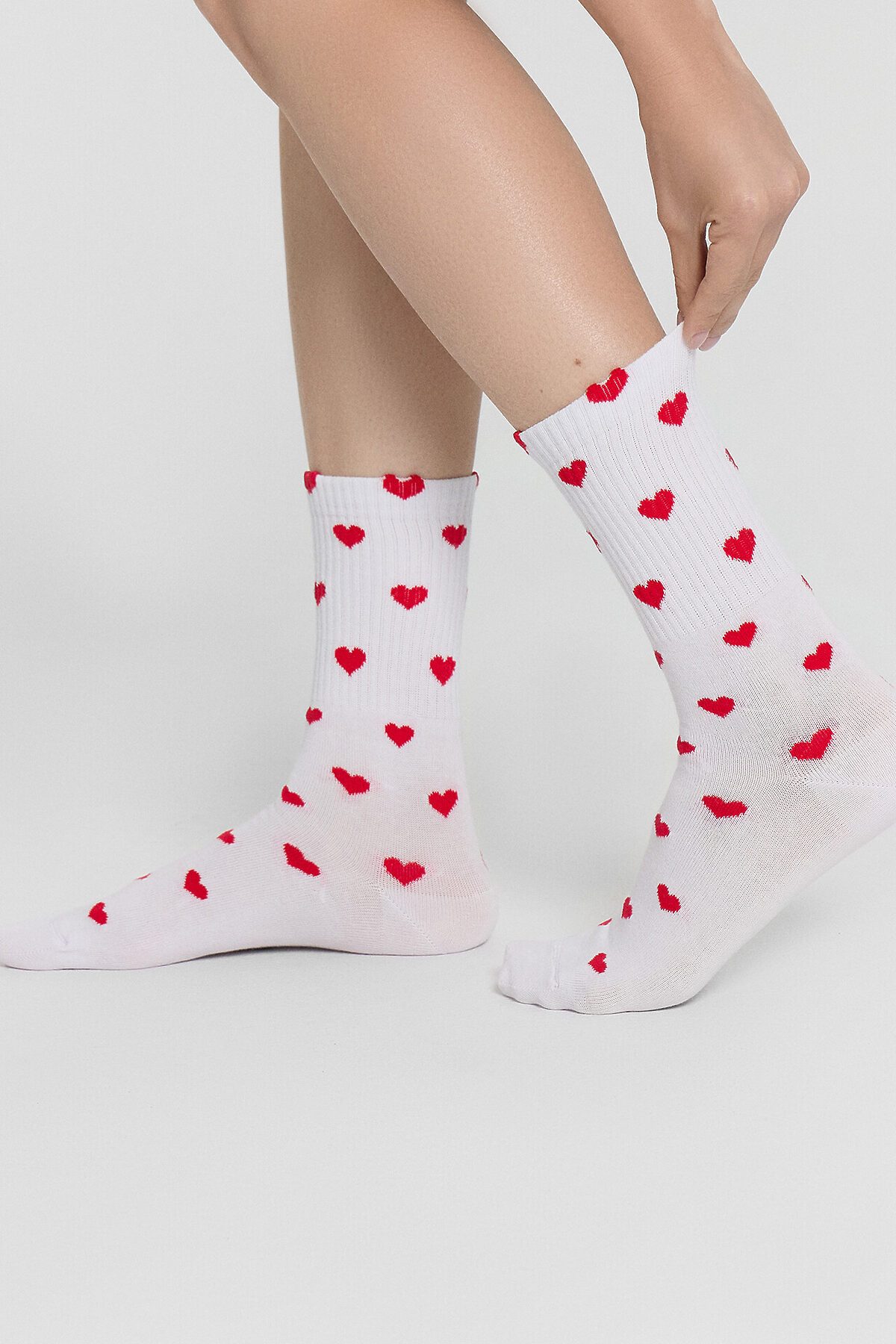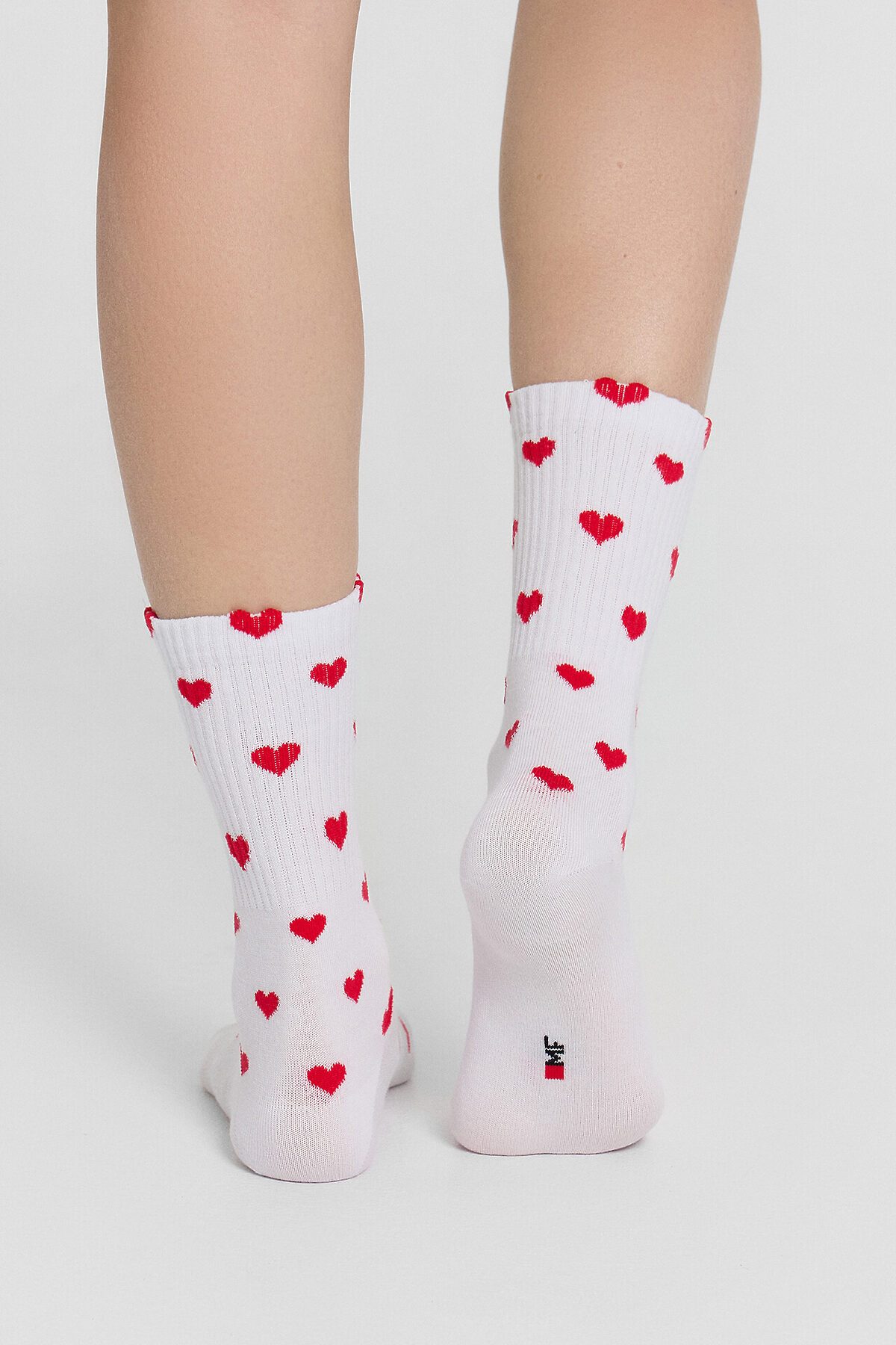 Женские носки с сердечками — это нежный аксессуар, который превратит обычный день в романтический момент. Носки украшены очаровательным принтом в виде сердечек, нанесенным по всей поверхности, что добавляет образу игривости и трогательности. Высокий плотный борт мягко облегает щиколотку, не сползая и не оставляя следов.
