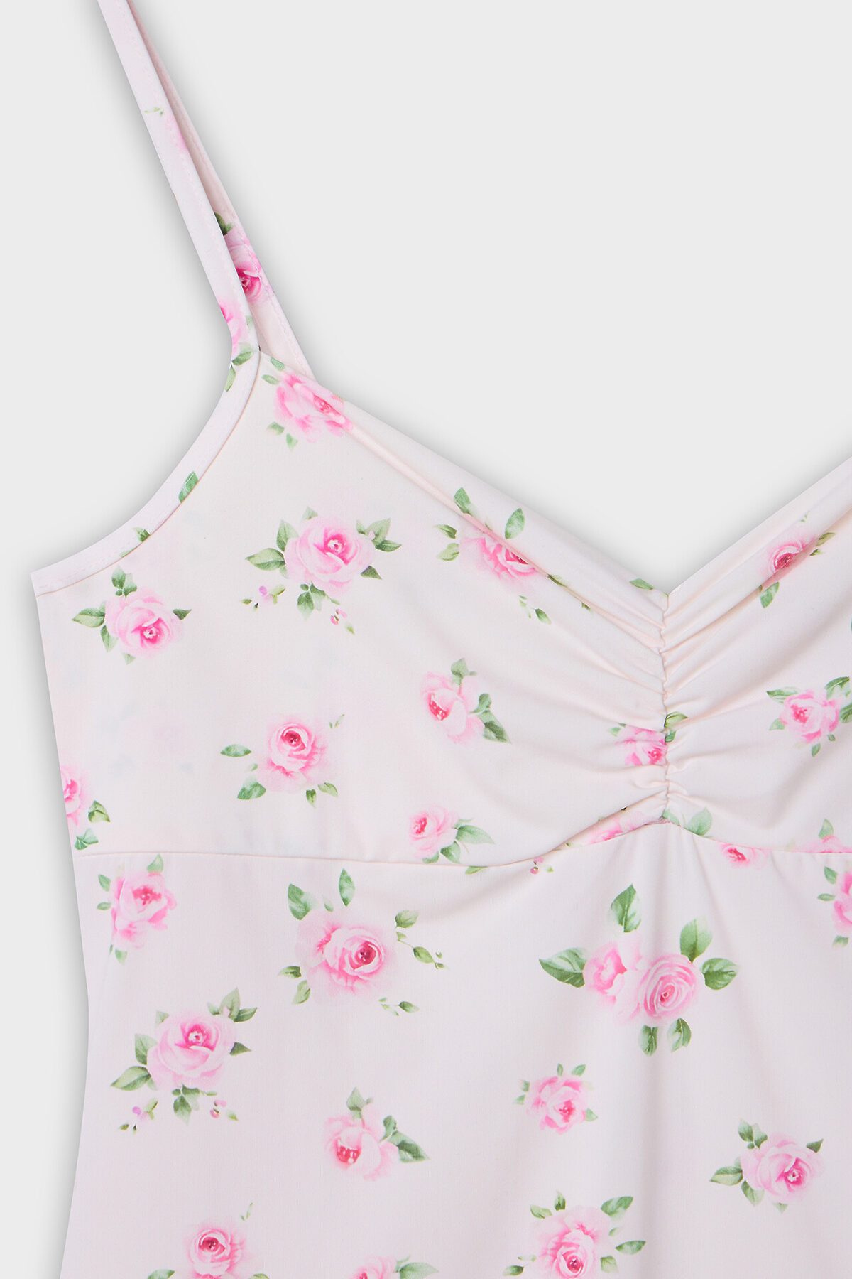 Сорочка полуприлегающего силуэта, короткая на бретелях. Горловина V-образной формы. Горловина спинки и проймы окантованы бейкой из основного полотна, с эластичной тесьмой внутри (жилка тканая 6мм WT4-6). Бейки по проймам переходят в бретель. На детали переда подрез под грудью. Лиф двойной со средним швом и сборкой на эластичную тесьму (жилка тканая 6мм WT4-6). Нижний срез сорочки обработан швом вподгибку.