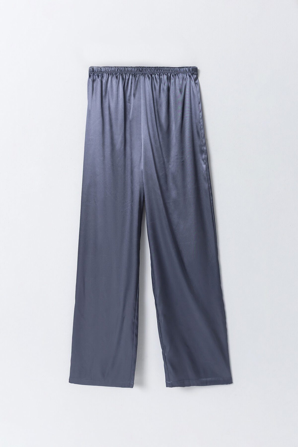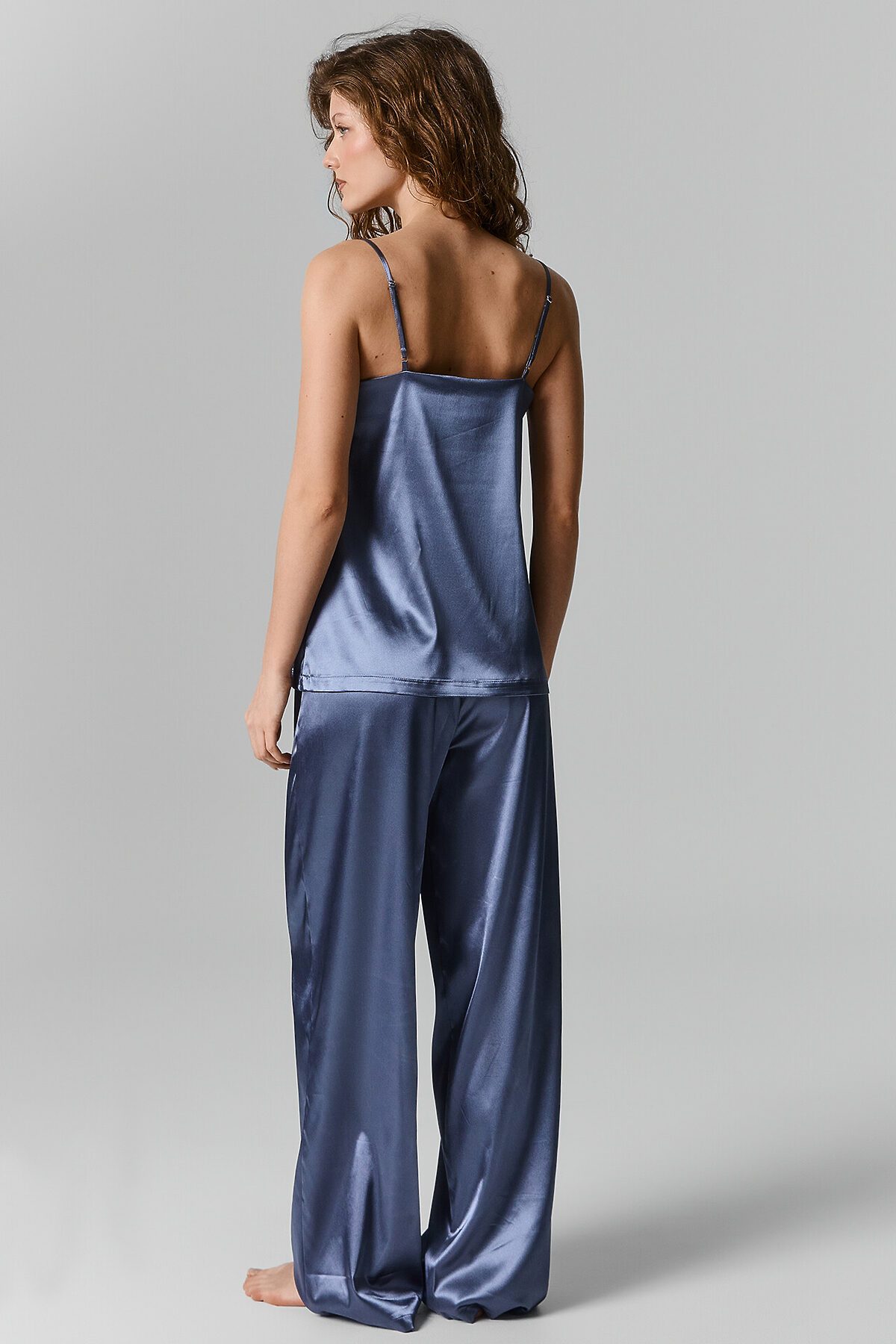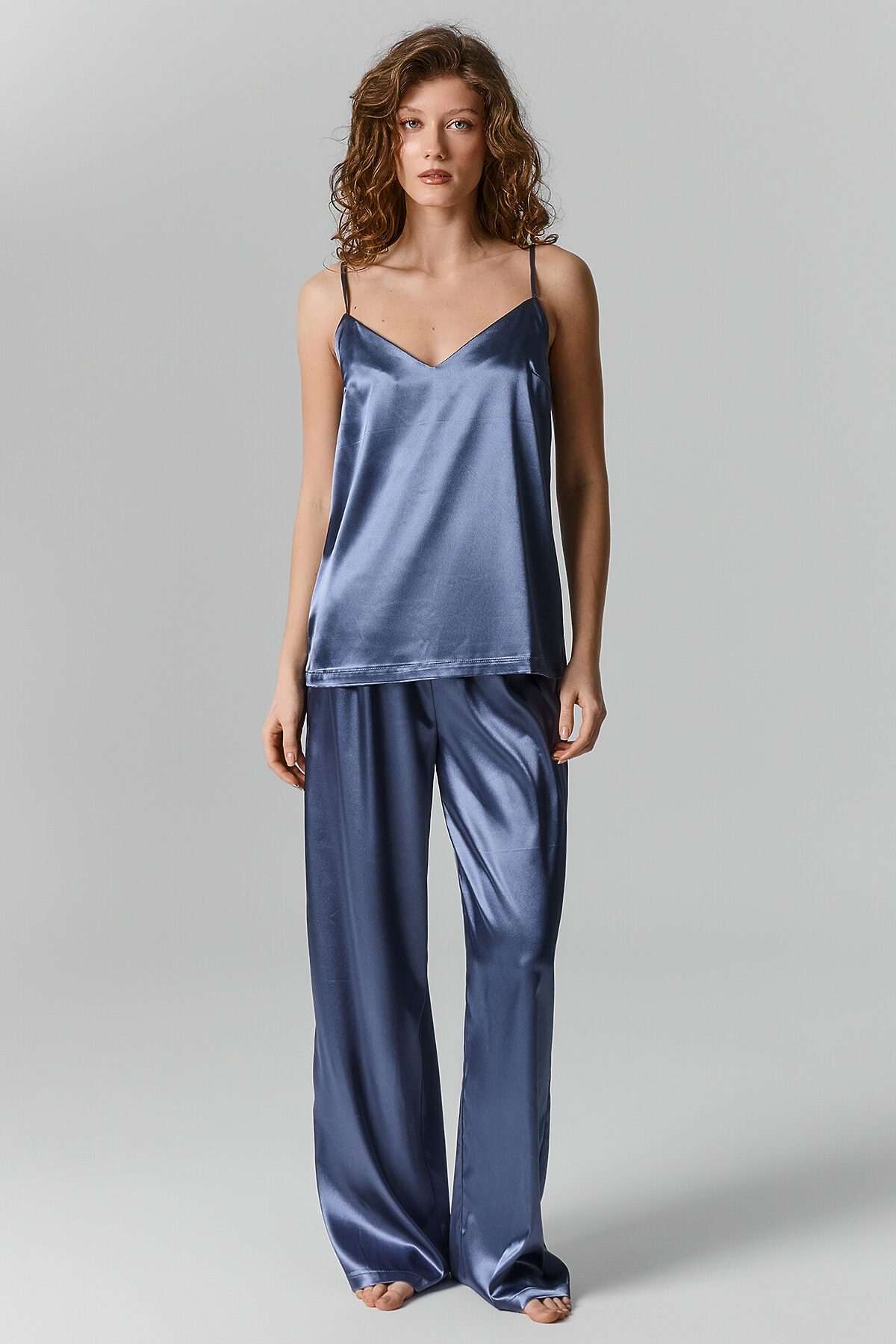 Комплект женский состоит из блузы и брюк. Блуза прямого силуэта удлиненная, на тонких бретелях. Горловина V-образной формы. Бретели выполнены из основного полотна с регулировкой на регуляторы и кольца (пластик 6мм). Горловина и проймы обработаны обтачкой. На передней детали застрочены вытачки. Нижний срез обработан швом вподгибку с закрытым срезом. Брюки прямые свободные, посадка средняя. Пояс цельнокроеный с эластичной тесьмой внутри (внутр. 20мм 20RV). Брюки с боковыми швами. Нижний срез обработан швом вподгибку с закрытым срезом.