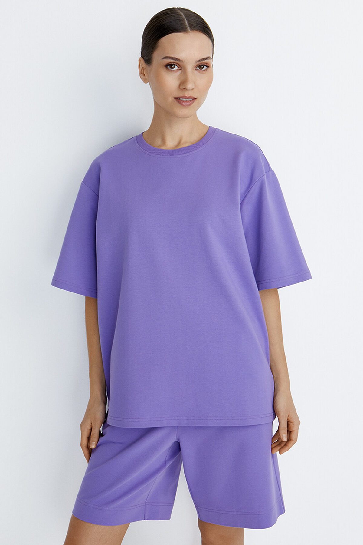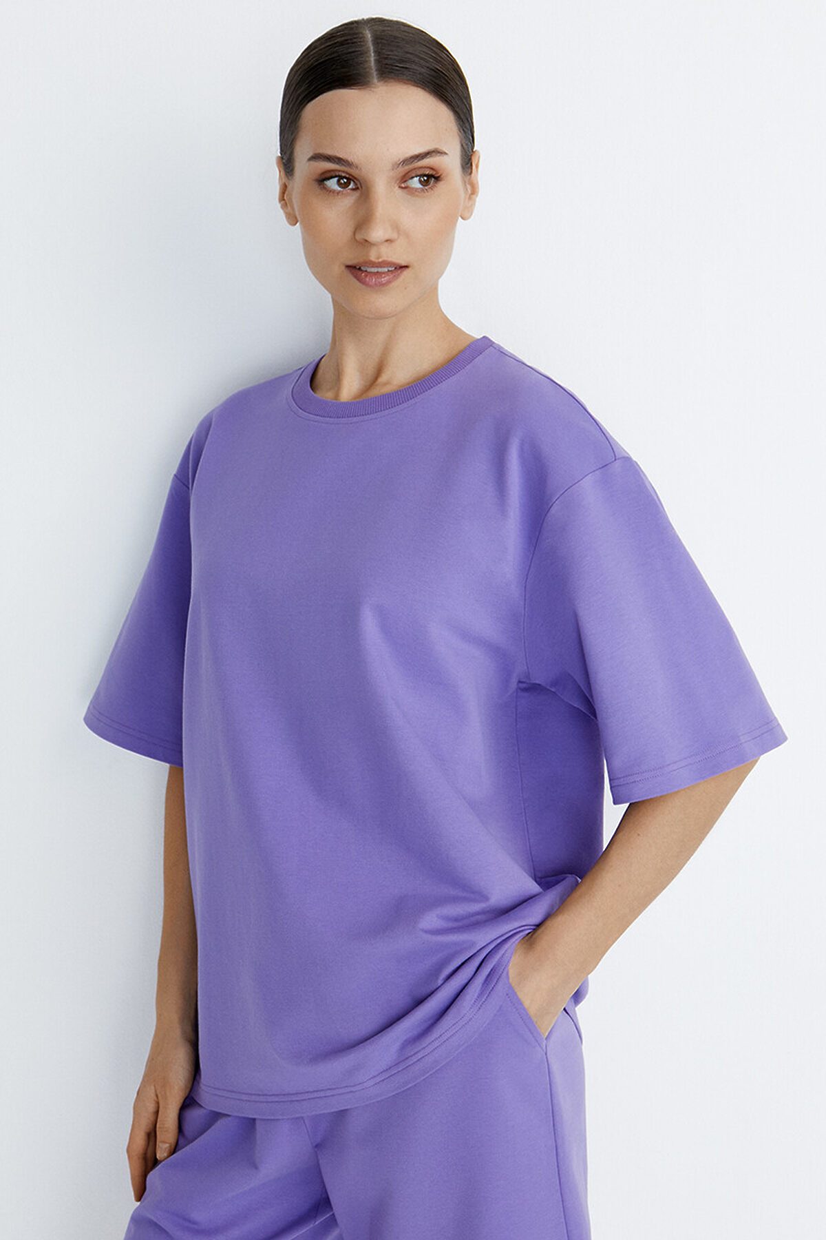 Женская футболка OVERSIZE с коротким спущенным рукавом и круглым вырезом. Горловина обработана обтачкой из трикотажного материала кашкорсе. Выполнена из высококачественного двухниточного футера. В составе трикотажного материала мягкий хлопок, который отлично пропускает воздух, приятно ощущается на теле и подходит для нежной и чувствительной кожи. Добавление эластана обеспечивает сохранение формы. Стильная свободная футболка для создания повседневных образов для дома, отдыха и городских выходов.