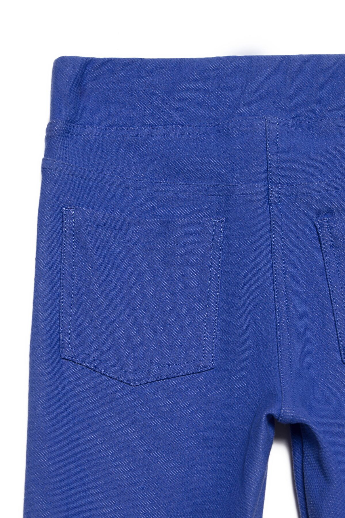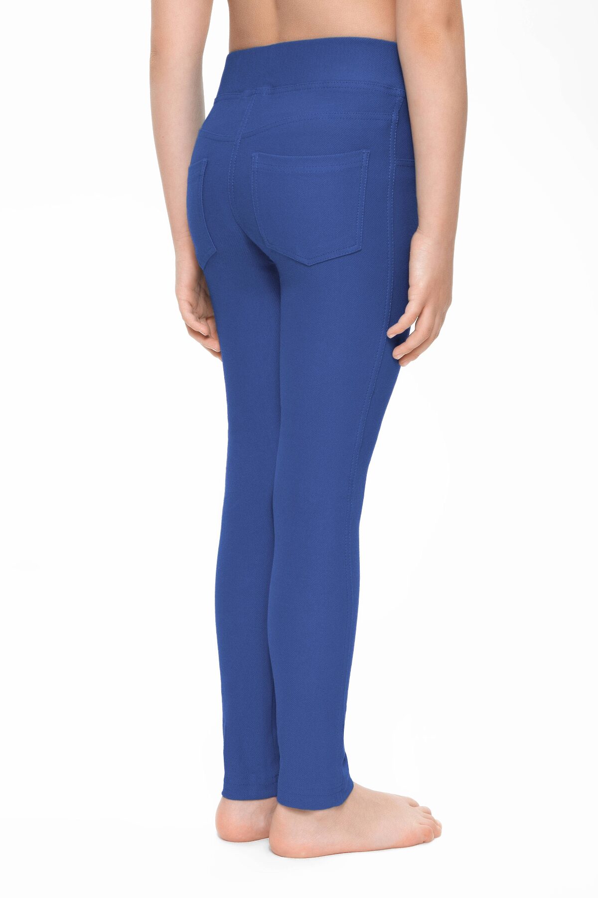 Леггинсы для девочки облегающие из триктажного полотна "джинс" . По переду изделия-имитация гульфика и боковых карманов. По спинке-кокетки и накладные карманы с вышивкой. Верх изделия обработан широким поясом с широкой резинкой внутри.