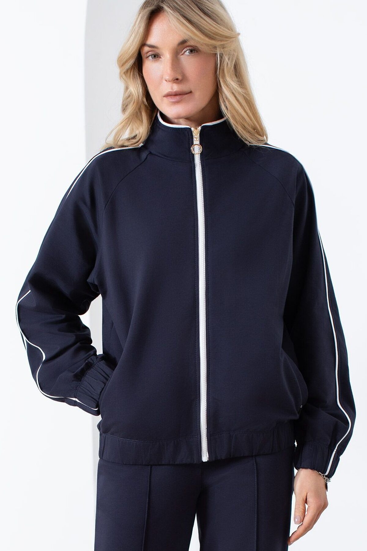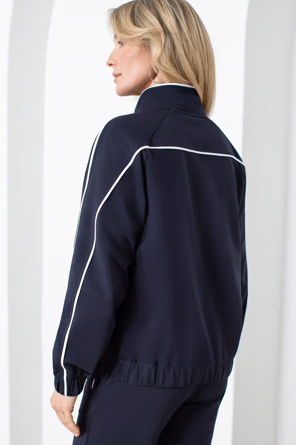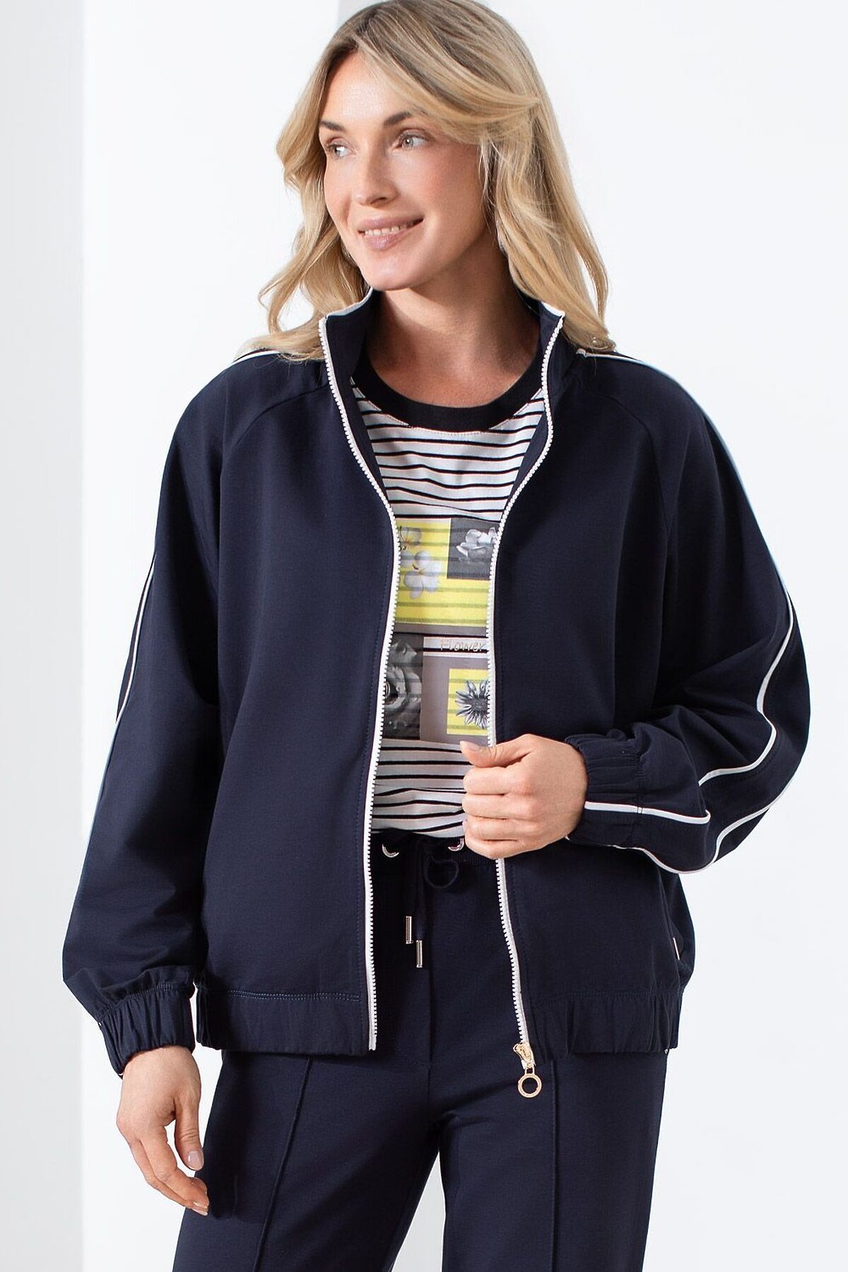Свободный бомбер с лампасами на молнии из петельчатого футера двухнитки с эластаном VILATTE, т.синий