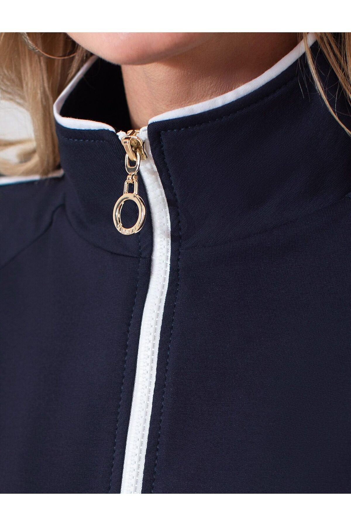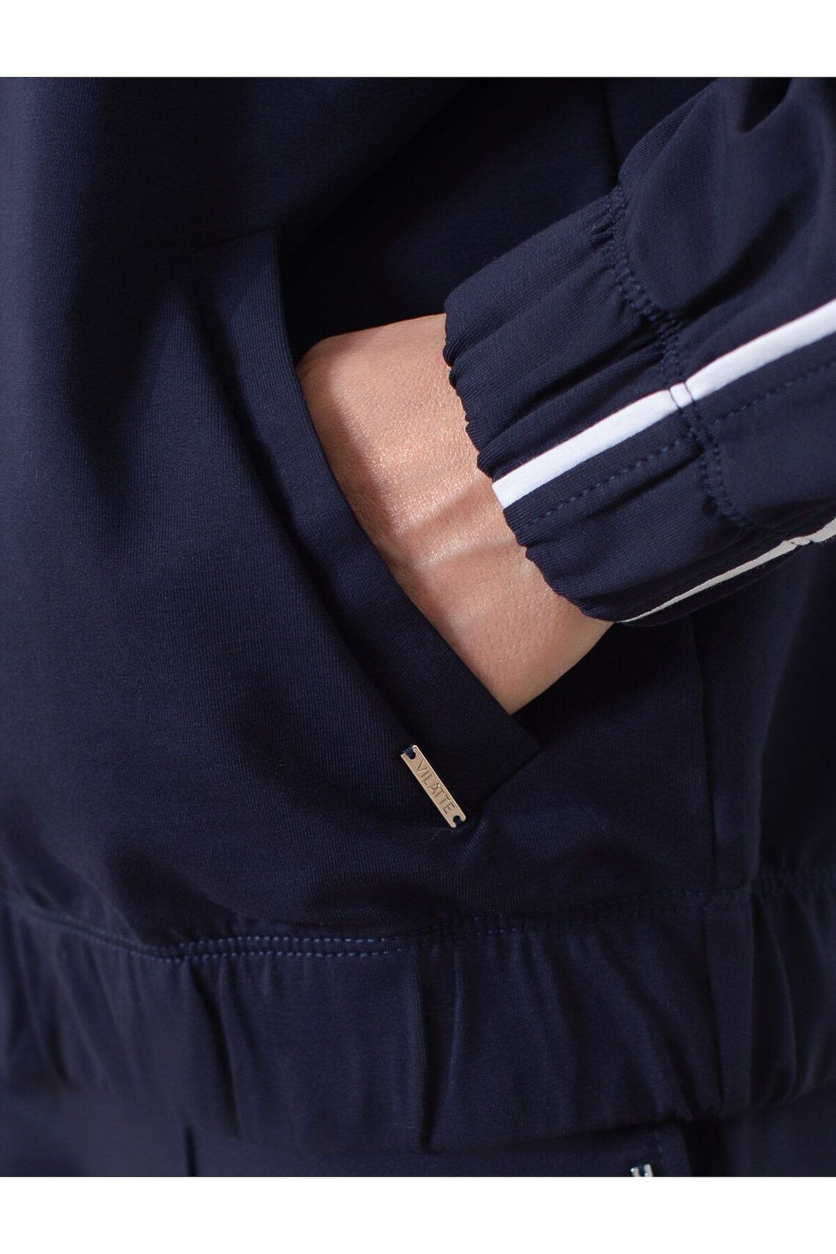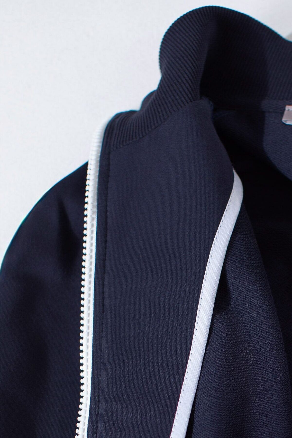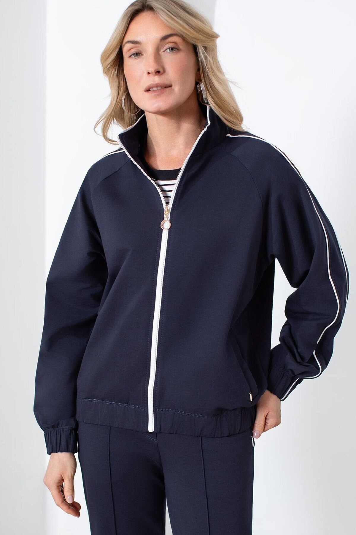 Свободный бомбер с лампасами на молнии из петельчатого футера двухнитки с эластаном VILATTE, т.синий