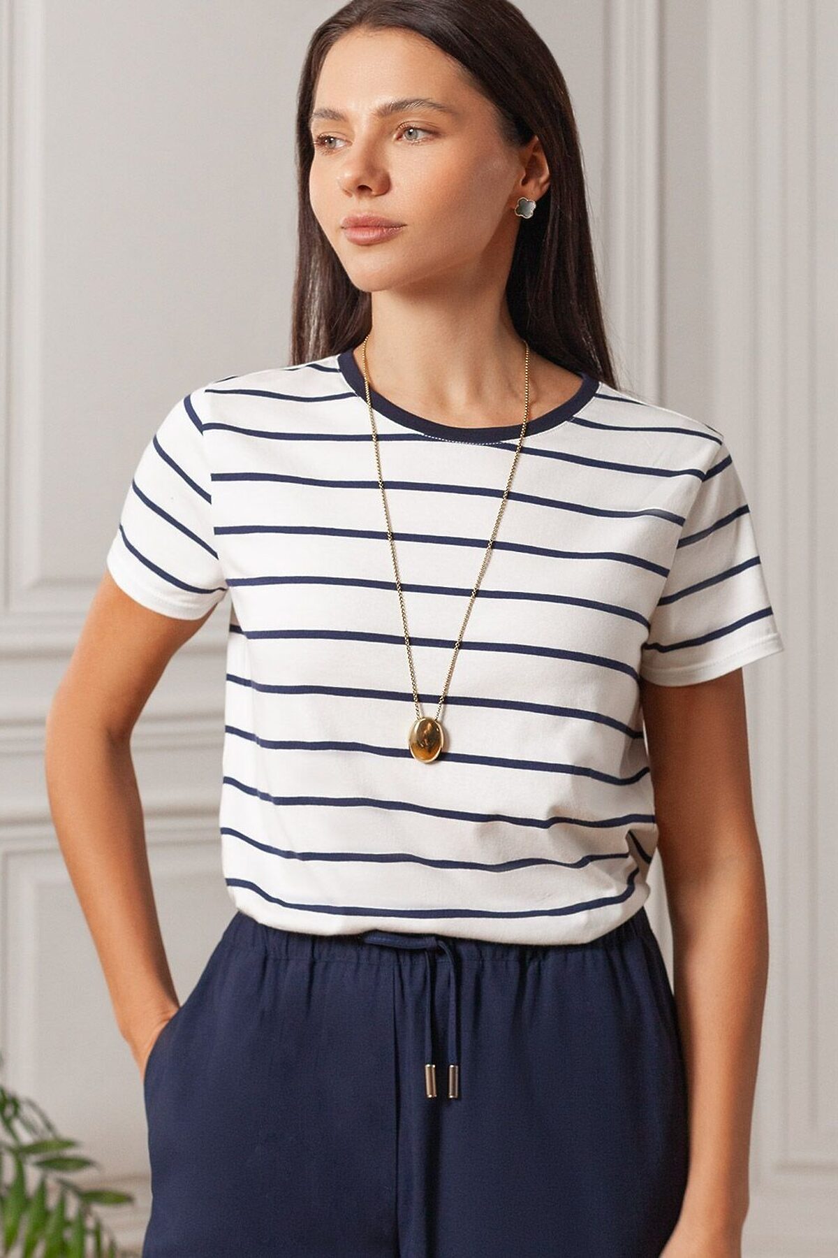 Стильная и модная женская футболка белого цвета в темно-синюю полоску станет отличным дополнением к вашему гардеробу. Футболка плотностью 170 Г/м2 изготовлена из премиального хлопка с добавлением эластана. Добавление эластана в состав изделия способствует формоустойчивости. Эта классическая футболка подходит для создания кэжуал образа на каждый день и идеально подойдет для работы. Модель не мнется, что делает ее практичным вариантом для активных женщин, которые ценят стиль и удобство. Благодаря современному принту полоска эта футболка легко комбинируется с различными элементами гардероба. Она станет универсальным решением для тех, кто предпочитает комфортный стиль casual. Повседневная футболка подчеркнет вашу индивидуальность и позволит вам выглядеть привлекательно в любой ситуации. Легкость в уходе и высокая износостойкость делают ее незаменимой вещью в вашем гардеробе. Одевайте эту модель как на работу, так и на встречу с друзьями — она всегда будет уместна! Стильная и практичная модель с простым кроем и лаконичным дизайном - идеальный вариант для тех, кто ценит качество, минимализм и классический стиль в одежде.