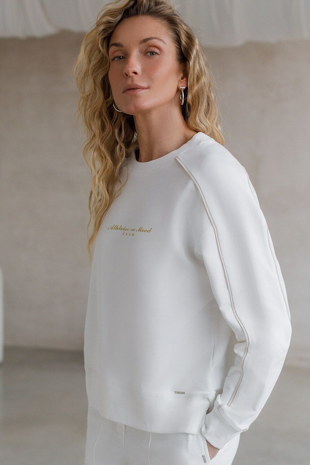 Стильный свитшот белого цвета из премиального футера двухнитки с эластаном сочетает в себе комфорт и оригинальность. Джемпер выполнен из натурального хлопка, который обеспечивает мягкость и дышащие свойства ткани. Нежный материал дарит ощущение уюта в любое время года, а премиальное качество изготовления гарантирует долговечность и сохранение формы после множества стирок. Особенность изделия — спущенная линия плеча и аккуратные разрезы, которые добавляют современный акцент и делают образ более выразительным. Лампасы на рукавах добавляют наряду динамики и выделяют этот свитшот на фоне классических решений. Принт в виде надписи придает индивидуальность, позволяя выделиться без лишней вычурности. Перевод надписи: Athleisure mood Сlub -Клуб спортивного настроения. Дополнен металлическим логотипом бренда. Представлена широкая размерная линейка, включая маленькие и большие размеры, что позволяет подобрать идеальный вариант для разной фигуры и роста. Этот уютный свитшот отлично подходит для повседневной носки благодаря своей комфортной посадке и мягкой текстуре. Он станет универсальным элементом гардероба, легко сочетающимся с различными стилями одежды. Свободный джемпер из футера станет отличным выбором для активного отдыха, обеспечивая стильный внешний вид и удобство в прохладное время года. Рекомендуем сочетать с артикулами: D44.164, D44.166, D49.138, D49.165