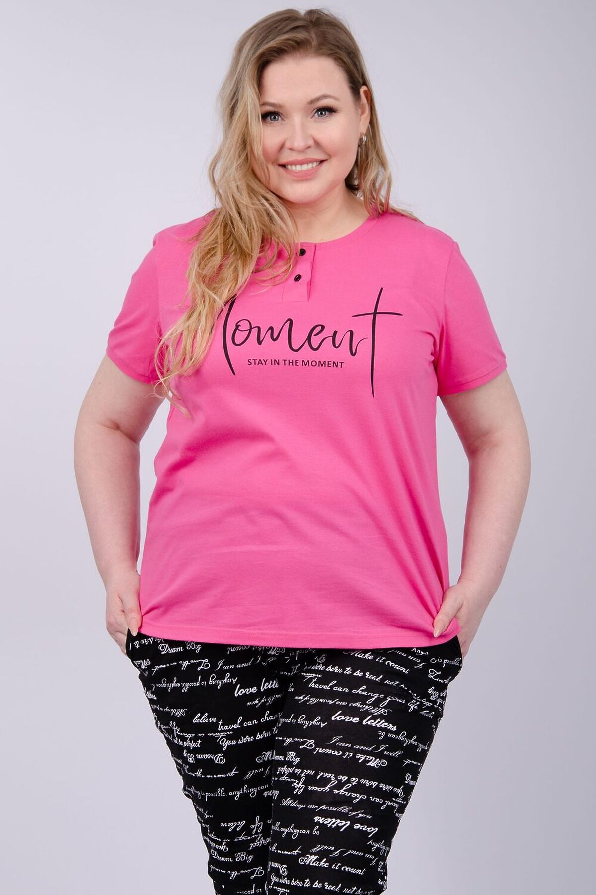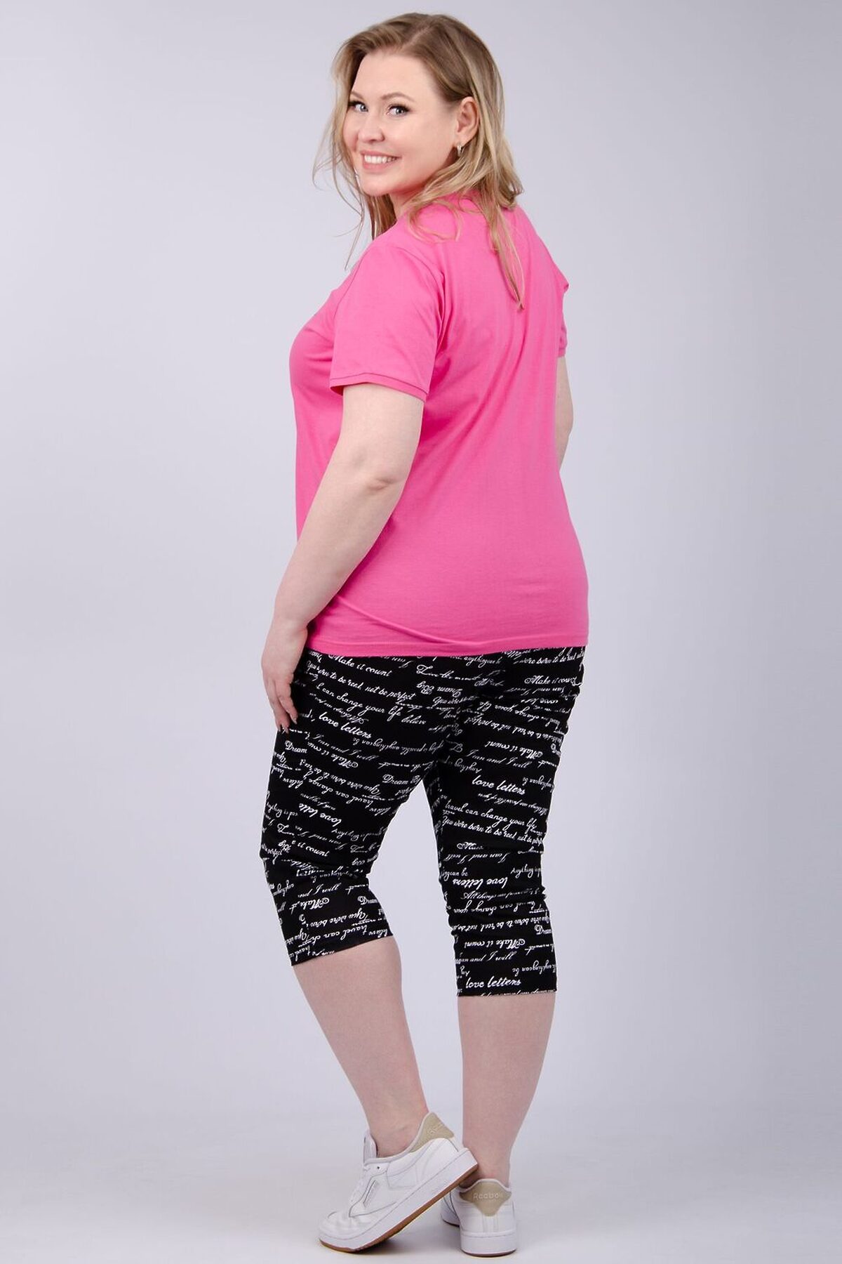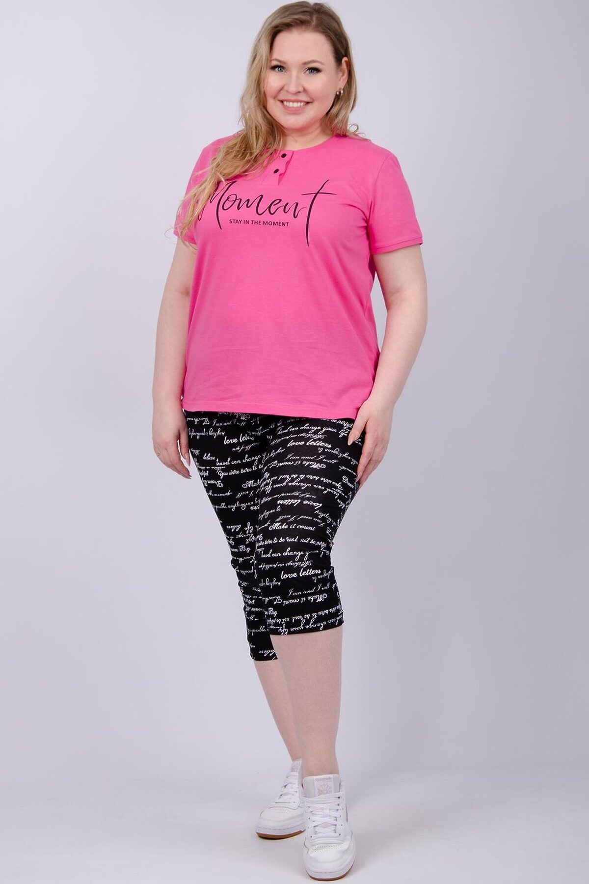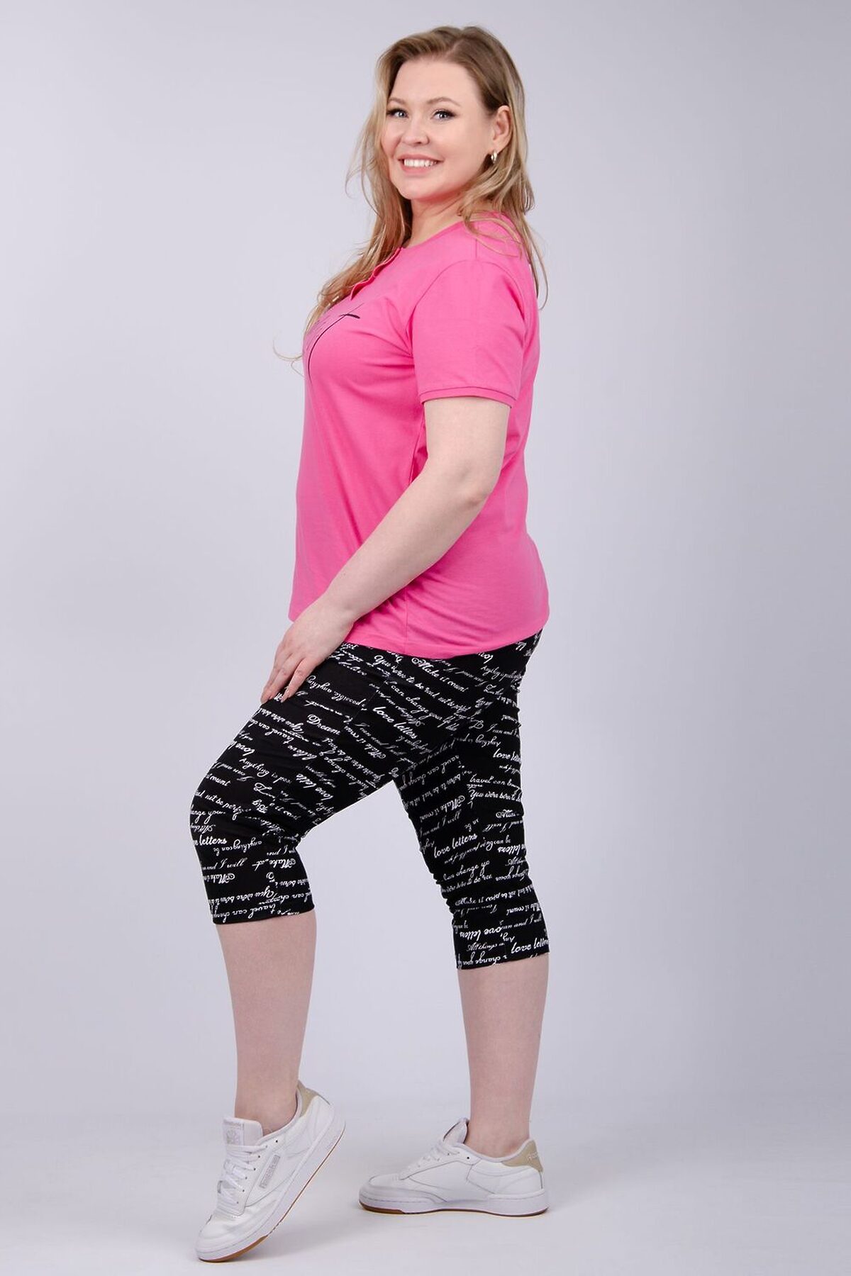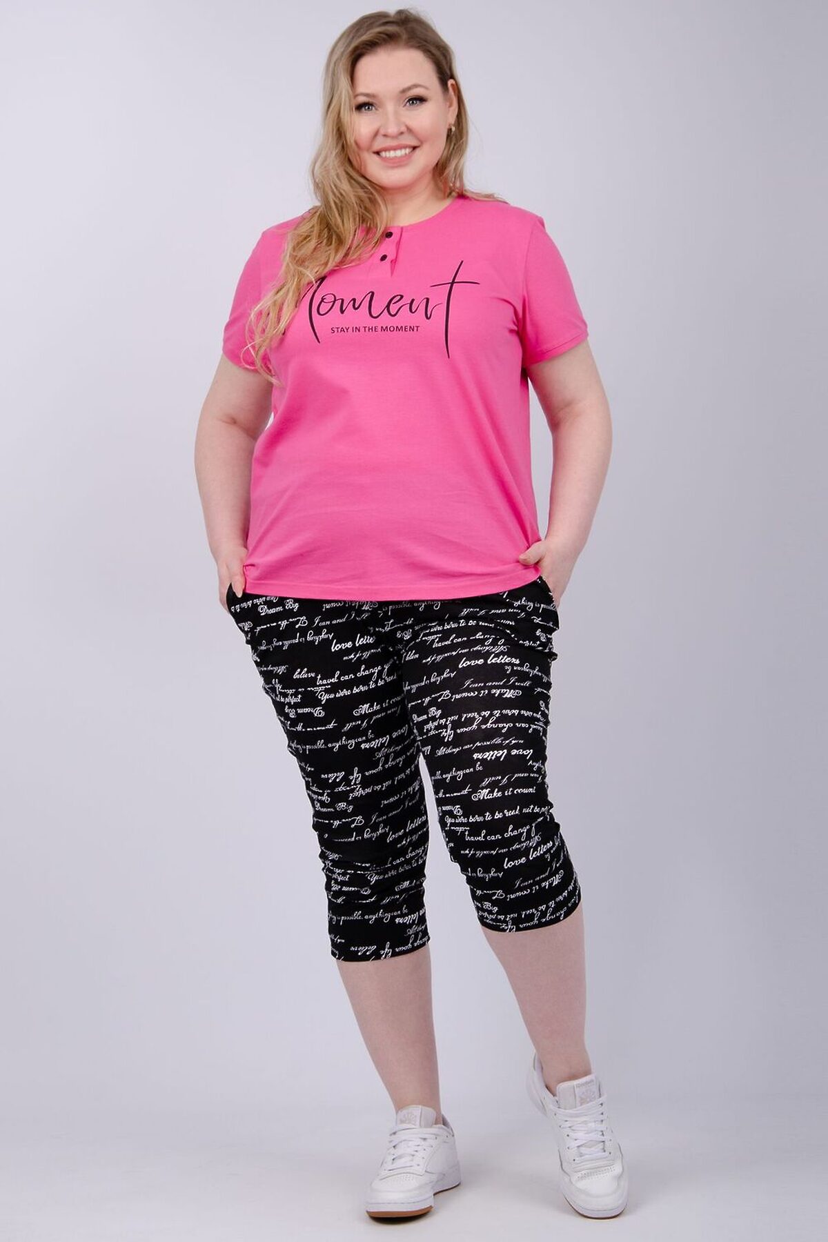 Костюм женский состоит из футболки и бриджей. Футболка с коротким рукавом, бриджи с карманами. На полочке принт.