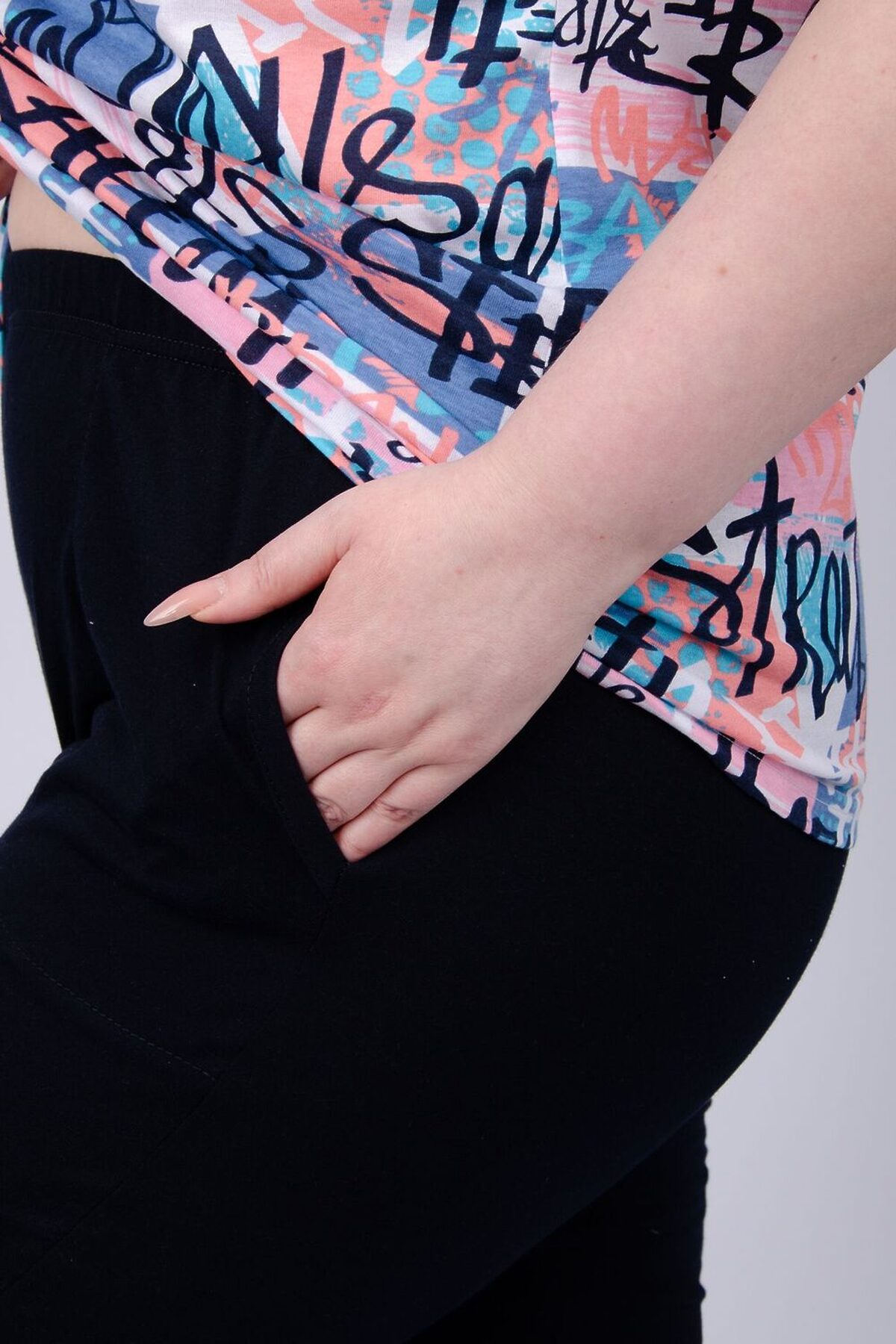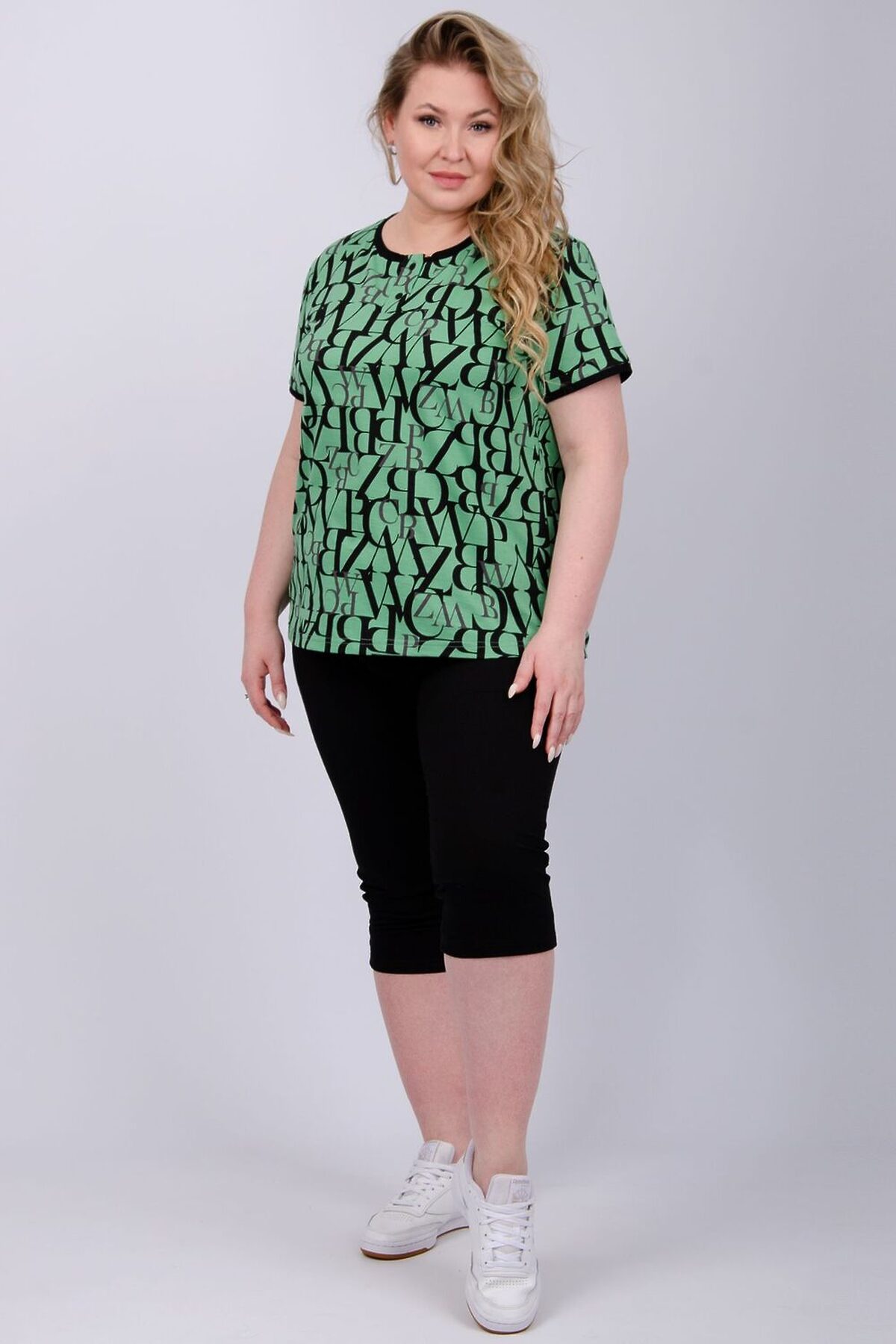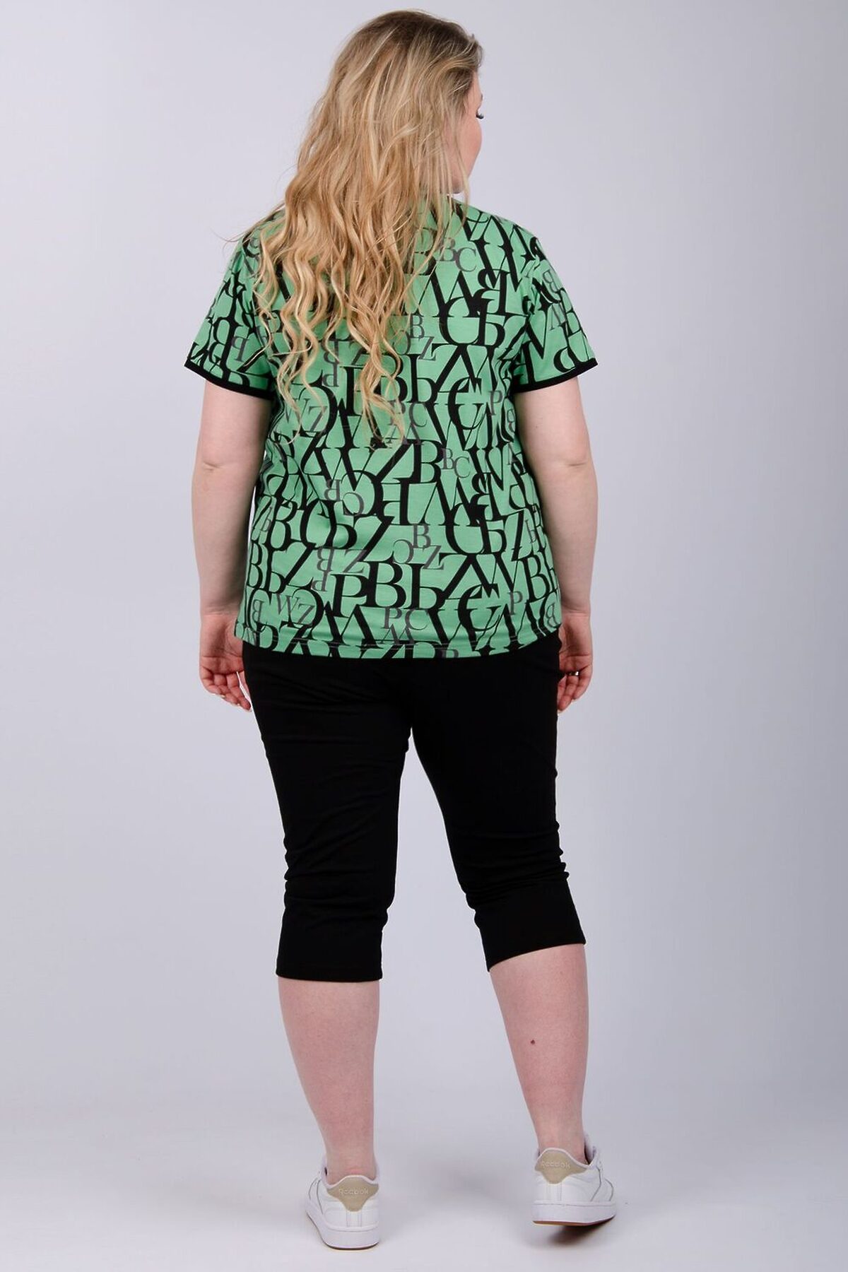 Костюм женский состоит из футболки и бриджей. Футболка с коротким рукавом, бриджи с карманами. На полочке принт.