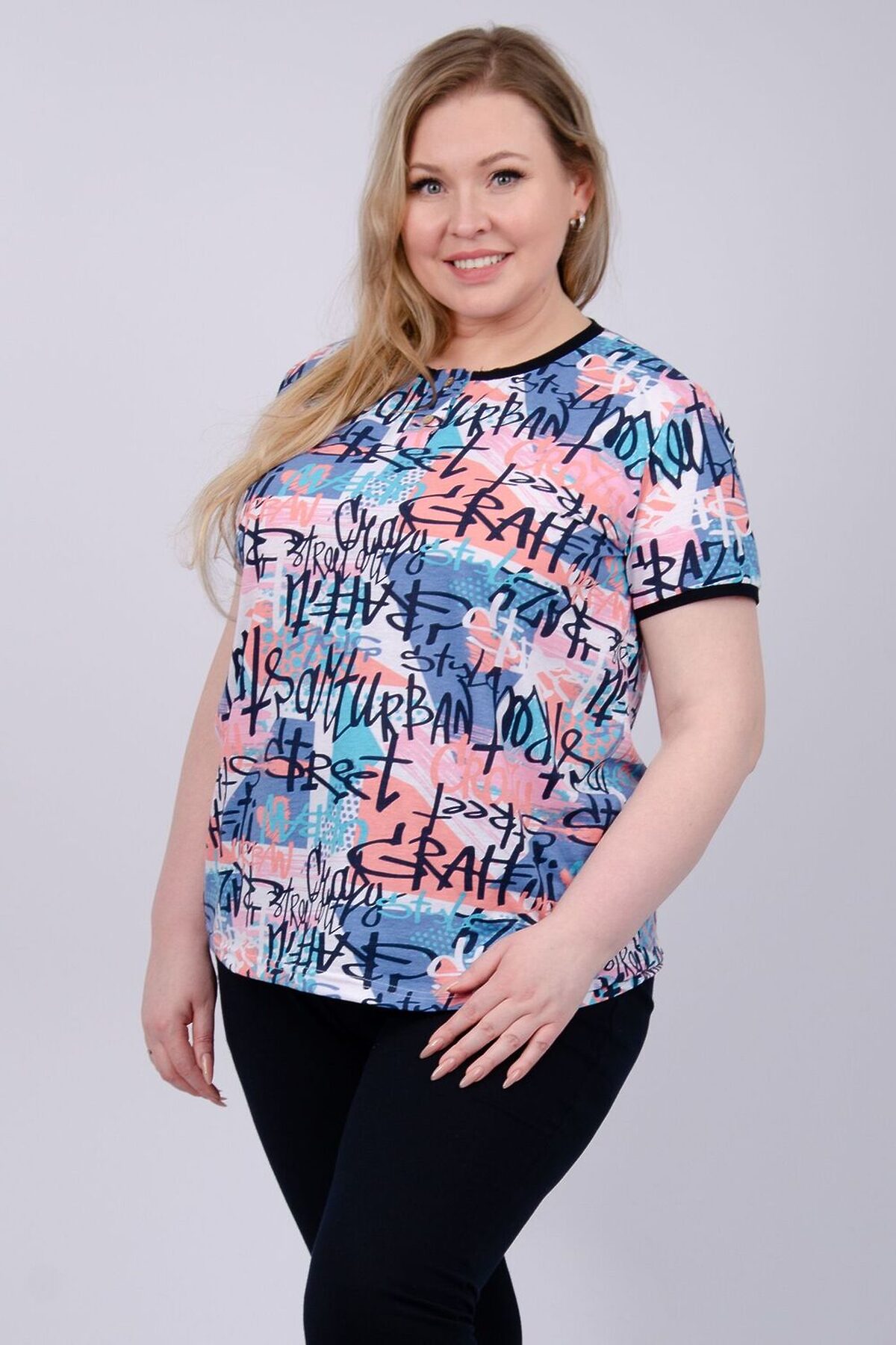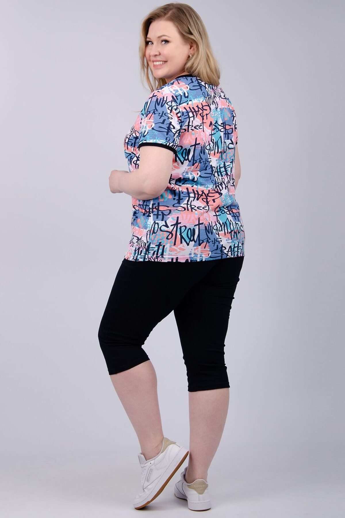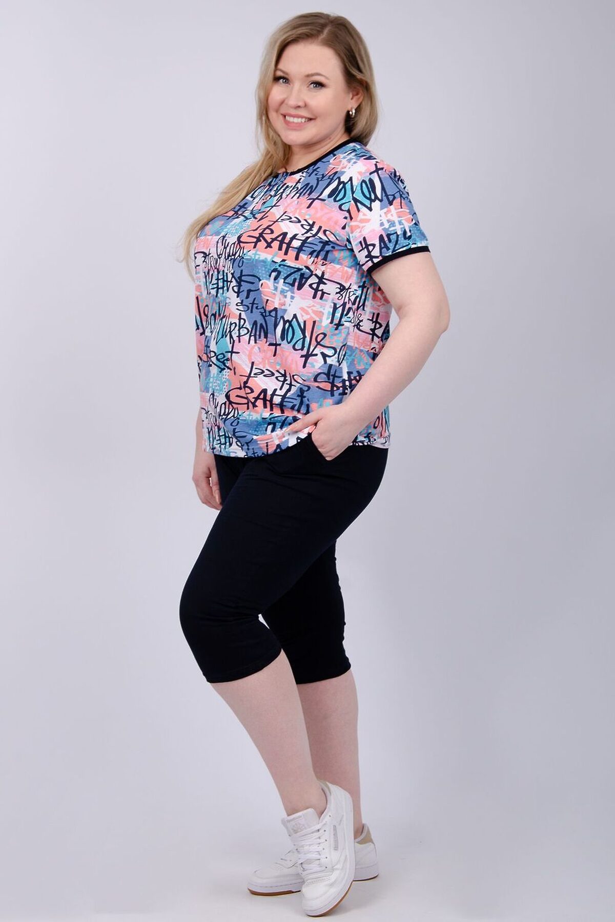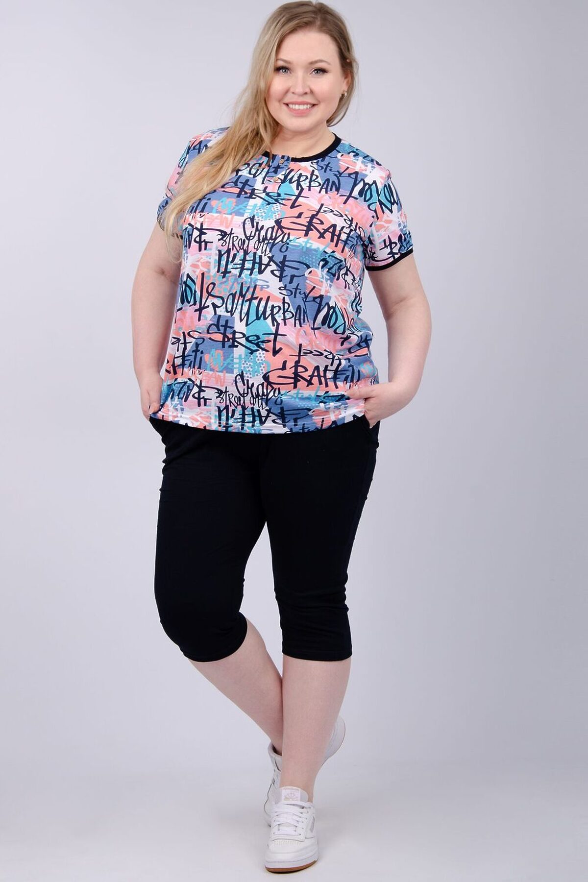 Костюм женский состоит из футболки и бриджей. Футболка с коротким рукавом, бриджи с карманами. На полочке принт.