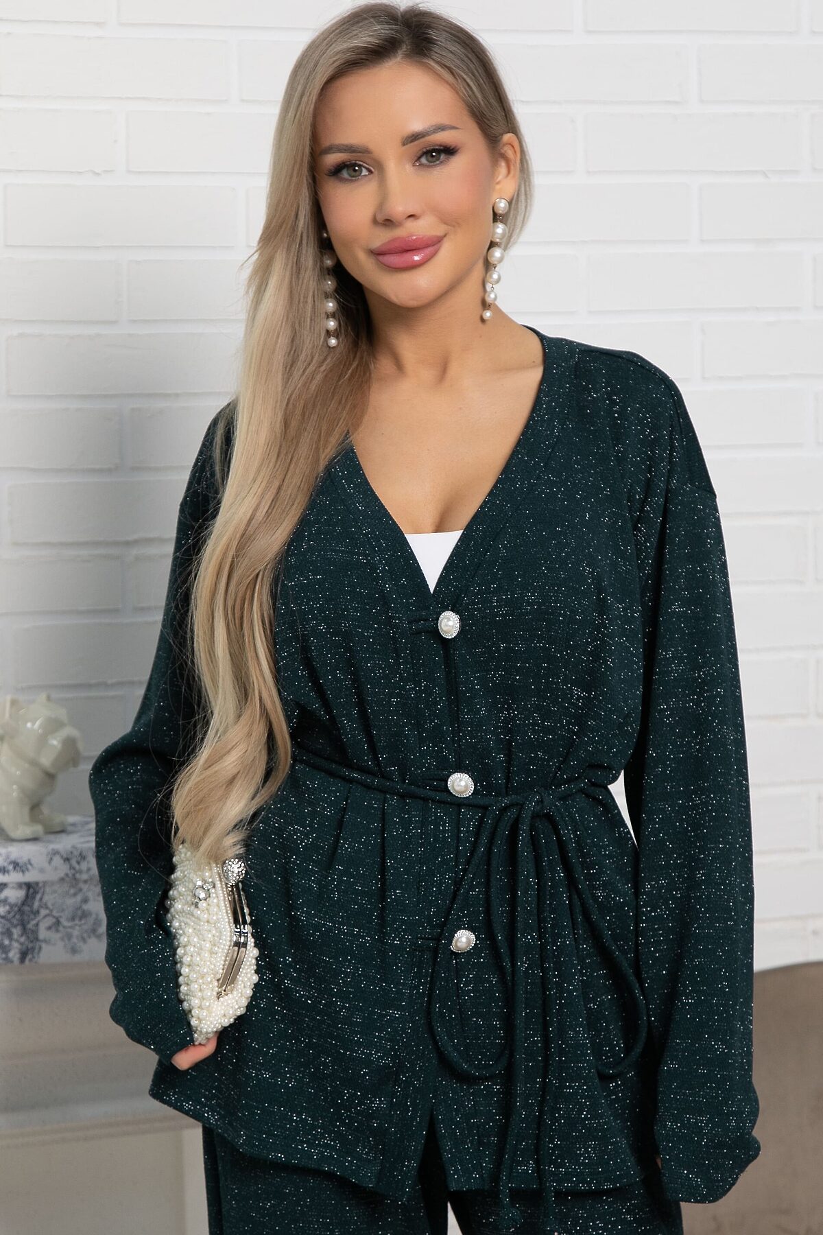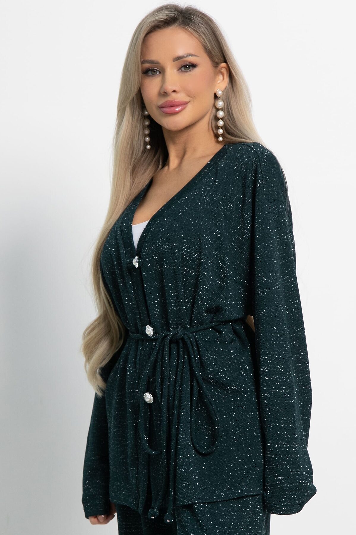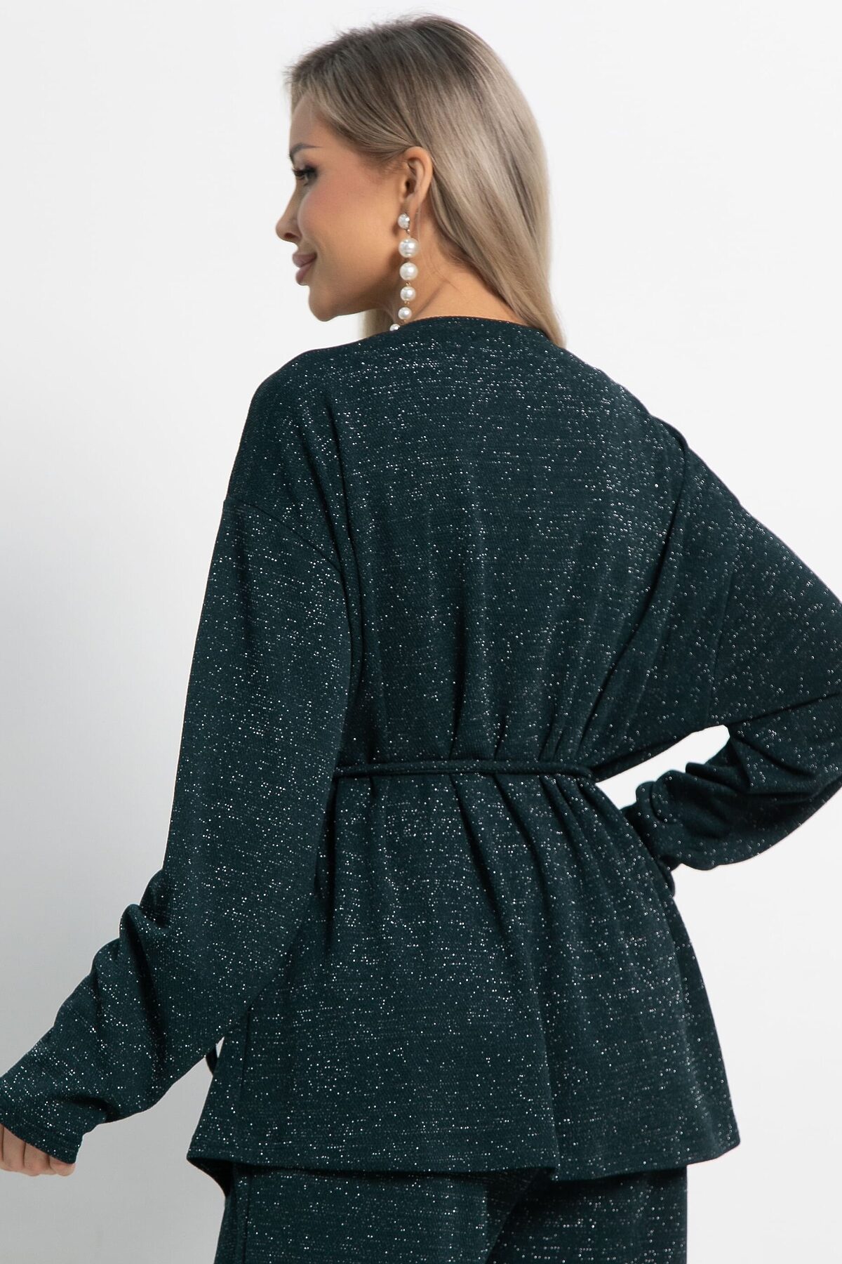 Кардиган свободного силуэта из трикотажного полотна с ниткой люрекс. В комплекте есть съёмный пояс шнур. Центральная застёжка на декоративные пуговицы и воздушные петли. Кардиган можно носить как самостоятельный элемент одежды, либо комплектовать с брюками или юбкой А-силуэта из того же трикотажного полотна.