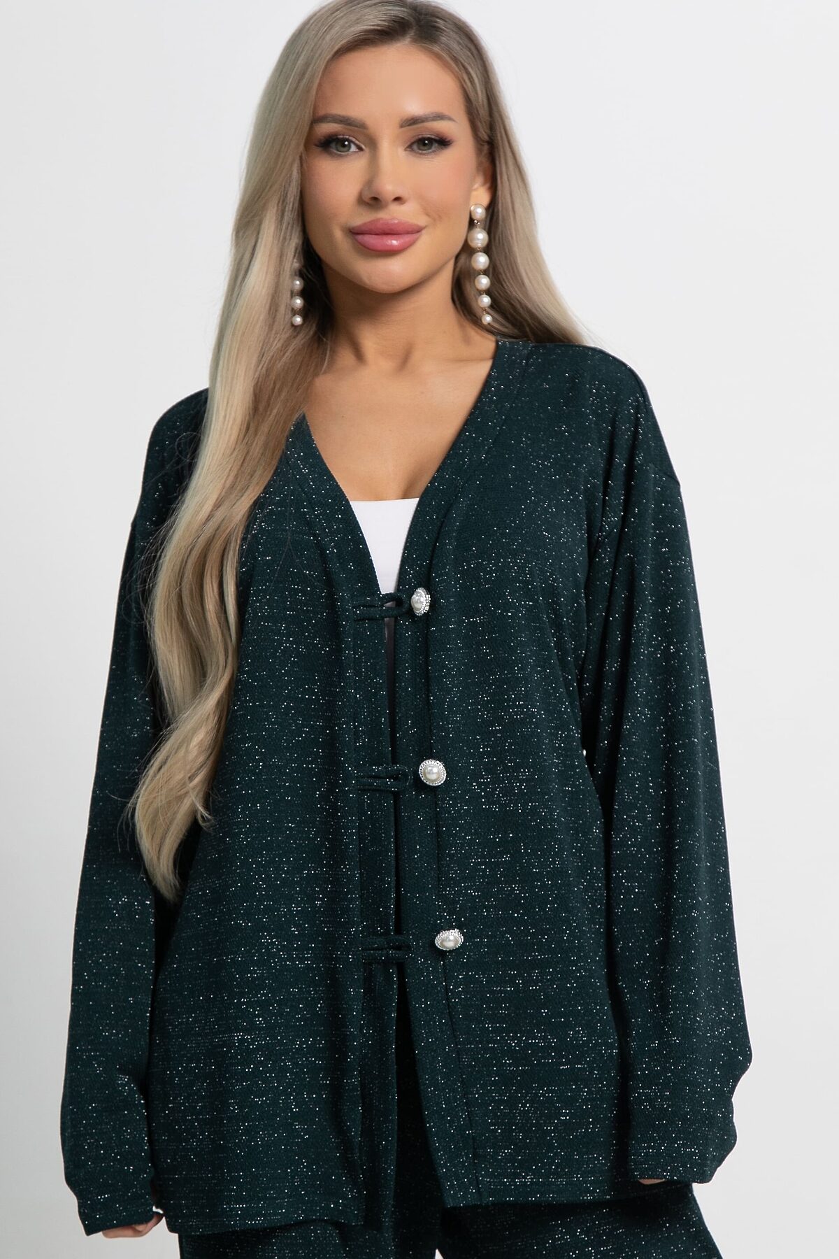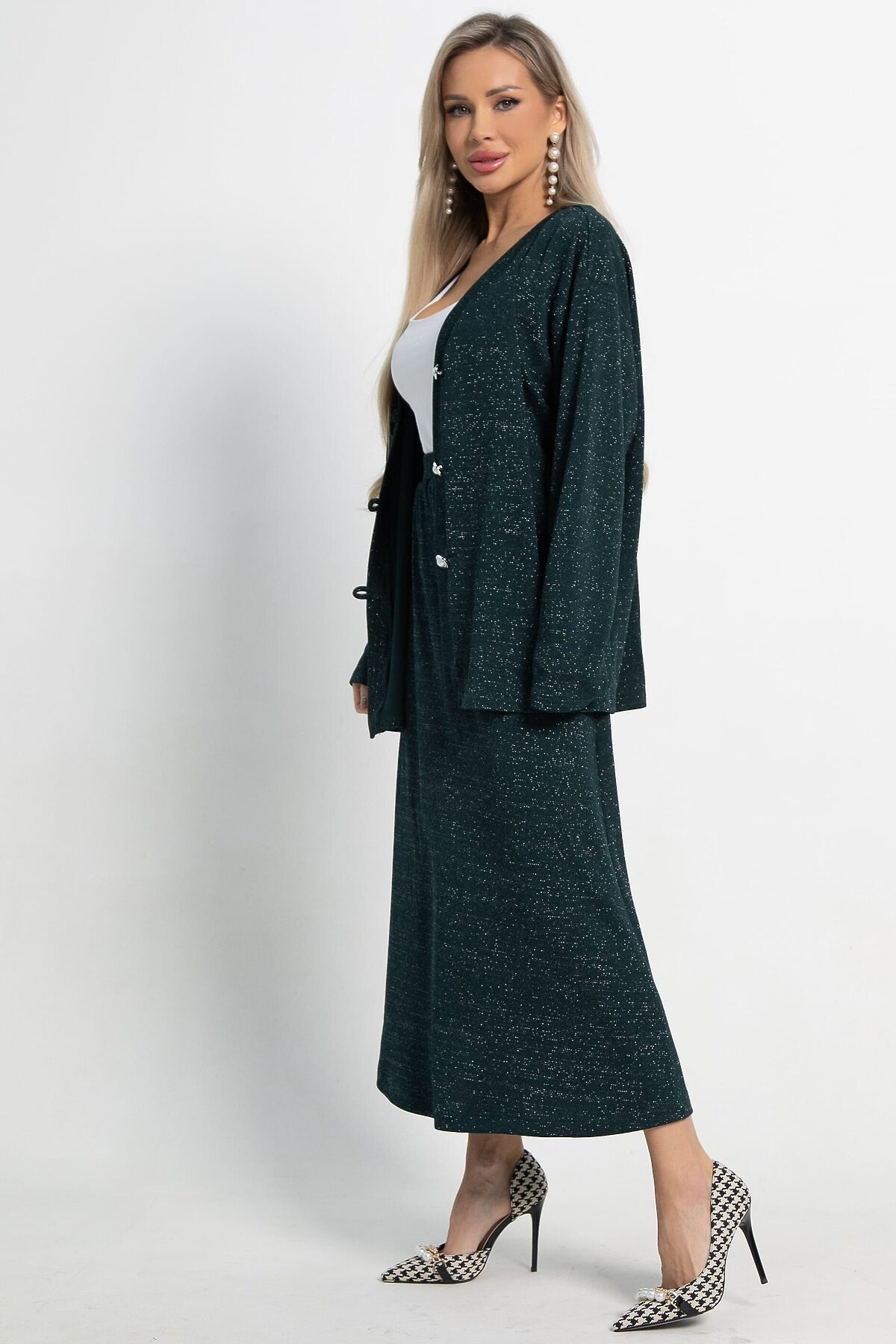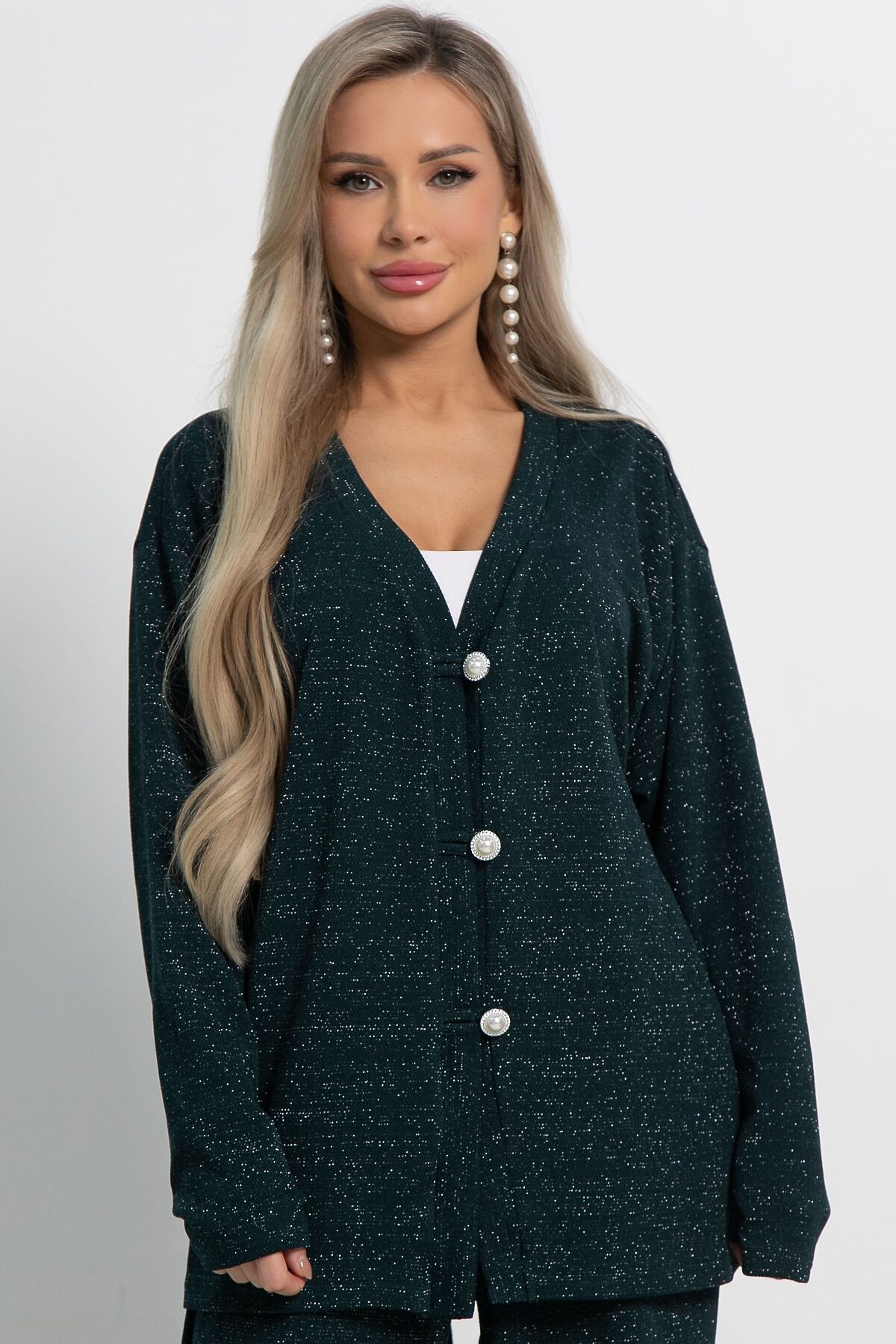 Кардиган свободного силуэта из трикотажного полотна с ниткой люрекс. В комплекте есть съёмный пояс шнур. Центральная застёжка на декоративные пуговицы и воздушные петли. Кардиган можно носить как самостоятельный элемент одежды, либо комплектовать с брюками или юбкой А-силуэта из того же трикотажного полотна.