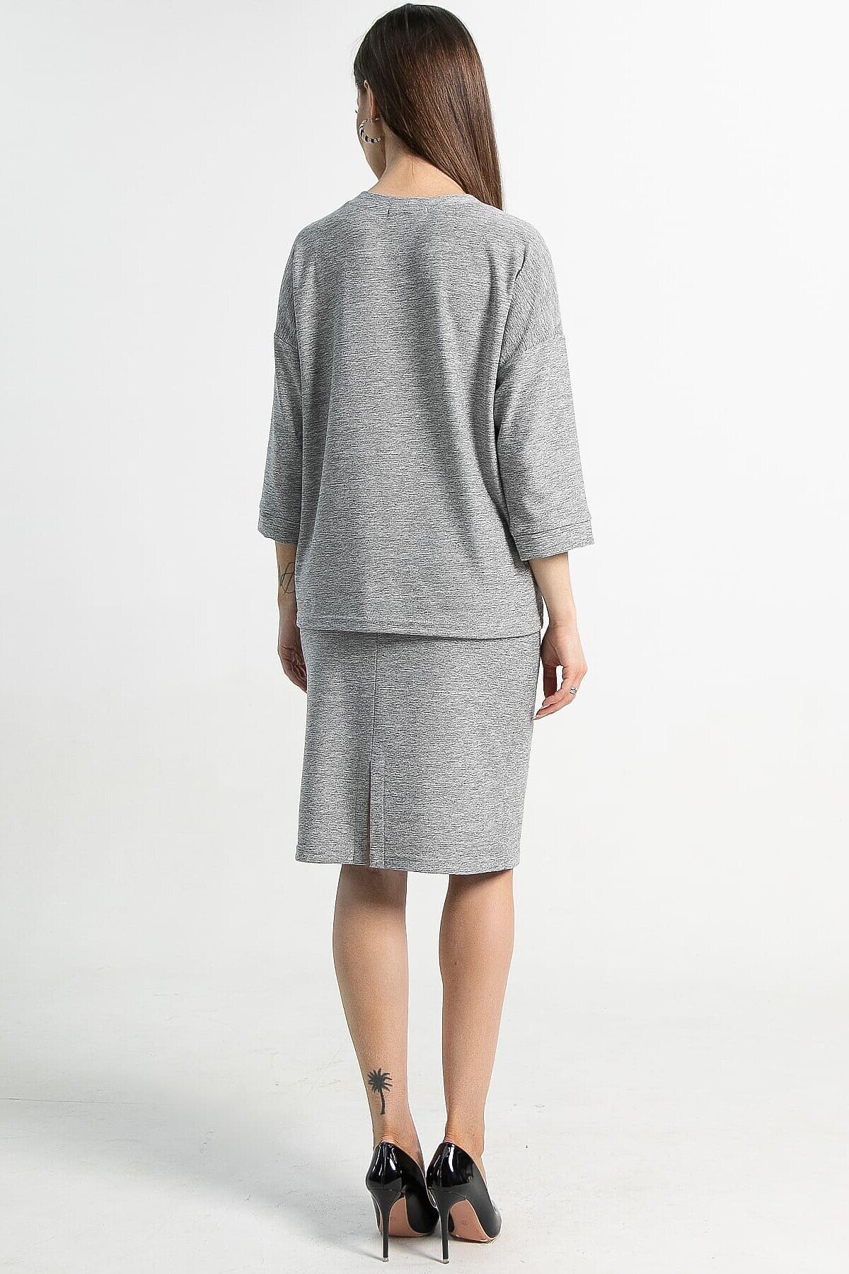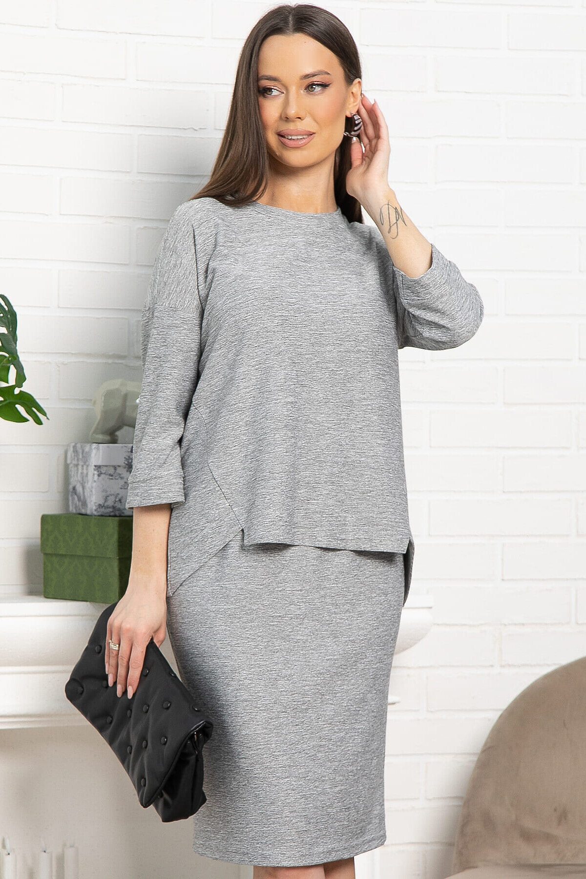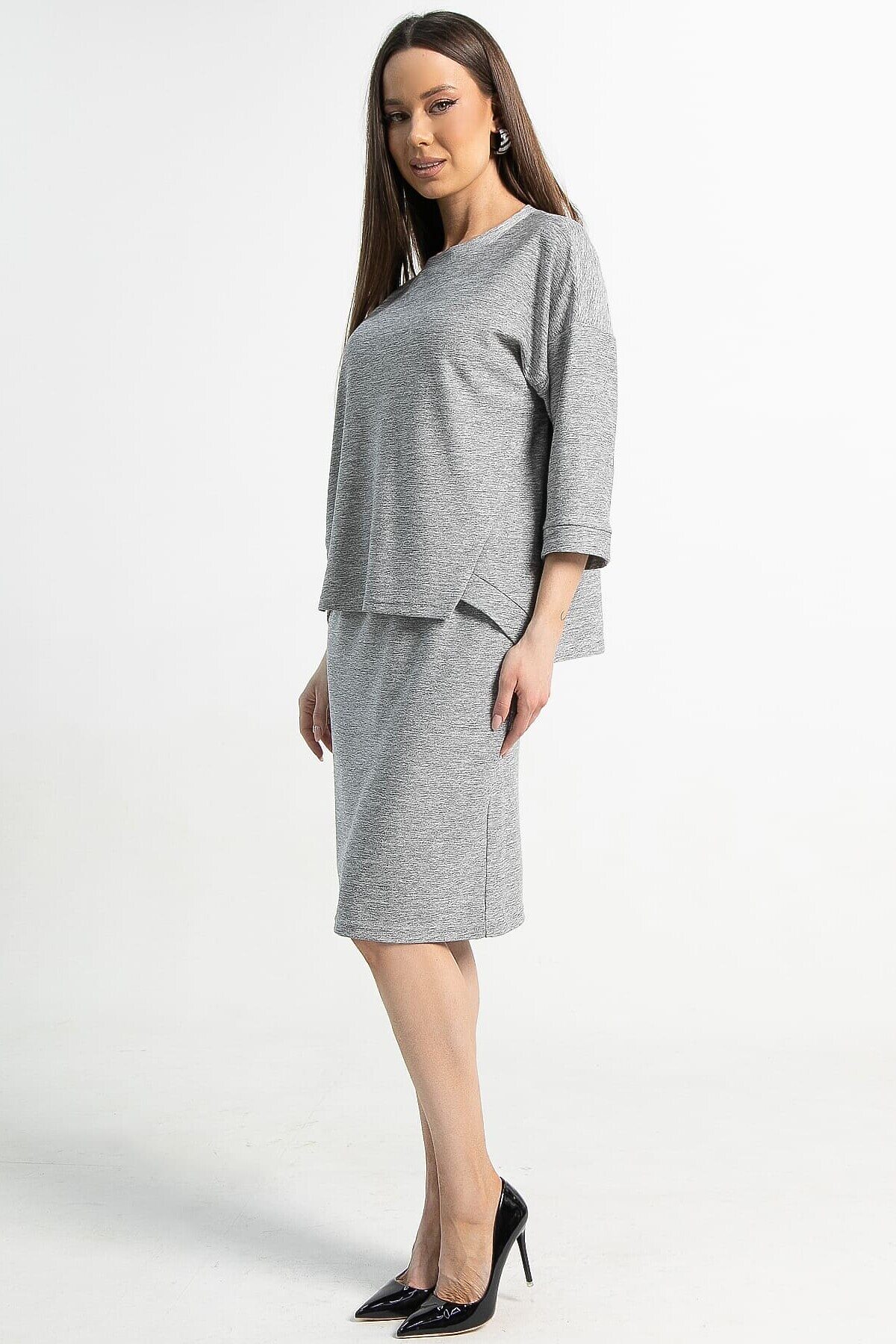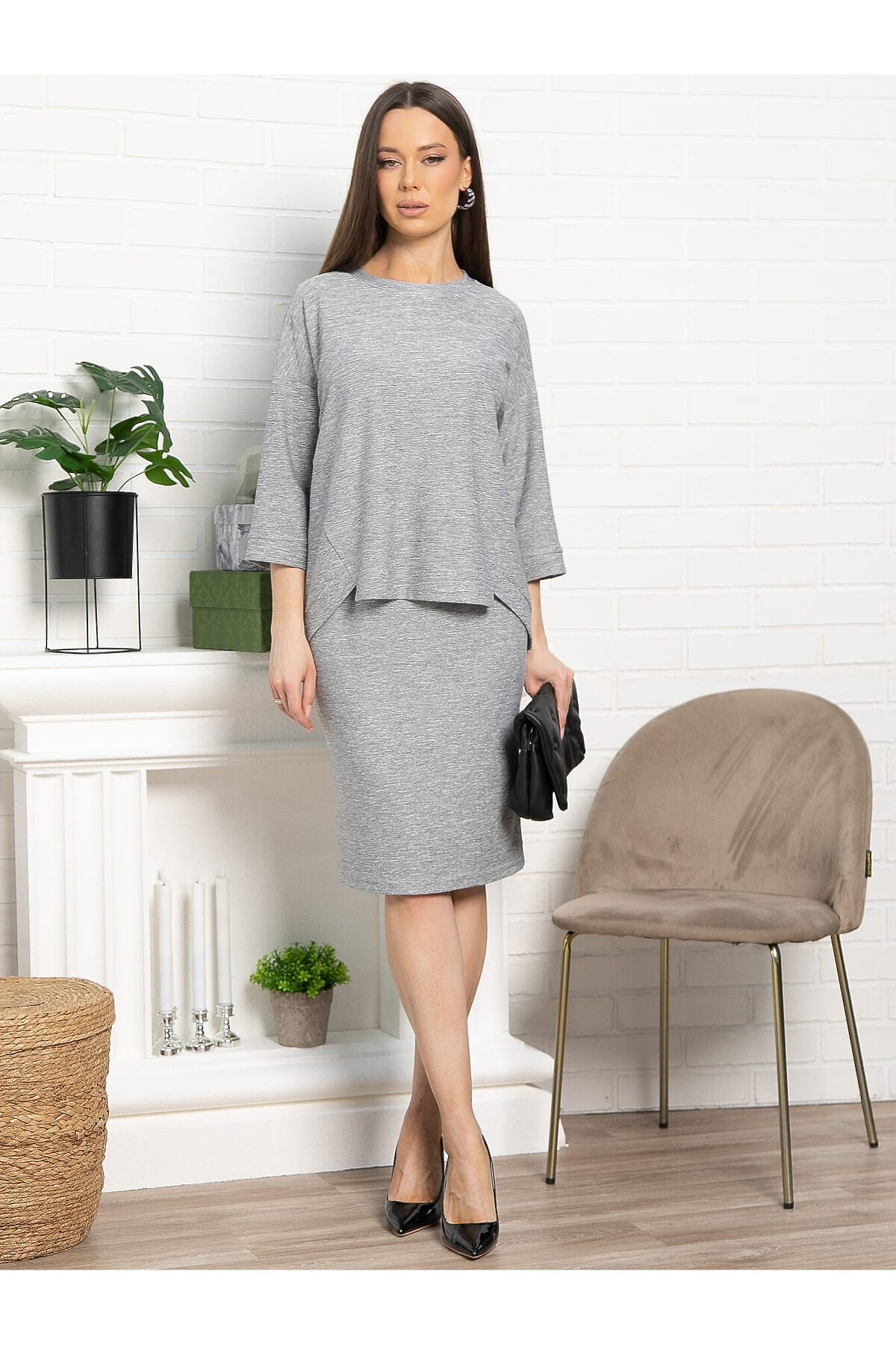 Женский трикотажный костюм с юбкой сочетает комфорт, изящество и практичность для повседневного ношения. Юбка прямая, с резинкой на талии и разрезом сзади, что обеспечивает удобство и элегантный вид. Верх костюма — пуловер с округлой горловиной, рукавами три четверти и спинкой чуть длиннее переда. Это идеальный выбор для комфортных будней, где стиль и практичность идут рука об руку.