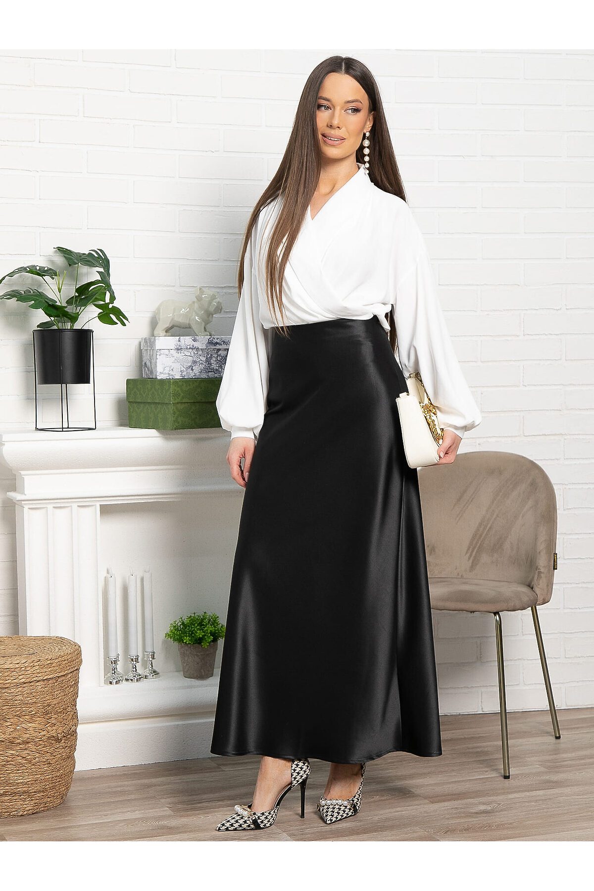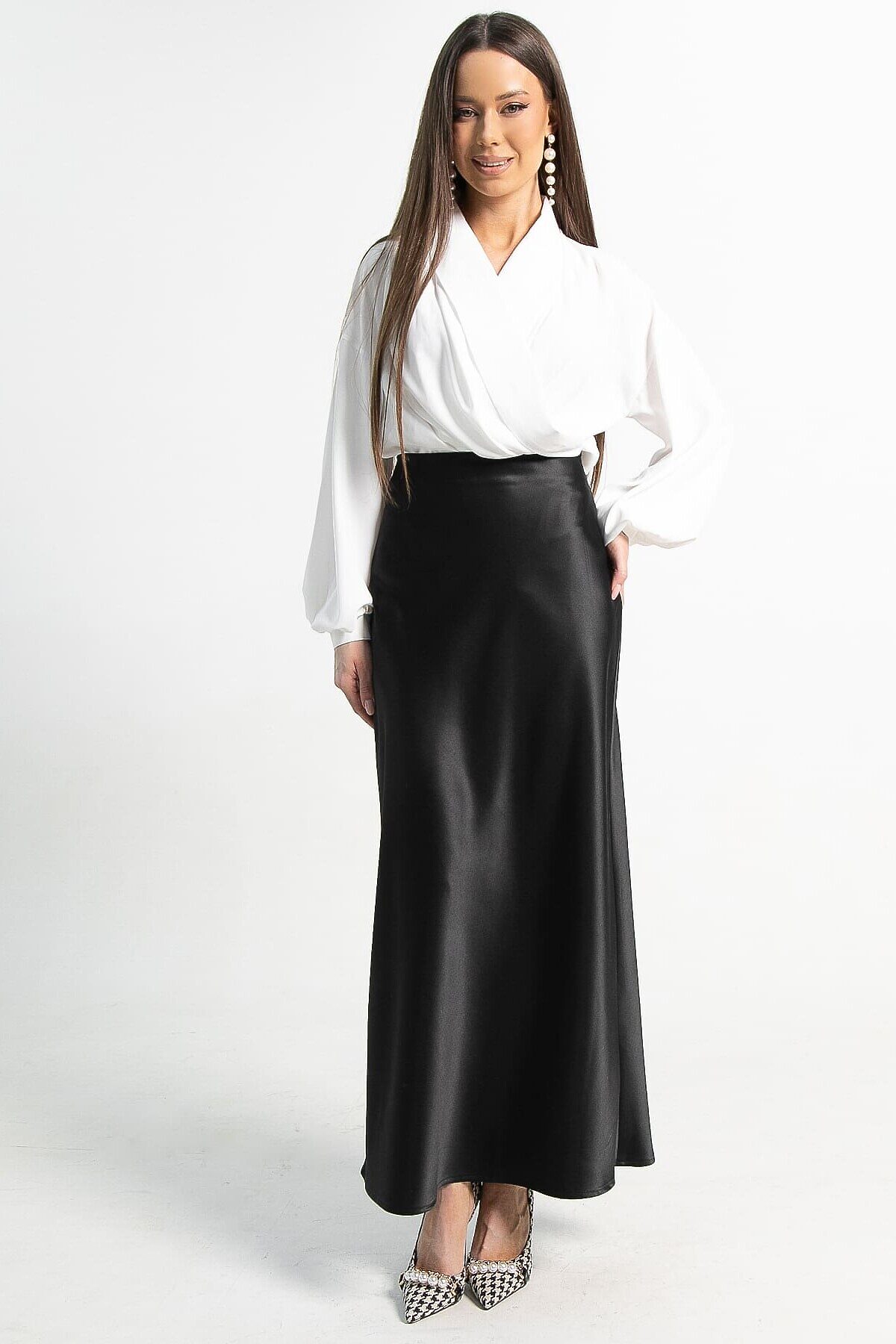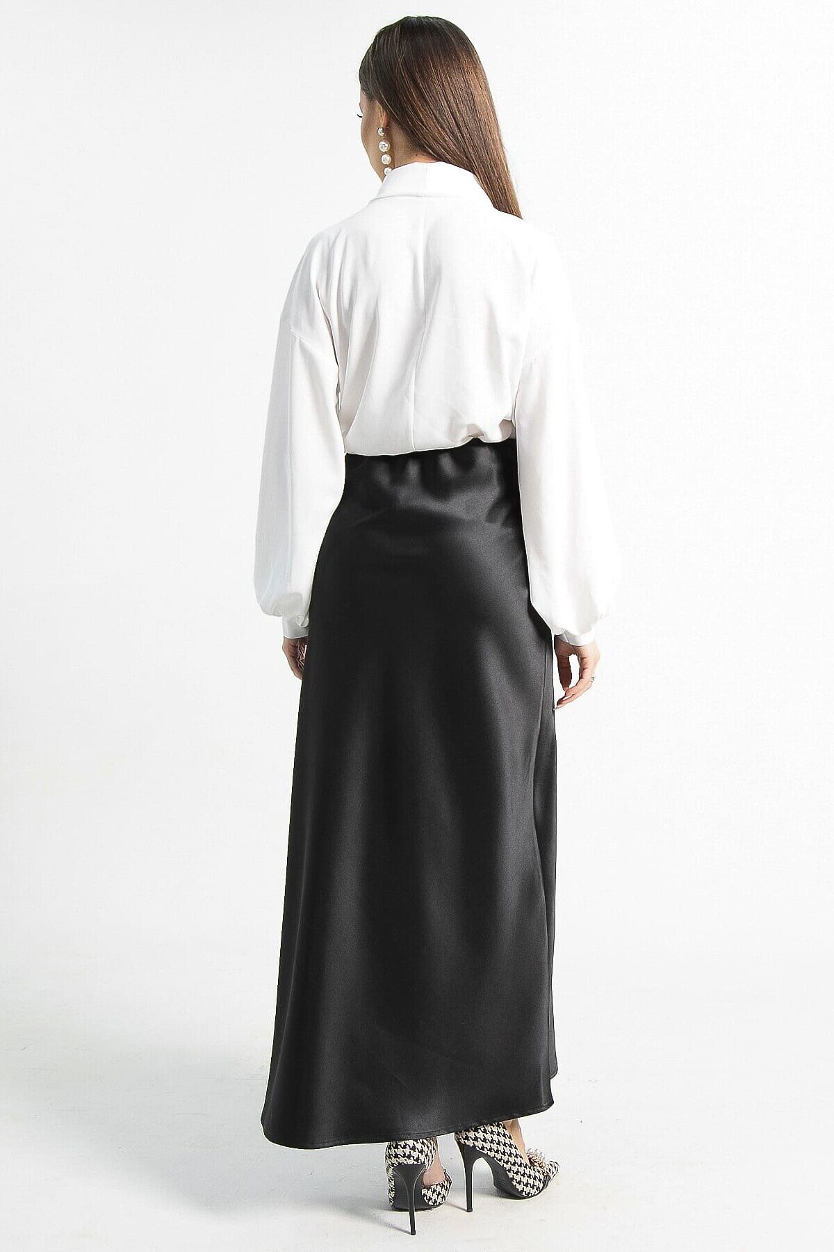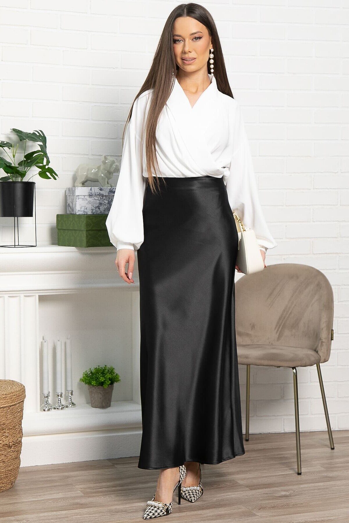 Элегантная черная юбка из атласа, которая станет ключевым элементом вашего гардероба. Эта модель объединяет в себе стиль и практичность, подходя как для деловых мероприятий, так и для торжественных событий. По спинке расположена резинка. Юбка имеет косой крой. Сочетайте её с шелковой блузкой и туфлями на каблуке для вечернего выхода или с простой футболкой и кедами, чтобы создать стильный повседневный образ. Она станет основой для различных модных ансамблей, придавая каждому из них нотку утонченности.