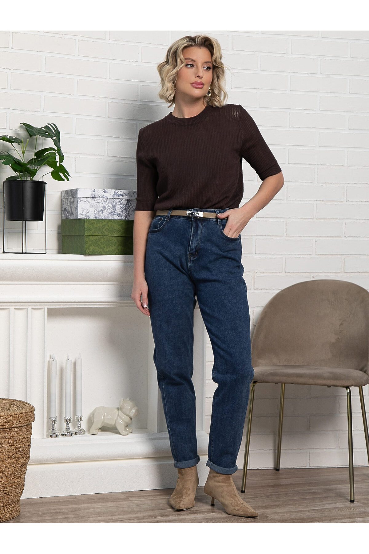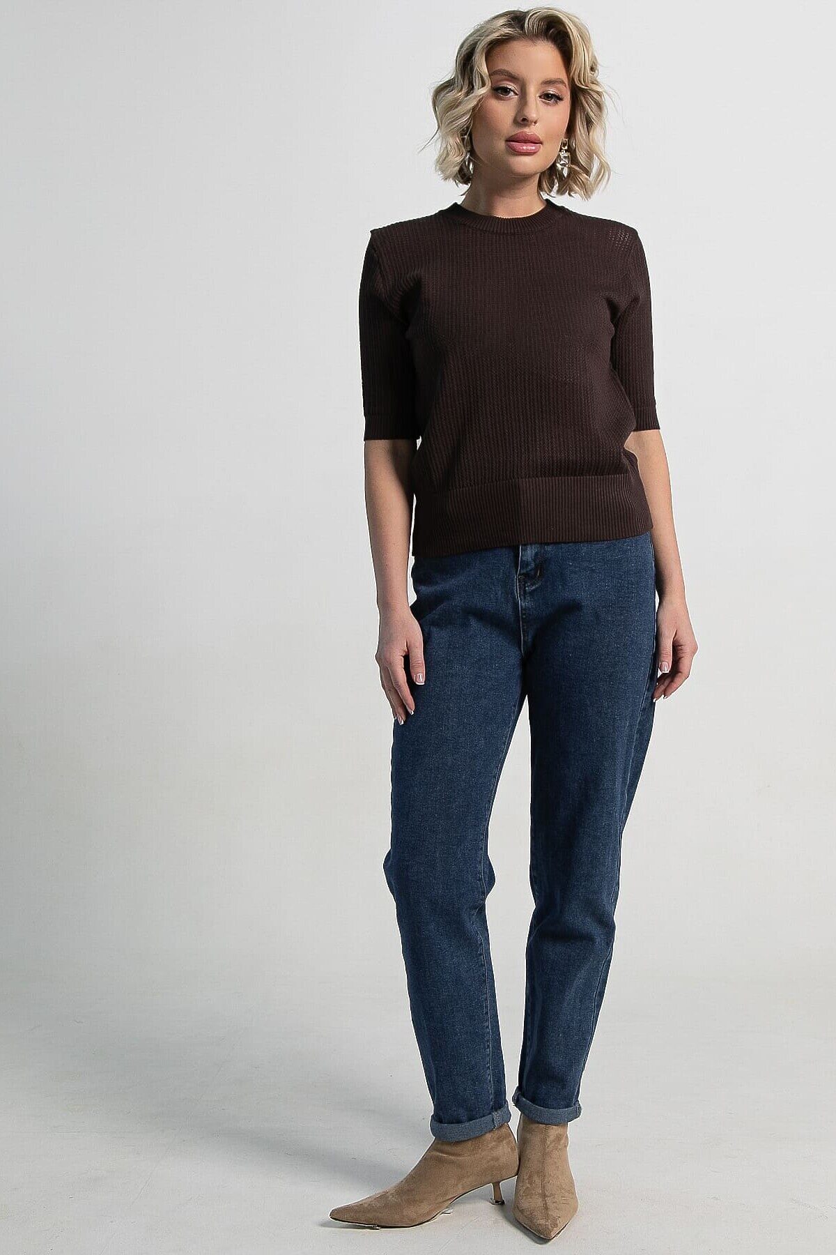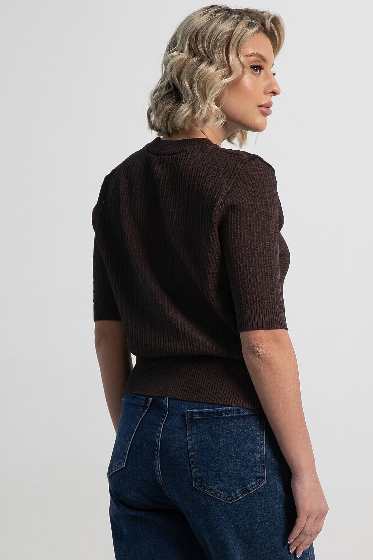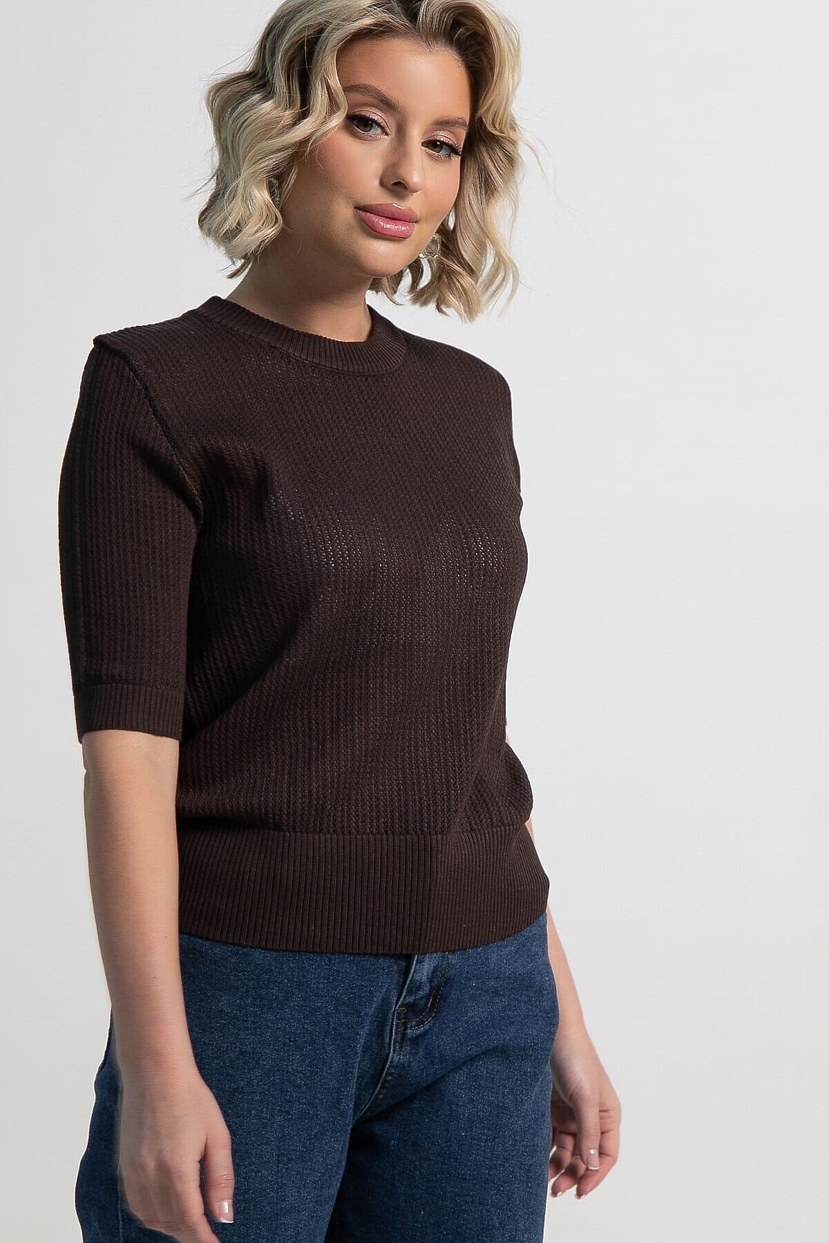 Эта трикотажная футболка станет отличным дополнением вашего гардероба. Ее однотонный шоколадный цвет позволяет легко сочетать как с повседневной одеждой, так и с более изысканными ансамблями. Мелкий рельефный узор на ткани придает изделию уникальность и стильный вид, выгодно отличая его от классических гладких текстур. Округлый вырез горловины удобный и практичный. Короткие рукава обеспечивают свободу движений, что делает эту футболку идеальным выбором для теплых дней или как элемент многослойного образа. Сочетайте ее с джинсами, брюками, юбками или надевайте под пиджак и кардиган, чтобы добавить вашему образу легкости, свежести и элегантности.