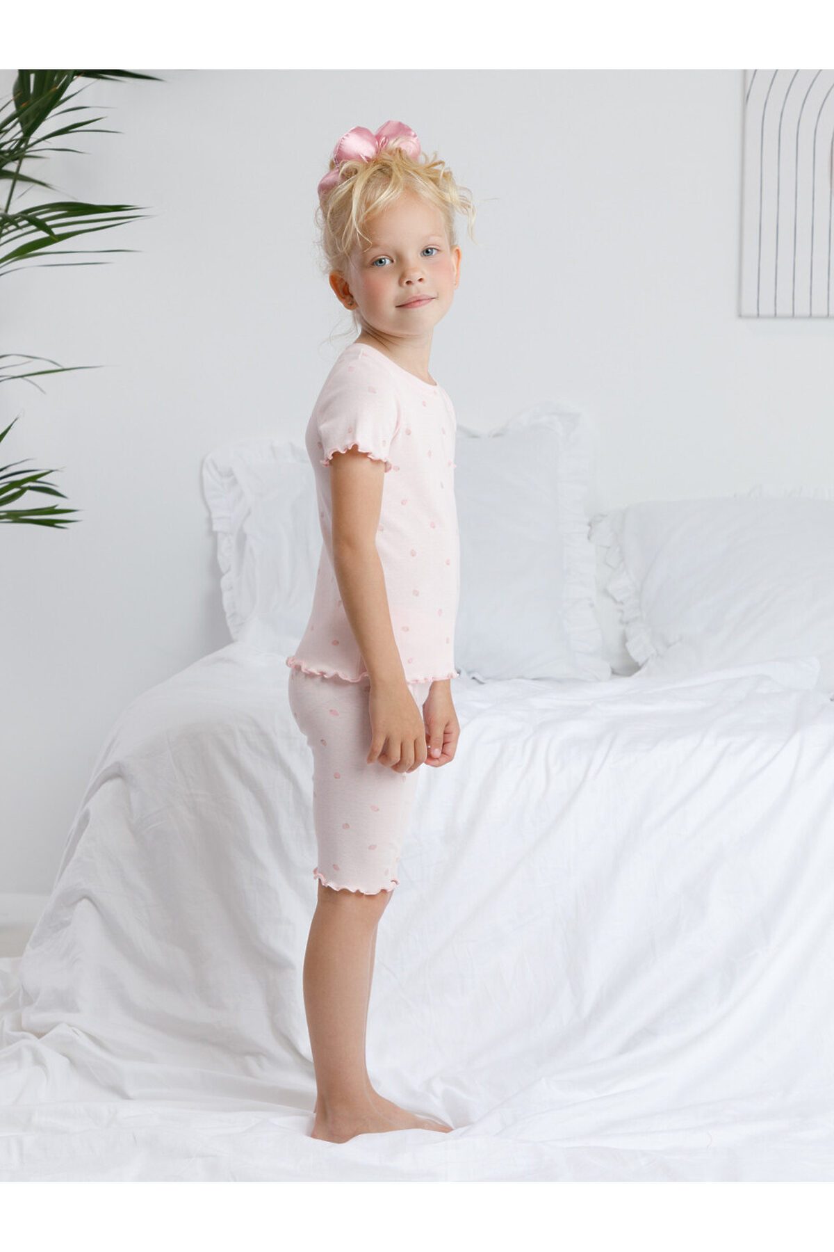 Трикотажная пижама в рубчик из натурального хлопка. Футболка с короткими втачными рукавами и шорты с эластичной резинкой в поясе. Оригинальная набивка выполнена из стойких текстильных гипоаллергенных красителей. Изделие сохраняет цвет и форму после многократных стирок. Все трикотажные полотна производятся в соответсвии с нормами швейцарского сертификата ЭкоТекс.