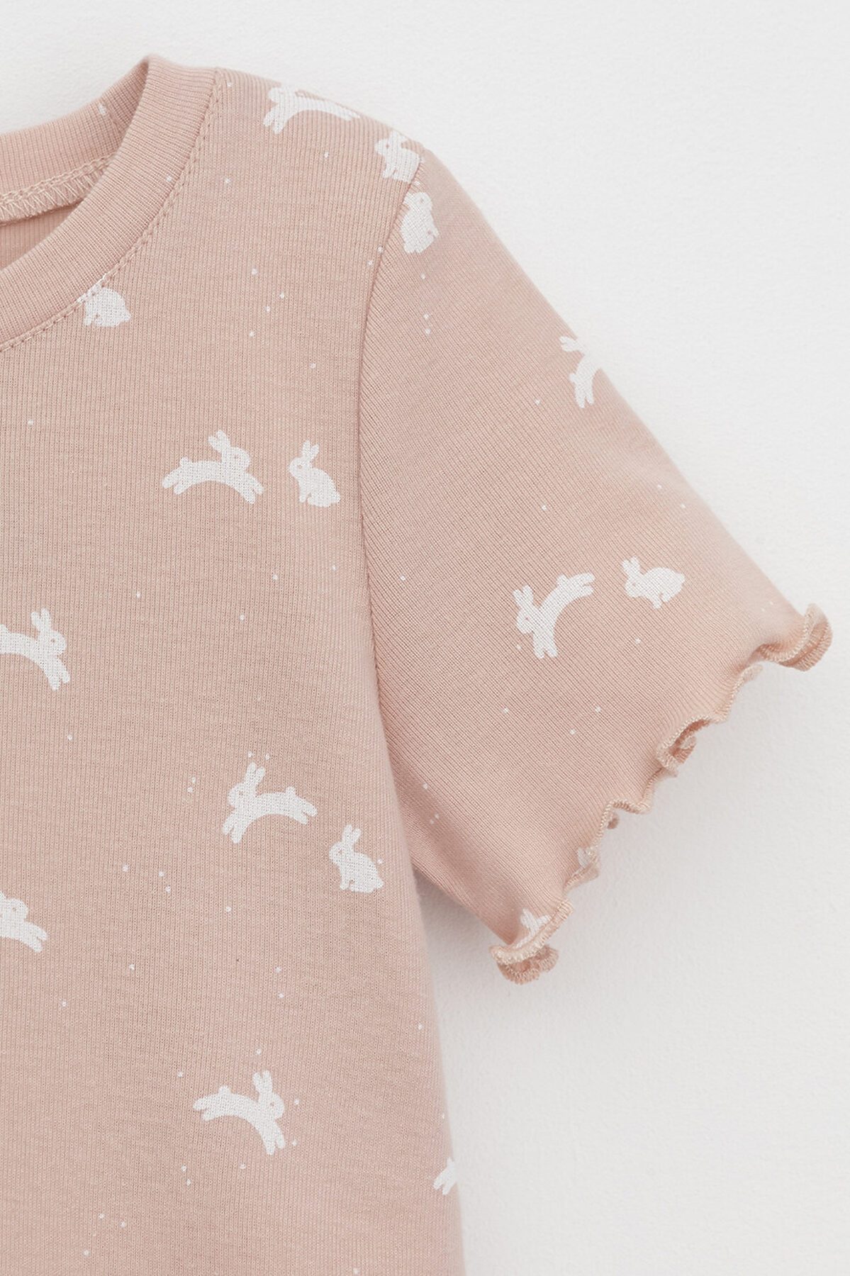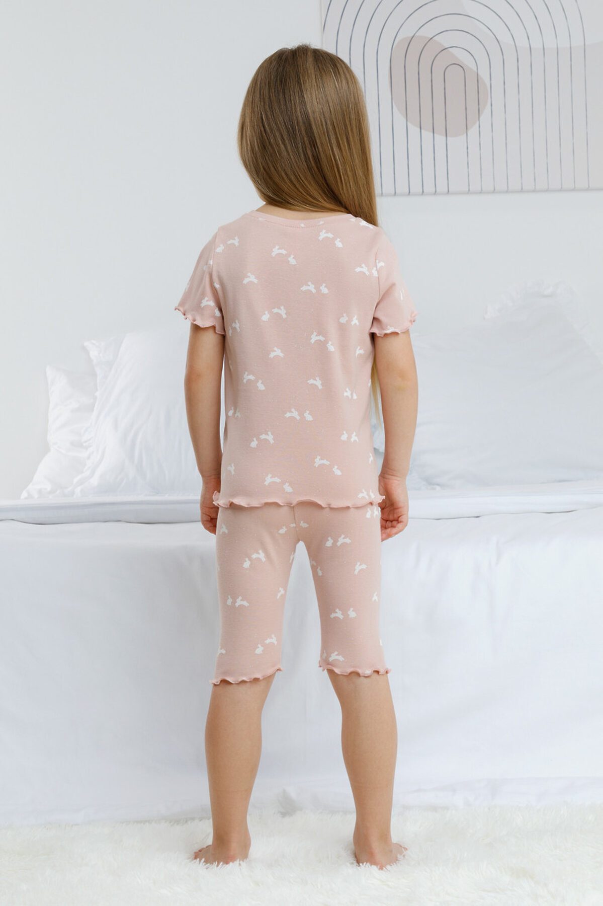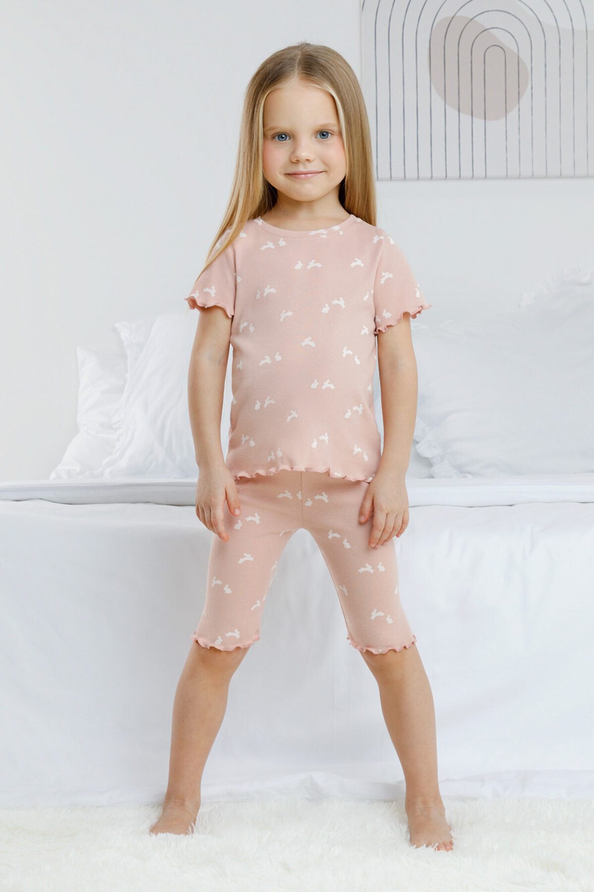 Трикотажная пижама в рубчик из натурального хлопка. Футболка с короткими втачными рукавами и шорты с эластичной резинкой в поясе. Оригинальная набивка выполнена из стойких текстильных гипоаллергенных красителей. Изделие сохраняет цвет и форму после многократных стирок. Все трикотажные полотна производятся в соответсвии с нормами швейцарского сертификата ЭкоТекс.