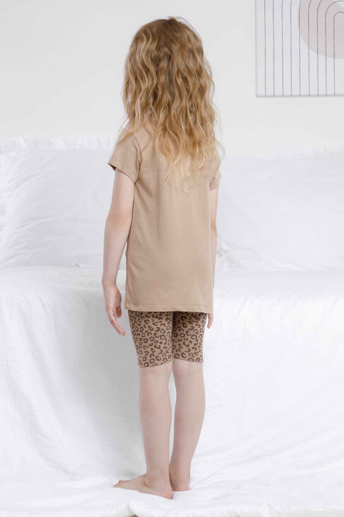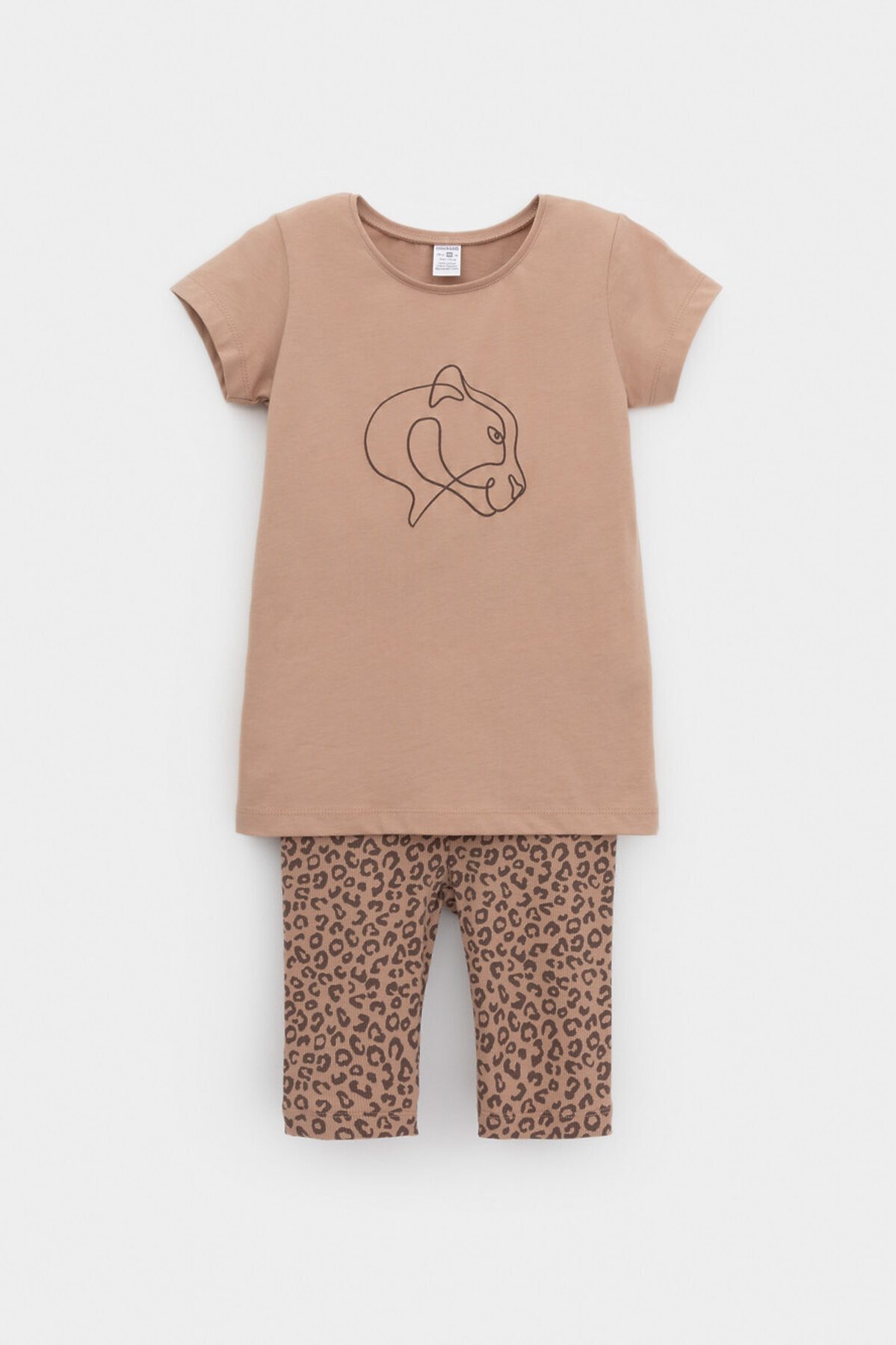 Трикотажная пижама для девочки с футболкой и велосипедками. Футболка с короткими рукавами изготовлена из гладкого трикотажа супрем. Велосипедки с резинкой в поясе выполнены из эластичного материала в рубчик. Оригинальная набивка и принт выполнены из стойких текстильных гипоаллергенных красителей. Изделие сохраняет цвет и форму после многократных стирок. Все трикотажные полотна производятся в соответствии с нормами швейцарского сертификата ЭкоТекс.