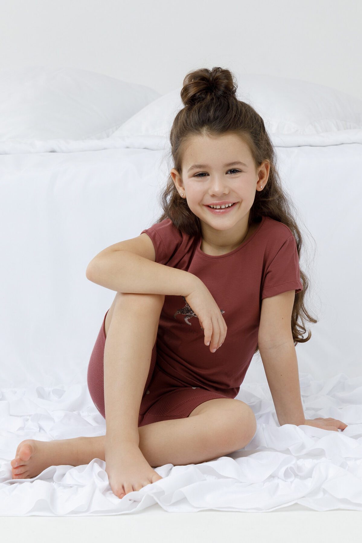 Трикотажная пижама для девочки с футболкой и велосипедками. Футболка с короткими рукавами изготовлена из гладкого трикотажа супрем. Велосипедки с резинкой в поясе выполнены из эластичного материала в рубчик. Оригинальная набивка и принт выполнены из стойких текстильных гипоаллергенных красителей. Изделие сохраняет цвет и форму после многократных стирок. Все трикотажные полотна производятся в соответствии с нормами швейцарского сертификата ЭкоТекс.