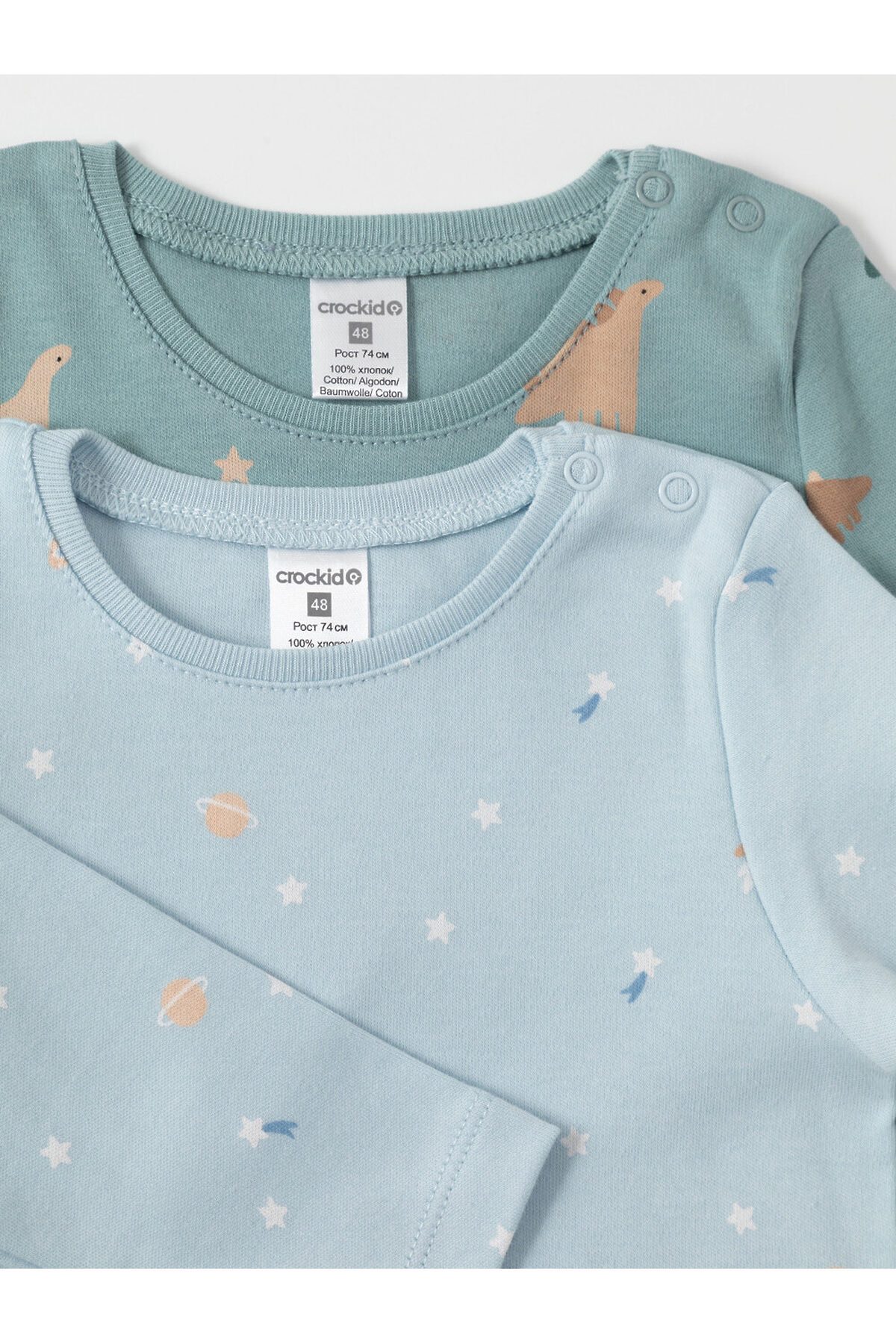Джемперы в упаковке 2 шт для новорождённых из мягкого, эластичного трикотажа, произведённого из натурального хлопка. Изделие застёгивается на кнопки на плече. Оригинальные набивки выполнены из стойких, гипоаллергенных текстильных красителей. Все трикотажные полотна производятся в соответствии с нормами Швейцарского сертификата ЭкоТекс.