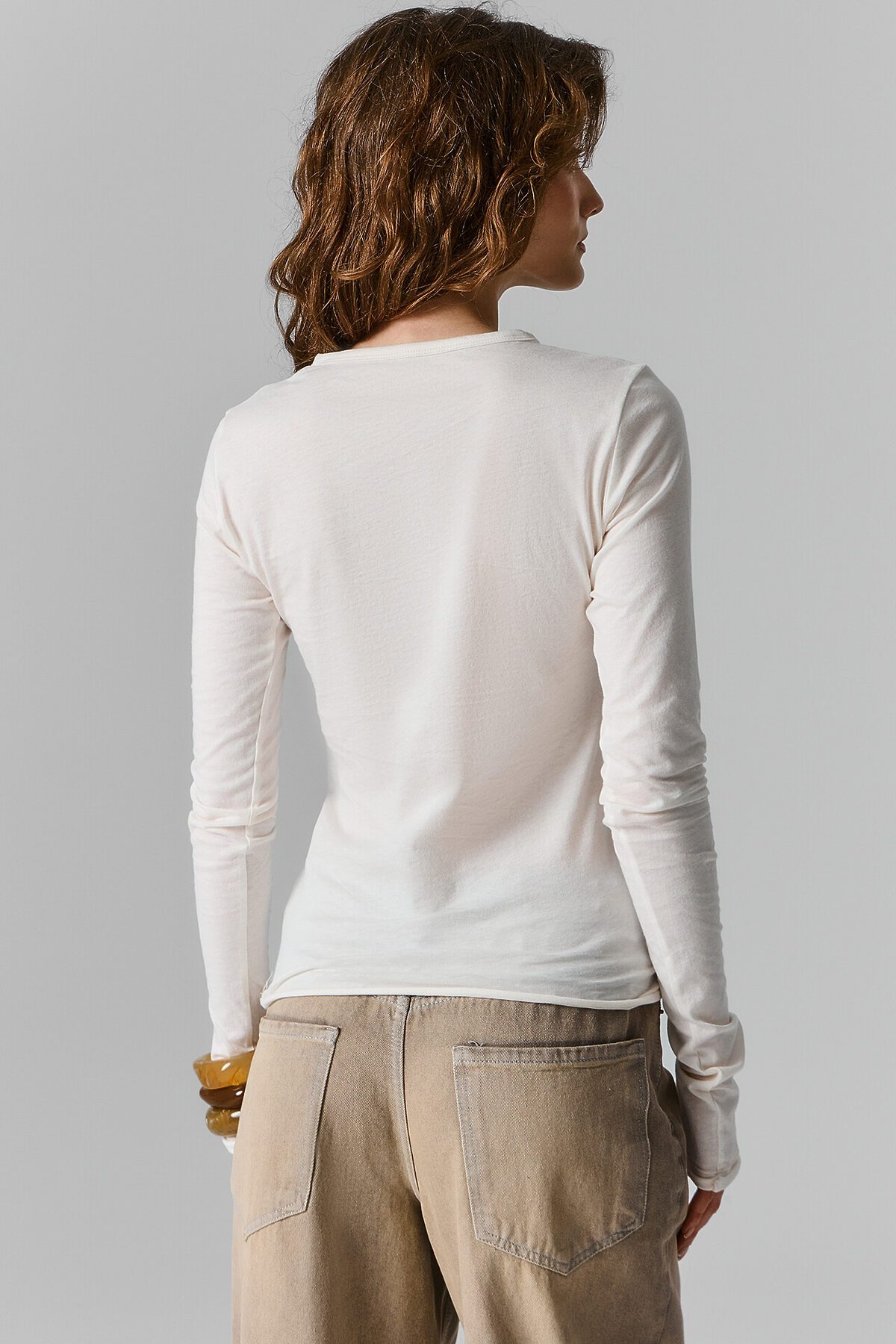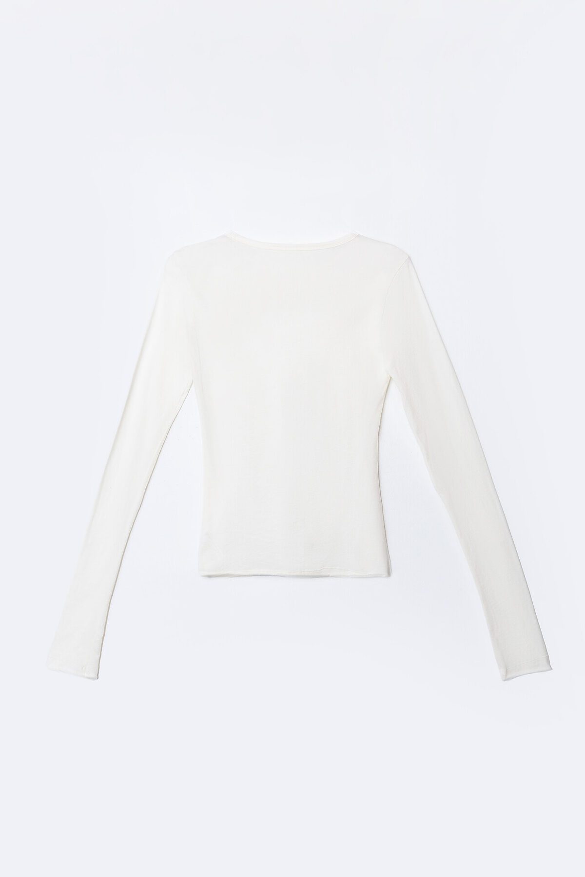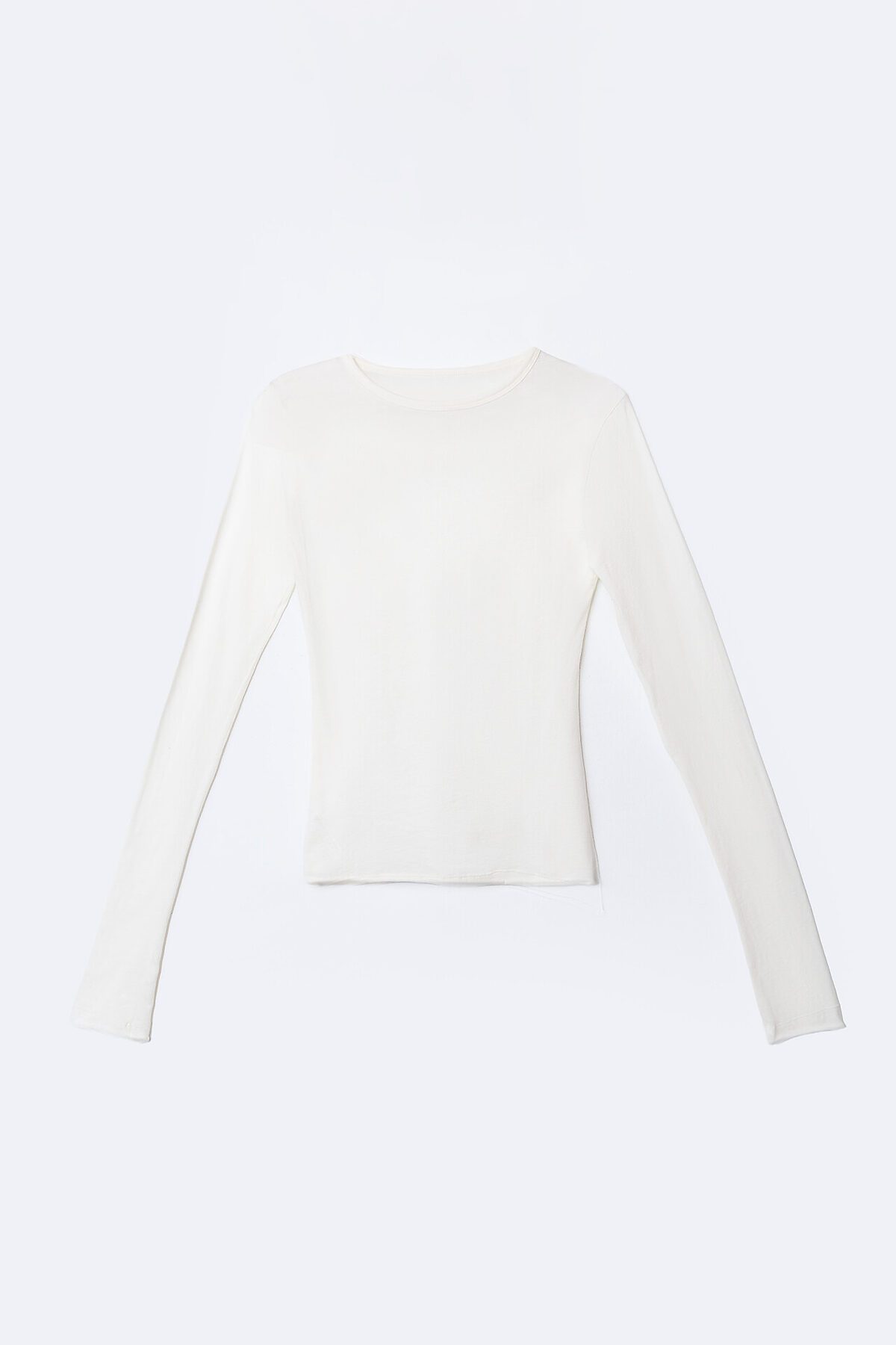 Лонгслив женский изготовлен из кулирки. Лонгслив прилегающего силуэта. Рукава втачные длинные. Горловина круглая, обработана обтачкой из основного полотна, в 4 сложения, 1,5 см в готовом виде. Низ лонгслива и низ рукавов - сырой срез, 3 см от края прострочена двойная отделочная строчка.