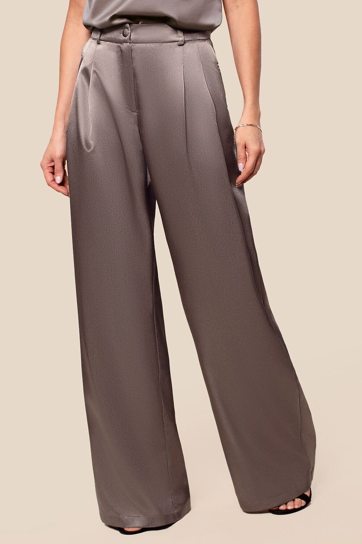 Брюки-палаццо выполнены из струящегося сатина напоминающий натуральный шелк. Модель свободного кроя с боковыми карманами моментально сделает образ строгим и соблазнительным. Посадка на талии вытягивает силуэт. Для праздничного образа сочетайте в костюме с топом D23.061 и блузкой D29.255 или вязаным трикотажем с пайетками или люрексом.