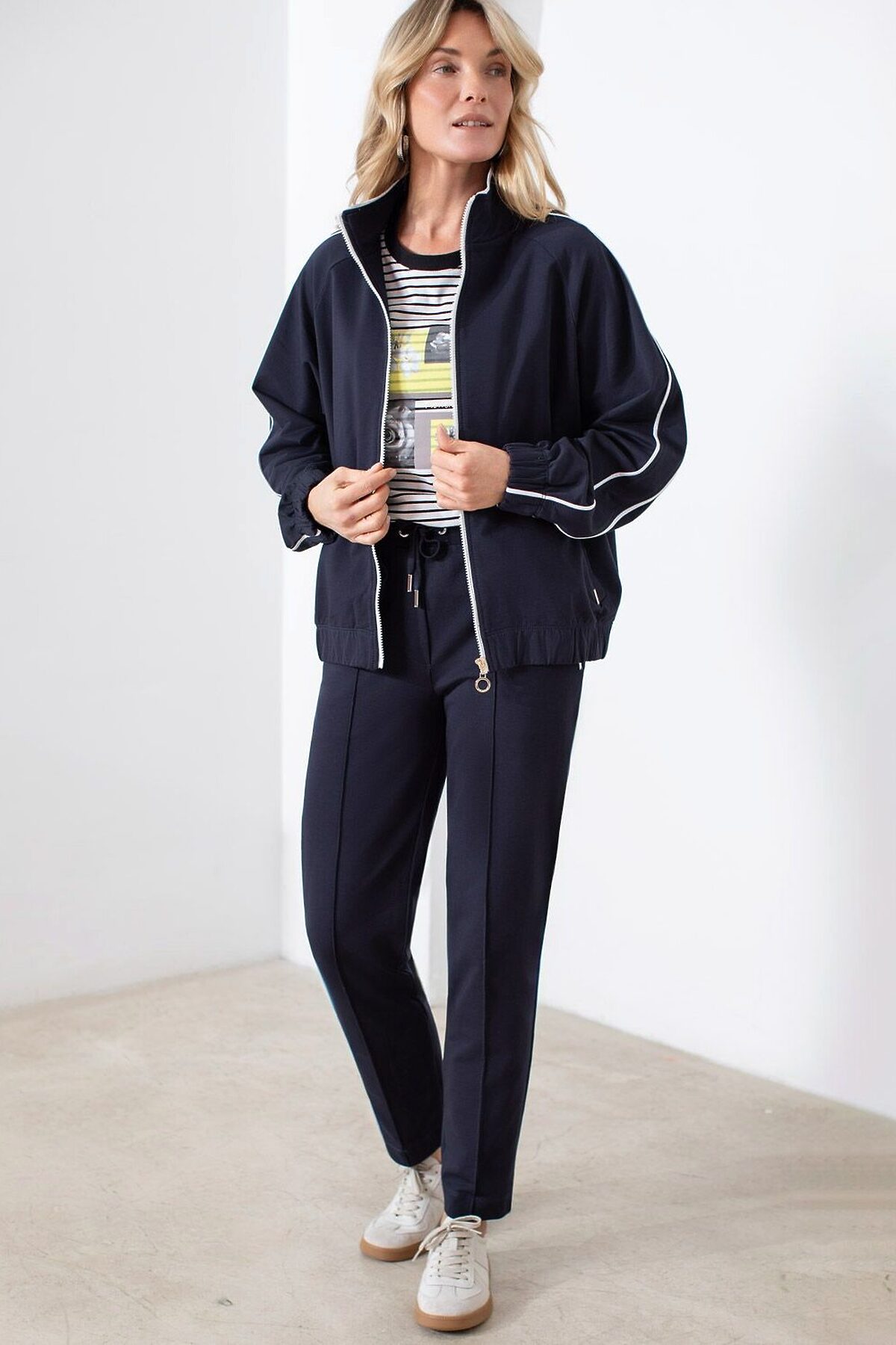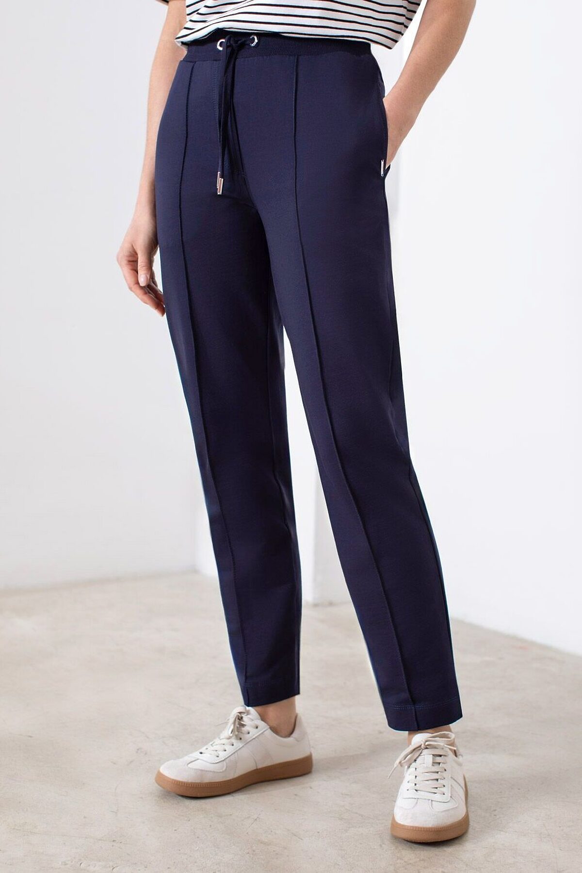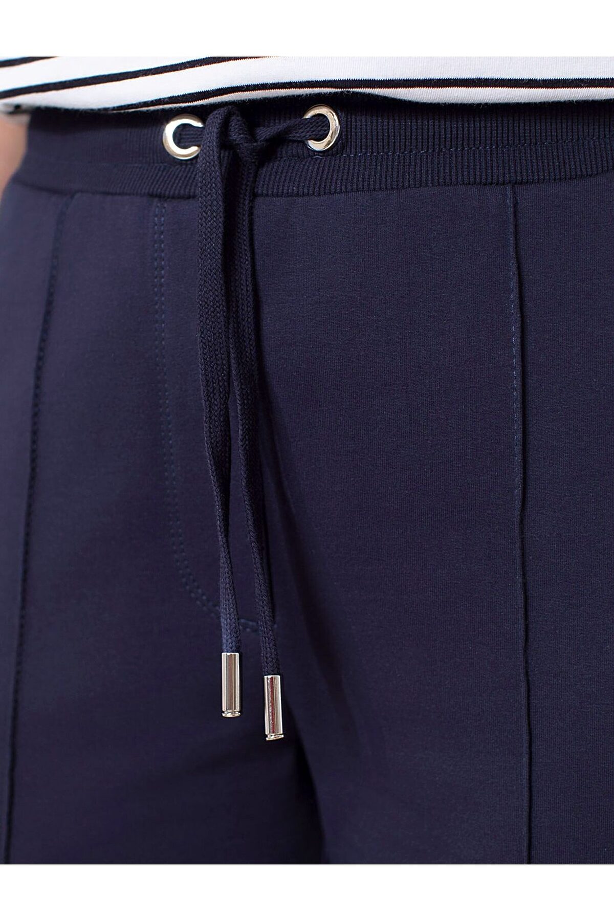 Брюки темно-синего цвета зауженного кроя выполнены из премиального футера-двухнитки. Лаконичный силуэт поддерживают застроченные стрелки, зрительно вытягивающие силуэт. Удобный пояс на резинке регулируется хлопковым шнурком с золотистой фурнитурой. Наличие эластана в составе изделия гарантирует комфорт и долговечность изделия. Эластичный материал хорошо пропускает воздух, позволяя телу дышать, и легко тянется, не ограничивая движения. Эти уютные брюки созданного для вашего комфорта. Нежный и стильный вариант подходит на любую фигуру, благодаря своей идеальной посадке. Свободный прямой крой обеспечивает свободу движений и максимальное удобство в любых ситуациях, поэтому они подойдут и на большие размеры, включая 56 размер. Эти брюки универсальны и могут стать отличным вариантом, как для занятий, так и для повседневной носки. Они легко вписываются в повседневный образ, благодаря универсальности и элегантности. Рекомендуем сочетать с артикулами: D49.160, D49.167, D49,168