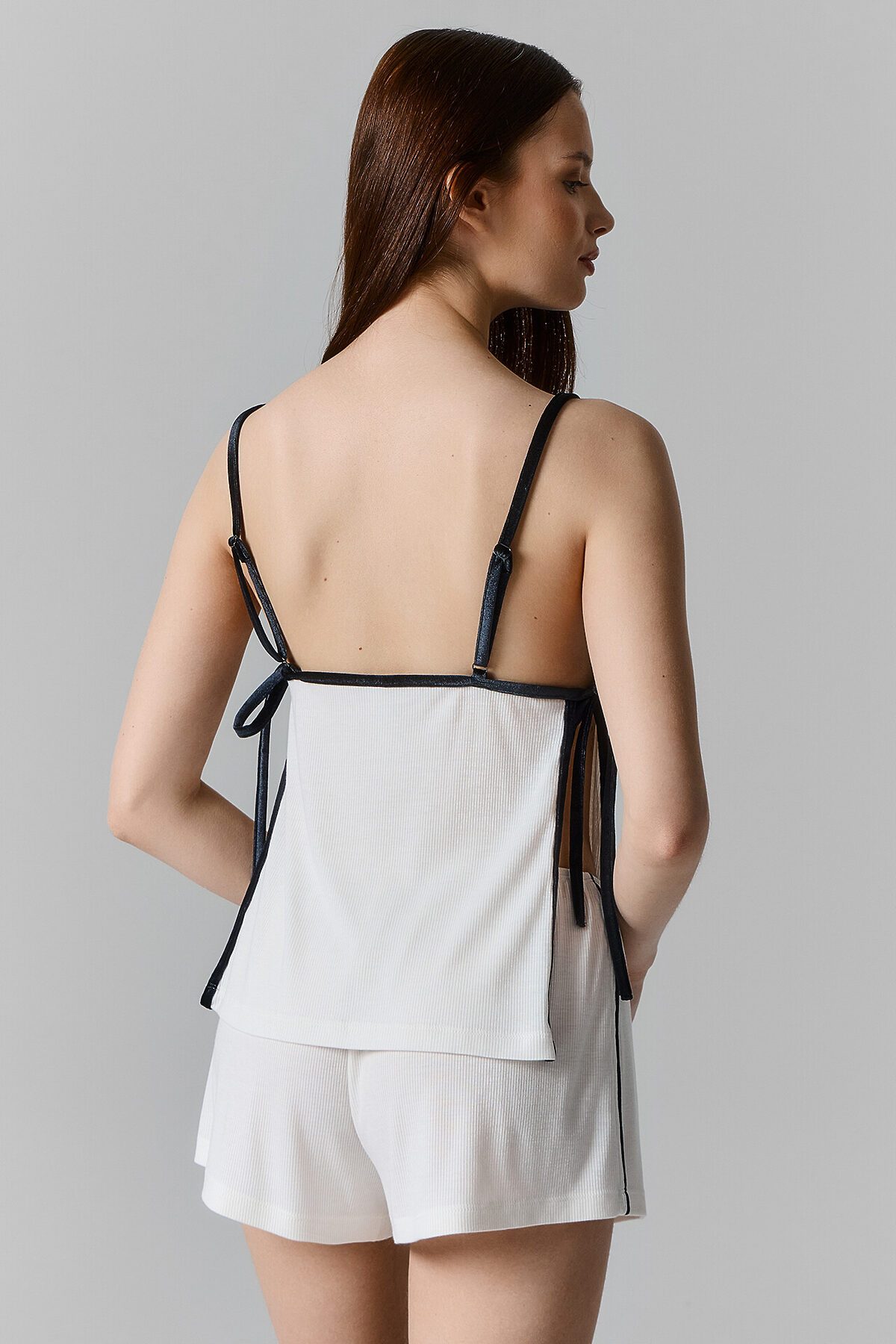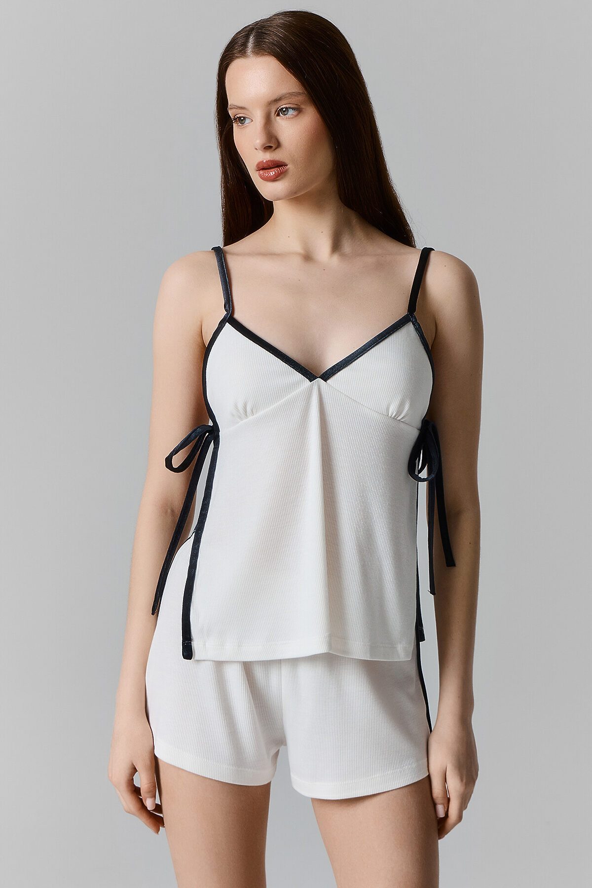 Комплект состоит из блузы и шорт. Блуза прямая свободня, на бретелях. Горловина V-образной формы. По переду подрез под грудью. Лиф на подкладке из основного полотна. Горловина переда и спинки, проймы, боковые швы, окантованы бейками из велюра. Бейки по проймам переходят в бретели с регулировкой на металлические регуляторы (AL-810E) и кольца, шириной 10мм. По бокам завязки из велюра. Нижний срез блузы обработан швом вподгибку. Шорты свободного силуэта, посадка средняя. Пояс цельнокроеный с эластичной тесьмой внутри (внутр. 10мм 10RV). В боковых швах канты из велюра. Нижний срез шорт обработан швом вподгибку.