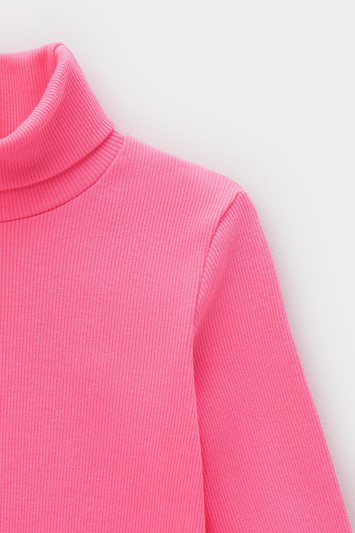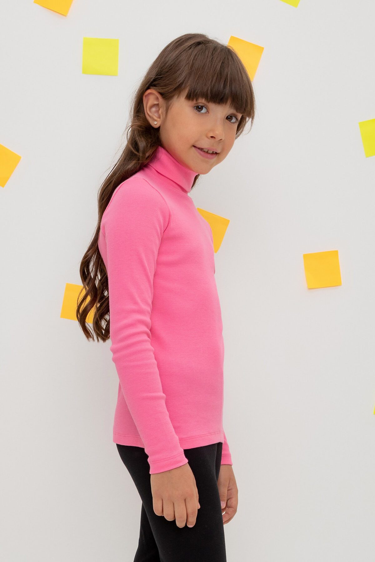 Однотонная детская водолазка из эластичного трикотажа кашкорсе. Длинные рукава. Высокая горловина с отворотом.