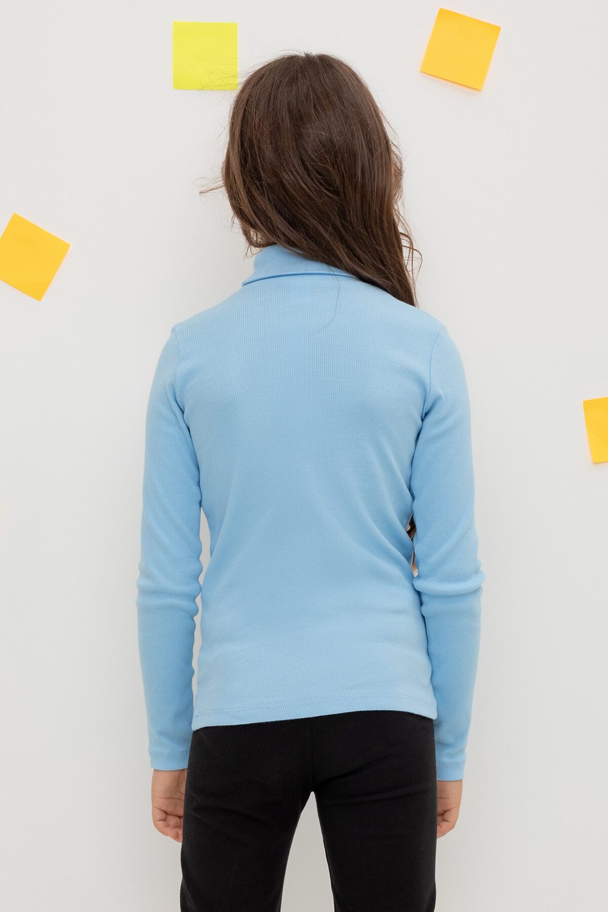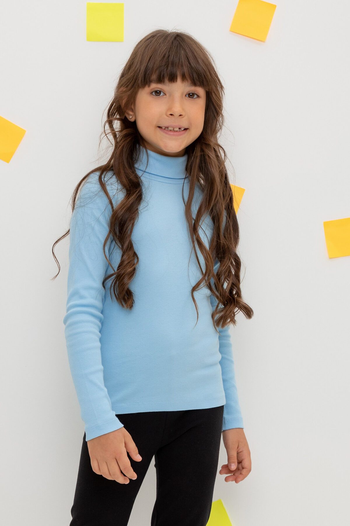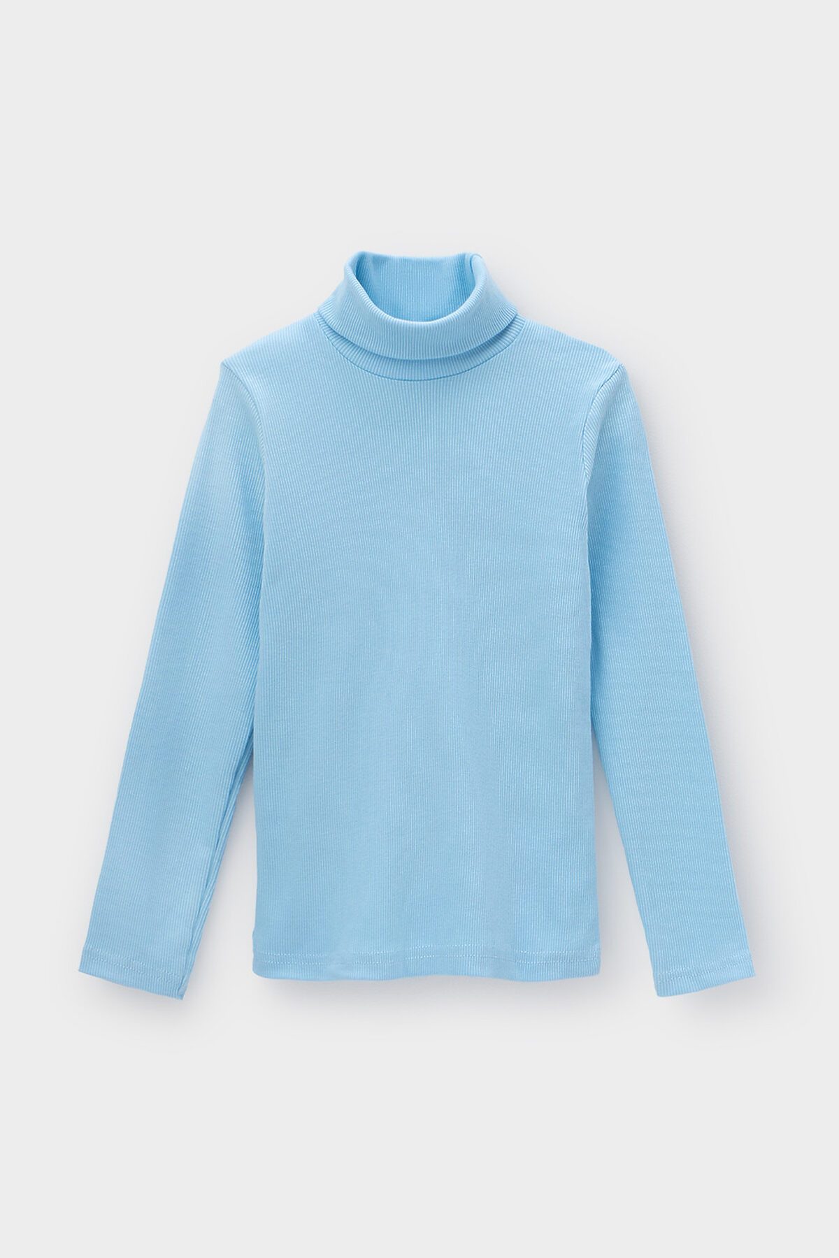 Однотонная детская водолазка из эластичного трикотажа кашкорсе. Длинные рукава. Высокая горловина с отворотом.