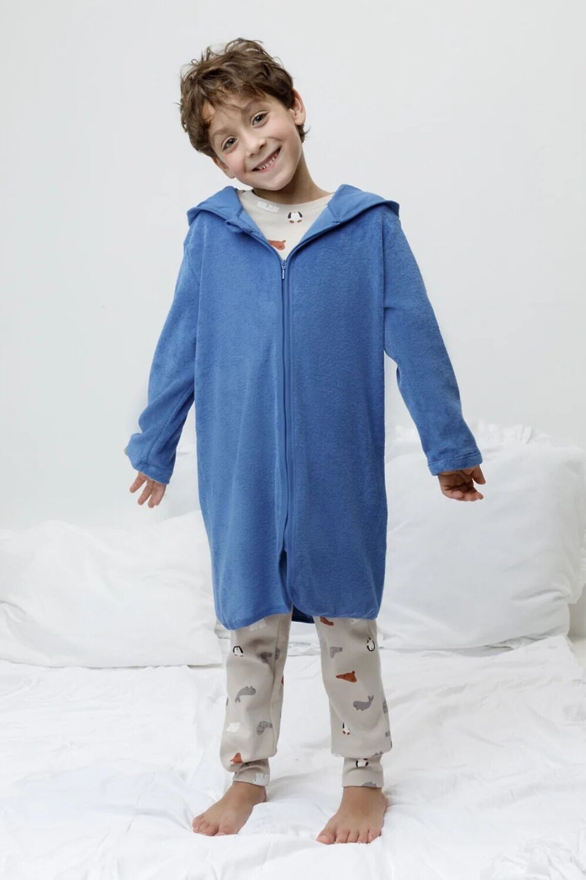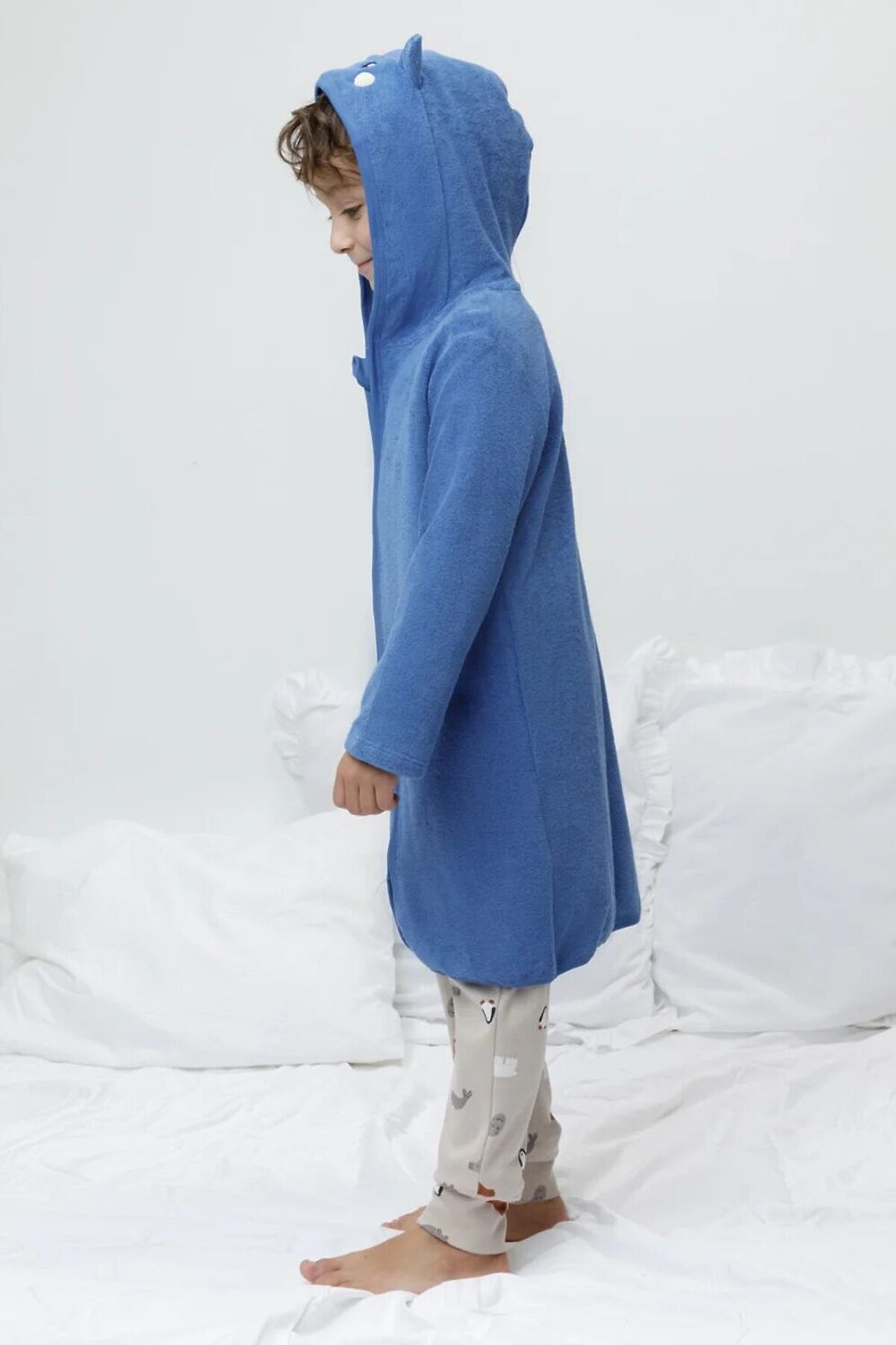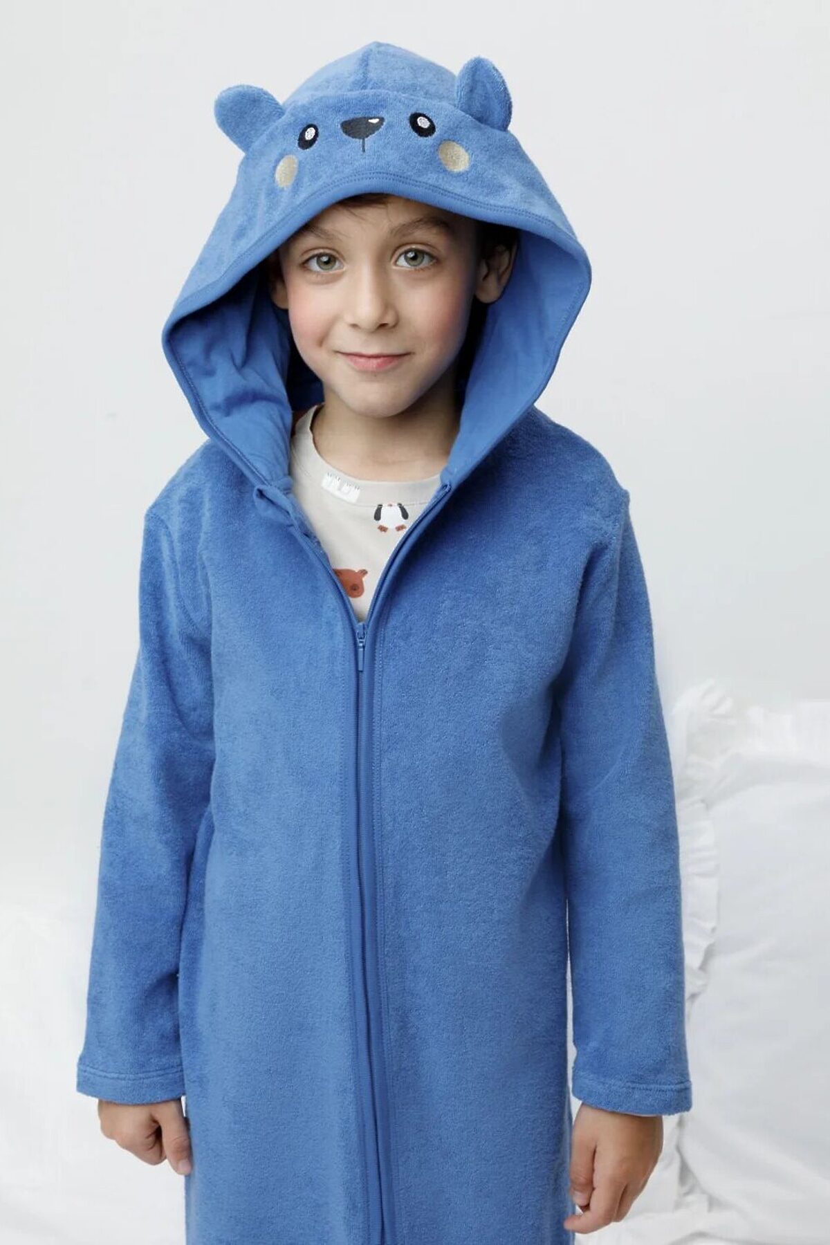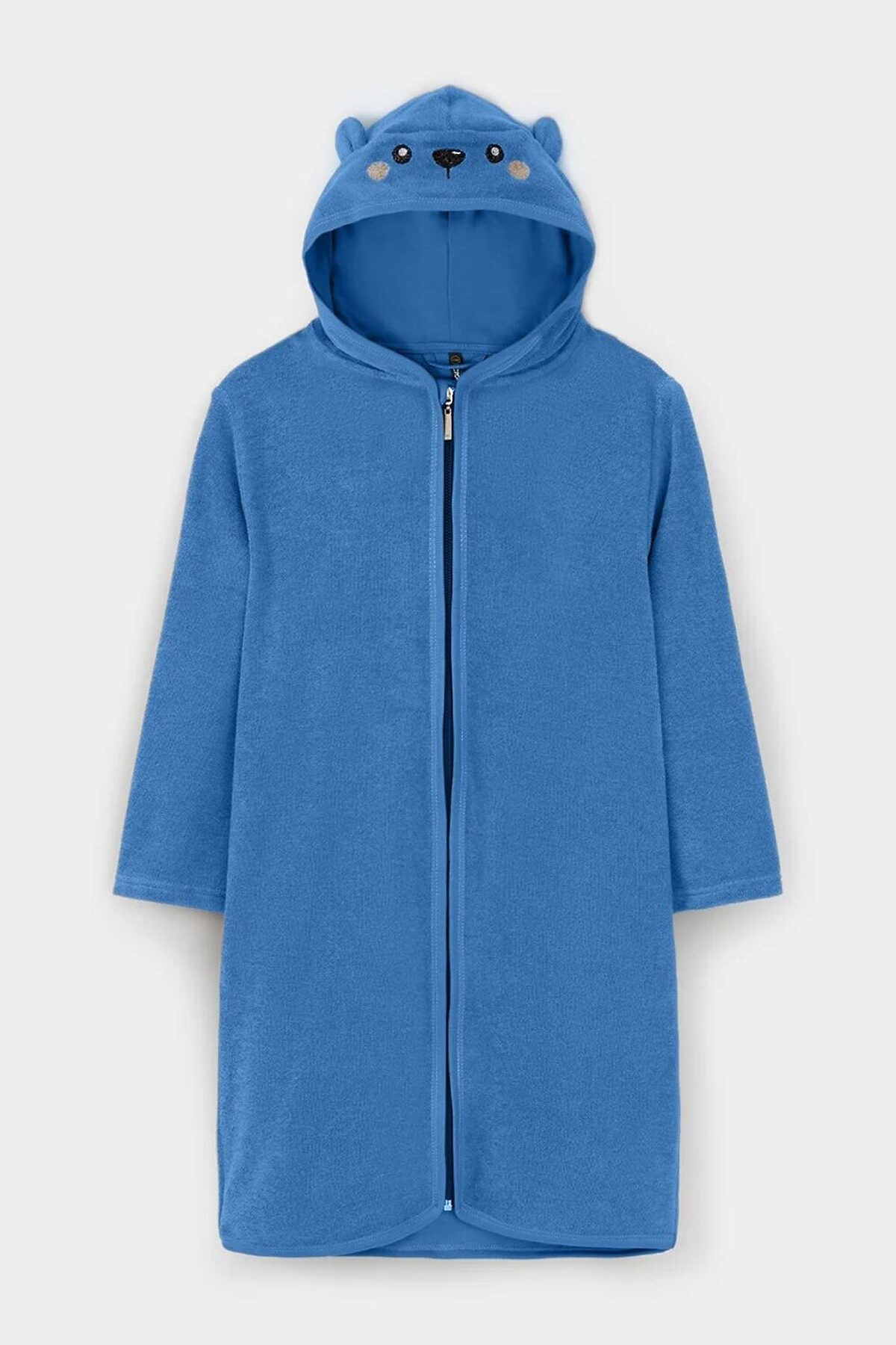 Халат на молнии с капюшоном. Изготовлен из мягкого махрового полотна, произведённого из натурального хлопка. В капюшоне подклад из высококачественного гладкого трикотажа супрем. Изделие украшено вышивкой и декоративными ушками. Края обработаны эластичным кантом. Все трикотажные полотна производятся в соответствии с нормами швейцарского сертификата ЭкоТекс.