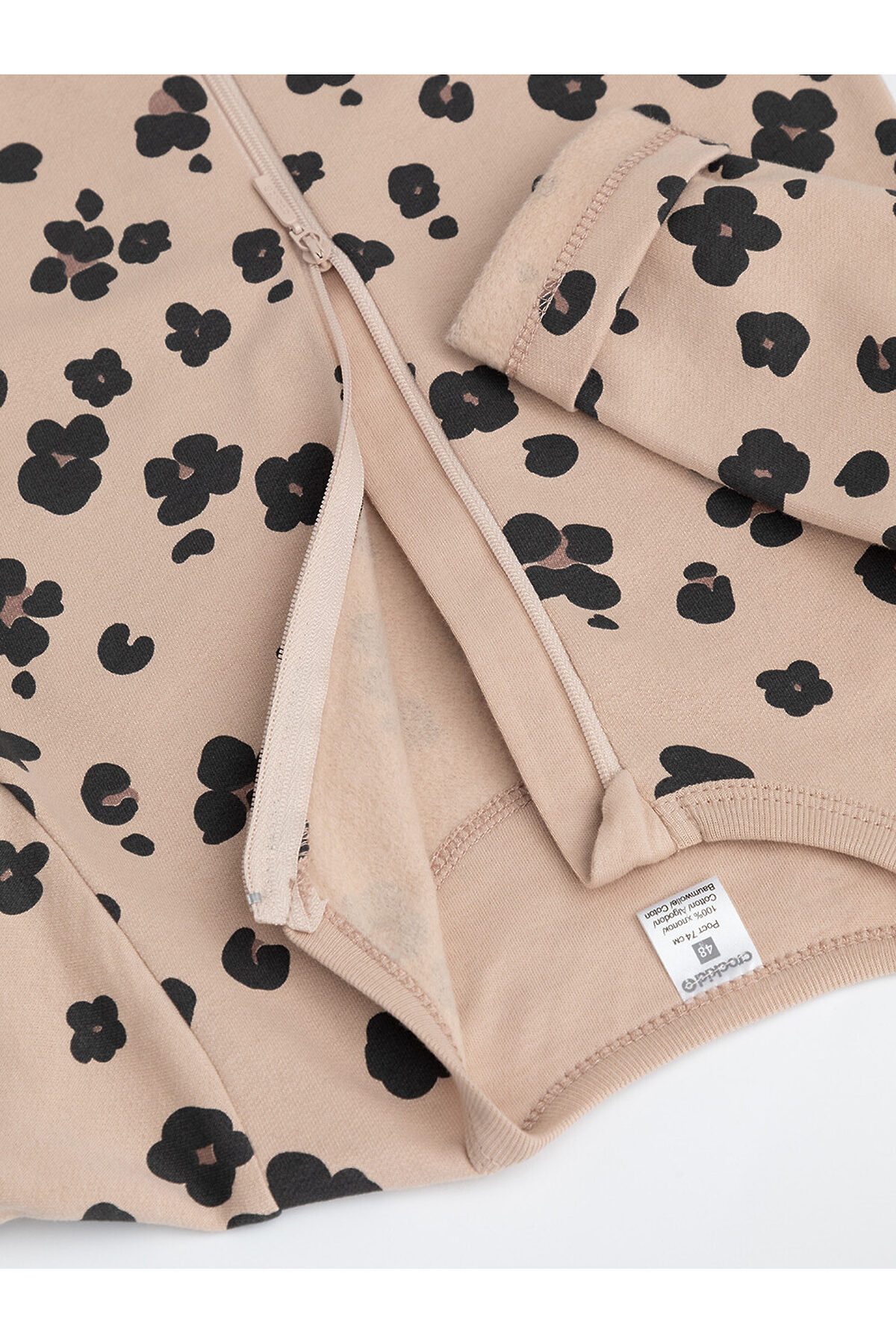 Комбинезон для новорождённых из тонкого футера с начёсом, произведённого из натурального хлопка. Застёгиваются спереди на молнию с мягкой защитой шеи и подбородка. Оригинальная набивка выполнена из стойких гипоаллергенных текстильных красителей. Все трикотажные полотна производятся в соответствии с нормами швейцарского сертификата ЭкоТекс.