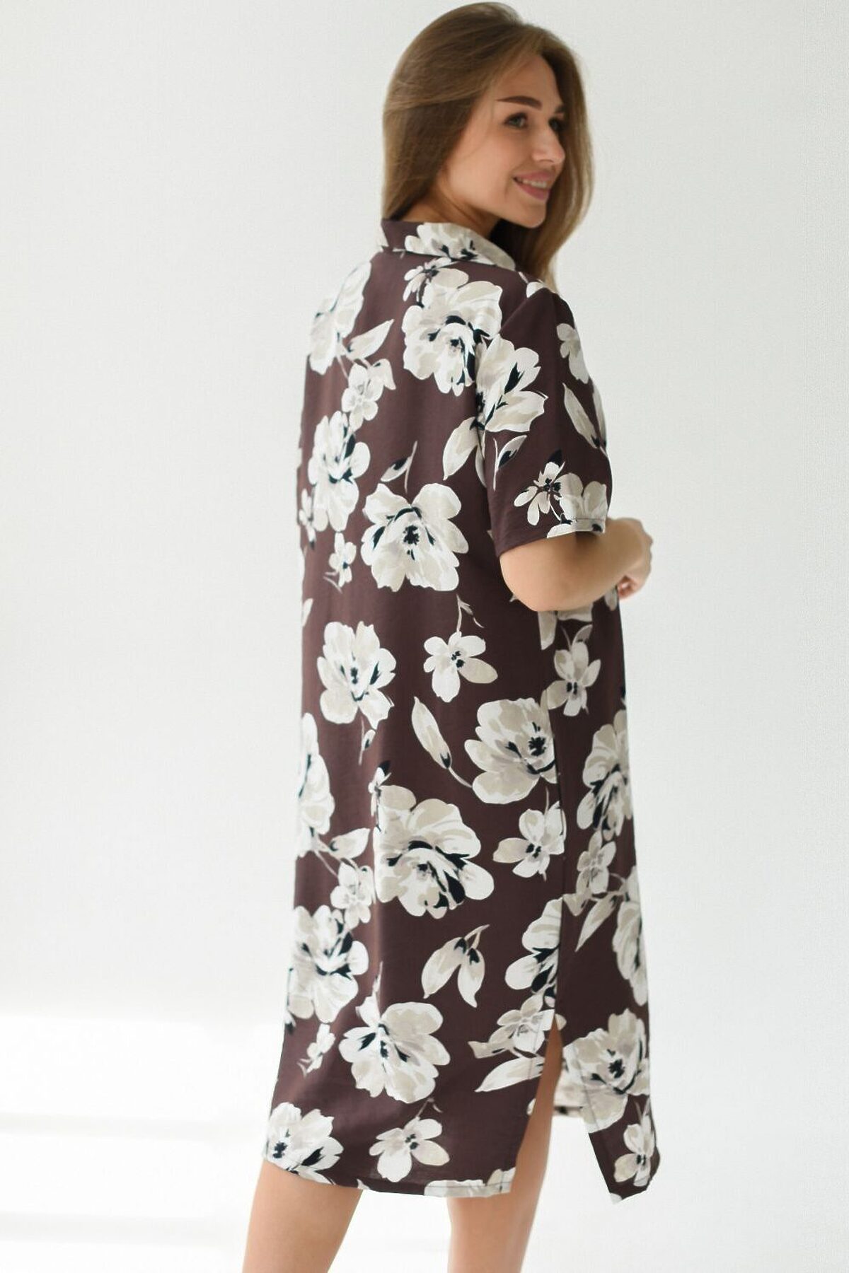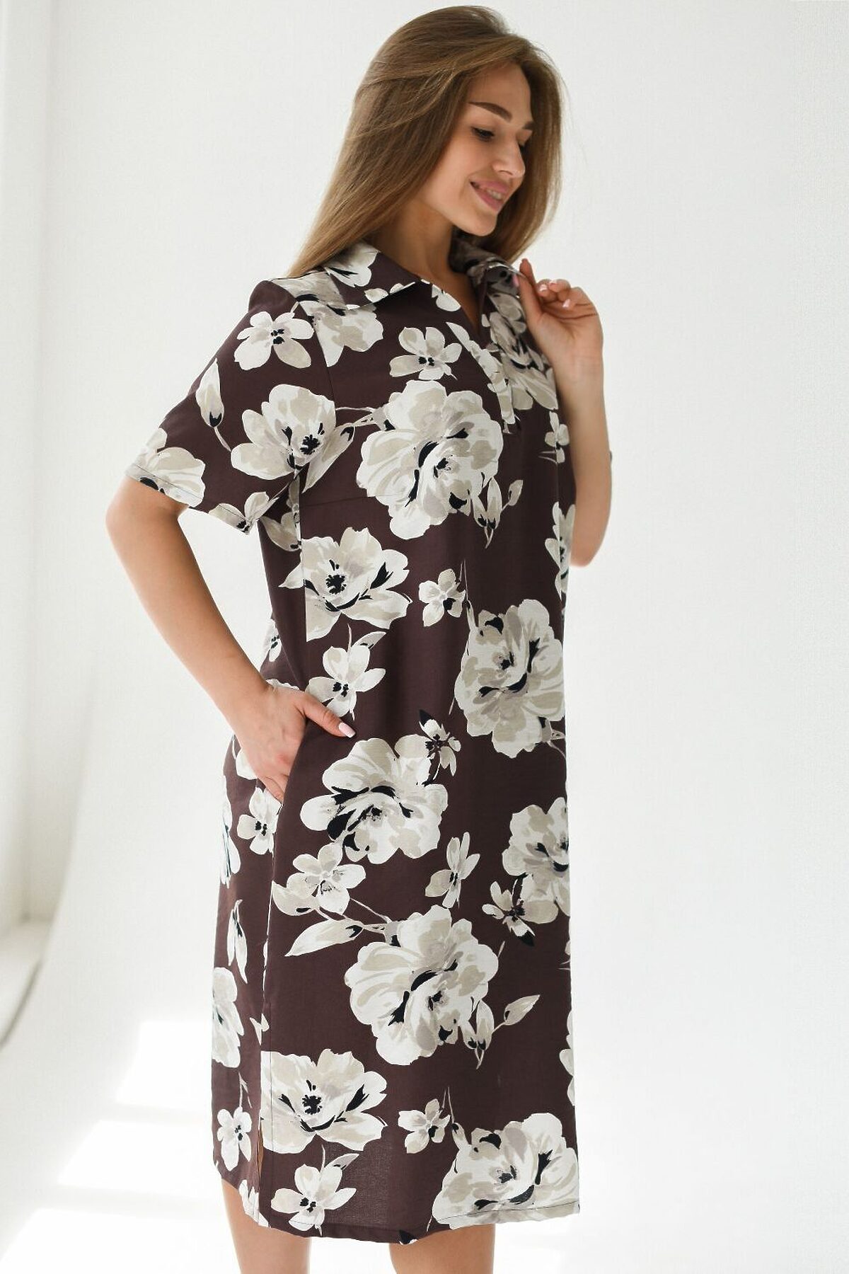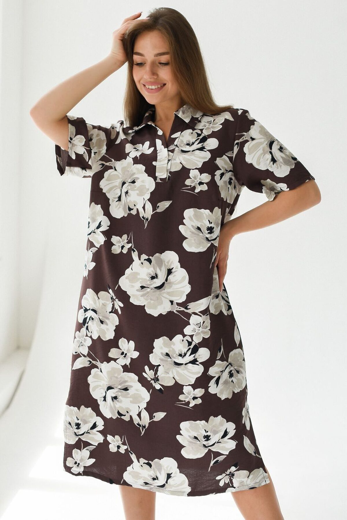 Легкое длинное стильное летнее женское платье в цветочек из полиэстера 100% от российского текстильного бренда Batistcorp Ivanovo (Батист) станет идеальным выбором для жаркого летнего дня. Прямое воздушное платье длиной до колена, боковыми вырезами на ногах и коротким половинным рукавом обеспечит комфорт и свободу движений. Платье с воротником, V-образный вырез горловины. За счет полуприлегающего покроя платье красиво смотрится на любом типе фигуры. В нём вы будете чувствовать себя комфортно и уверенно в любой ситуации. Размерный ряд этого платья представлен в широком спектре, что позволяет каждой женщине найти подходящий размер и насладиться стильным образом на лето. Это летнее платье сарафан от маленьких до больших размеров подходит как для полных женщин, так и для тех, кто ценит свободную и удобную одежду. Крой модели делает её универсальной для разных ситуаций: она подойдёт и для повседневного домашнего использования, и для выхода в свет. Модный принт с цветами придаст образу нежность и неповторимый шарм. Эта модель прекрасно подойдёт как высоким, так и невысоким девушкам. Покупая красивые вещи, вы создаете хорошее настроение и радуете себя и близких. Пусть ваш гардероб всегда будет наполнен стильными и удобны