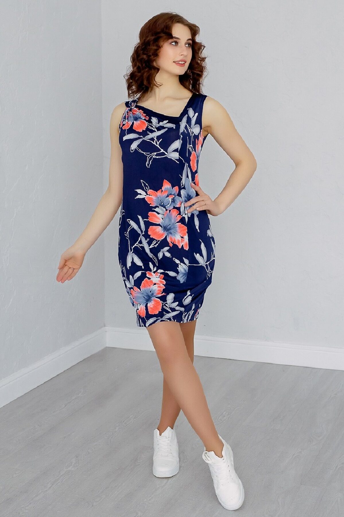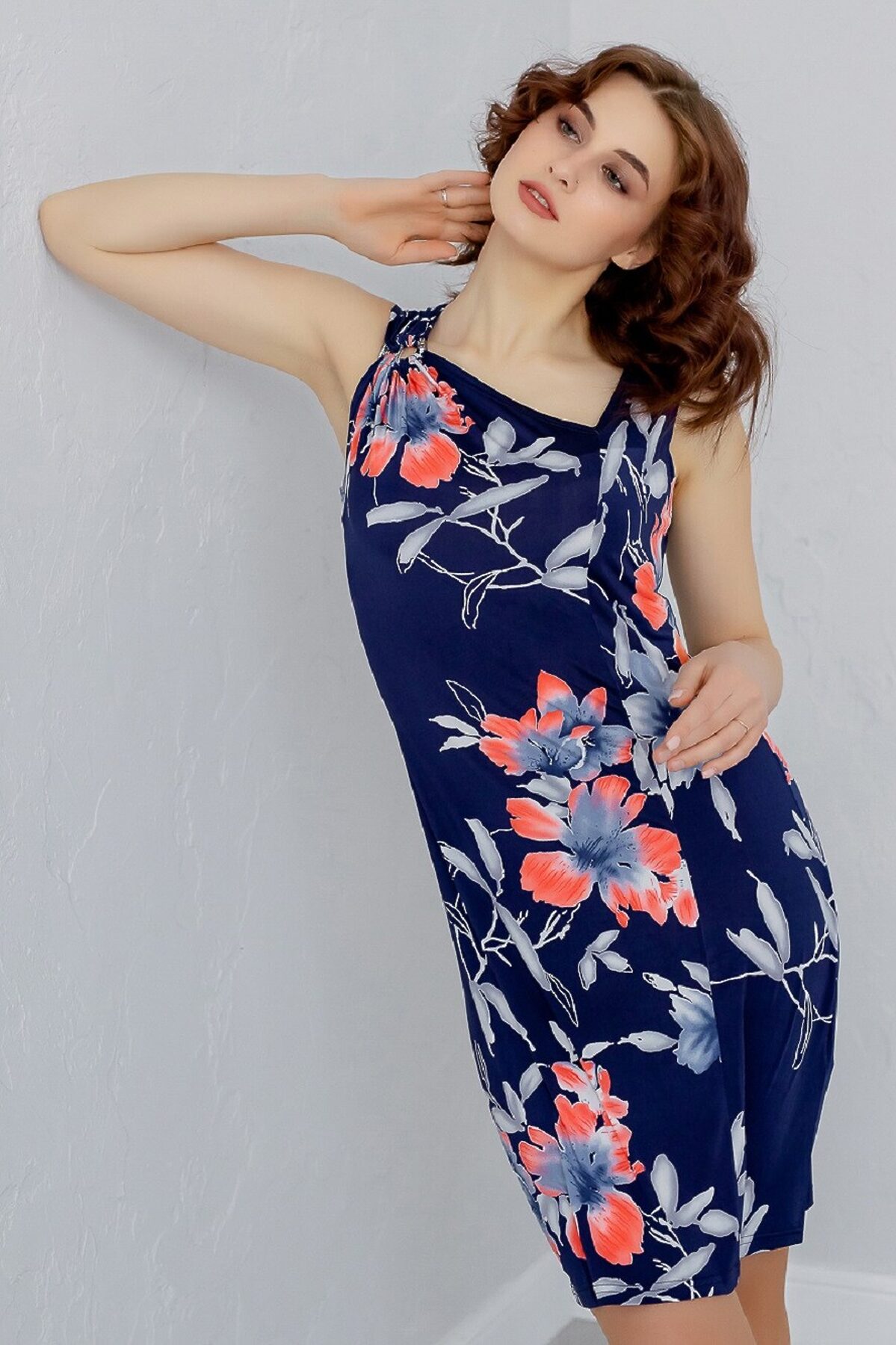 Платье прямого силуэта, длиной чуть ниже линии колена. По переду, в области груди ассиметричная драпировка, которая собрана на металлическое кольцо - подкову.
