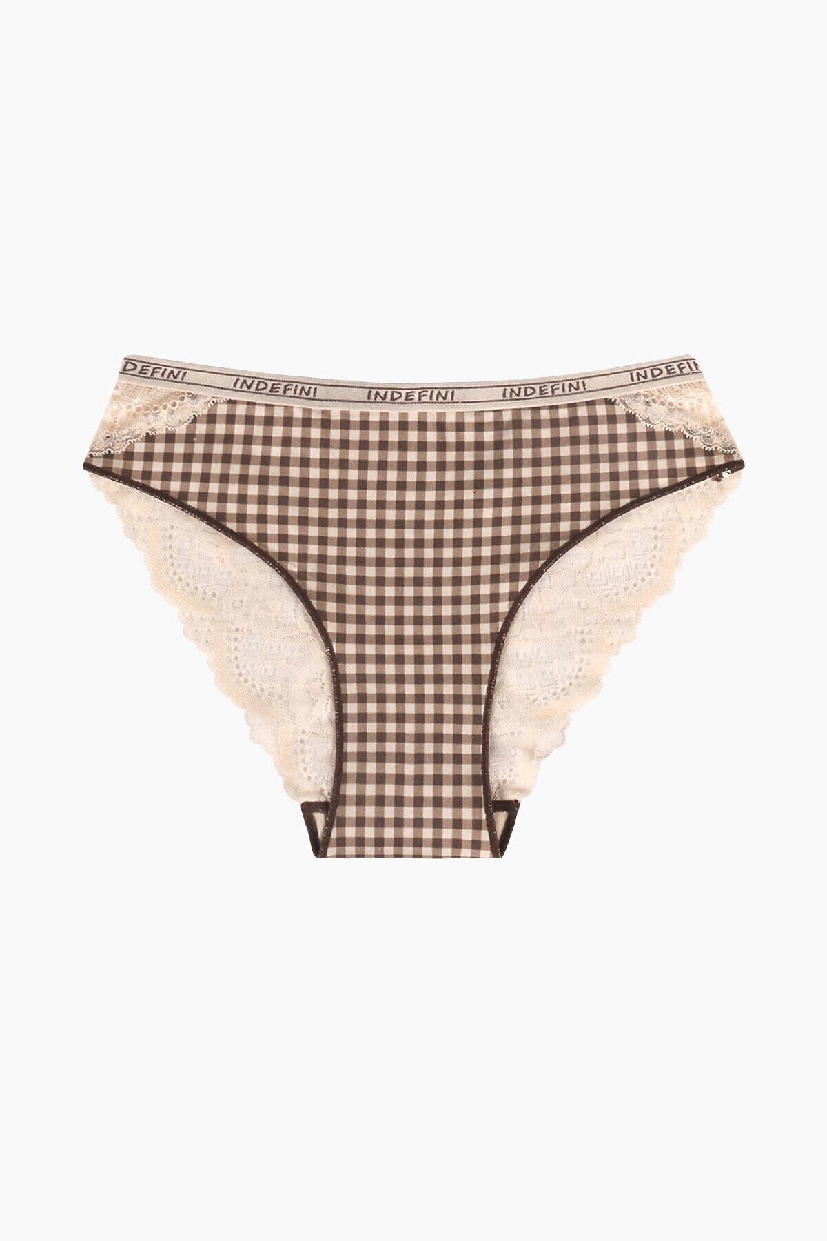 Трусы-слипы от Indefini выполнены из бамбука и хлопка, которые делают эти трусы гипоаллергенными и дышащими, что обеспечивает ощущение свежести и комфорта на протяжении всего дня. Бамбук в составе придаёт ткани мягкость и легкость, а хлопок добавляет изделию прочности и долговечности. Трусы средней посадки, на мягкой эластичной резинке, которая аккуратно фиксирует трусы на талии, не создавая давления и обеспечивая комфортную посадку. Оригинальный принт в бежево-коричневую клетку придаёт женским труса стильный и современный вид. Кружевные вставки по бокам и на задней части добавляют романтичности и женственности, делая эти трусы-слипы от Indefini не только удобными, но и визуально привлекательными.