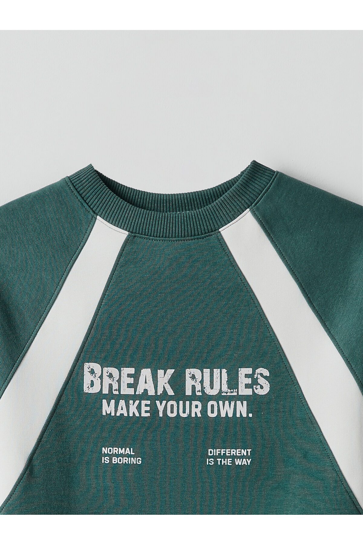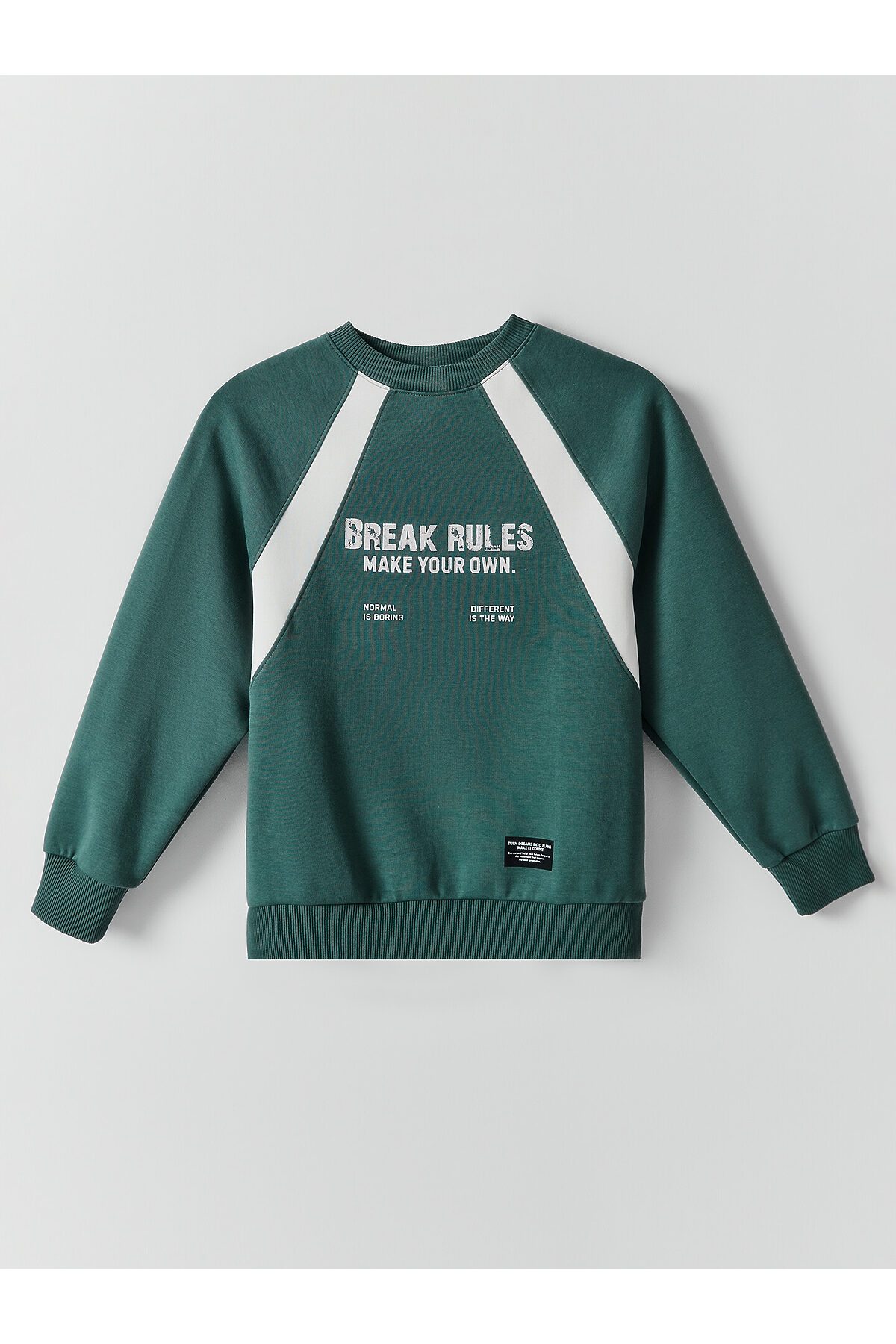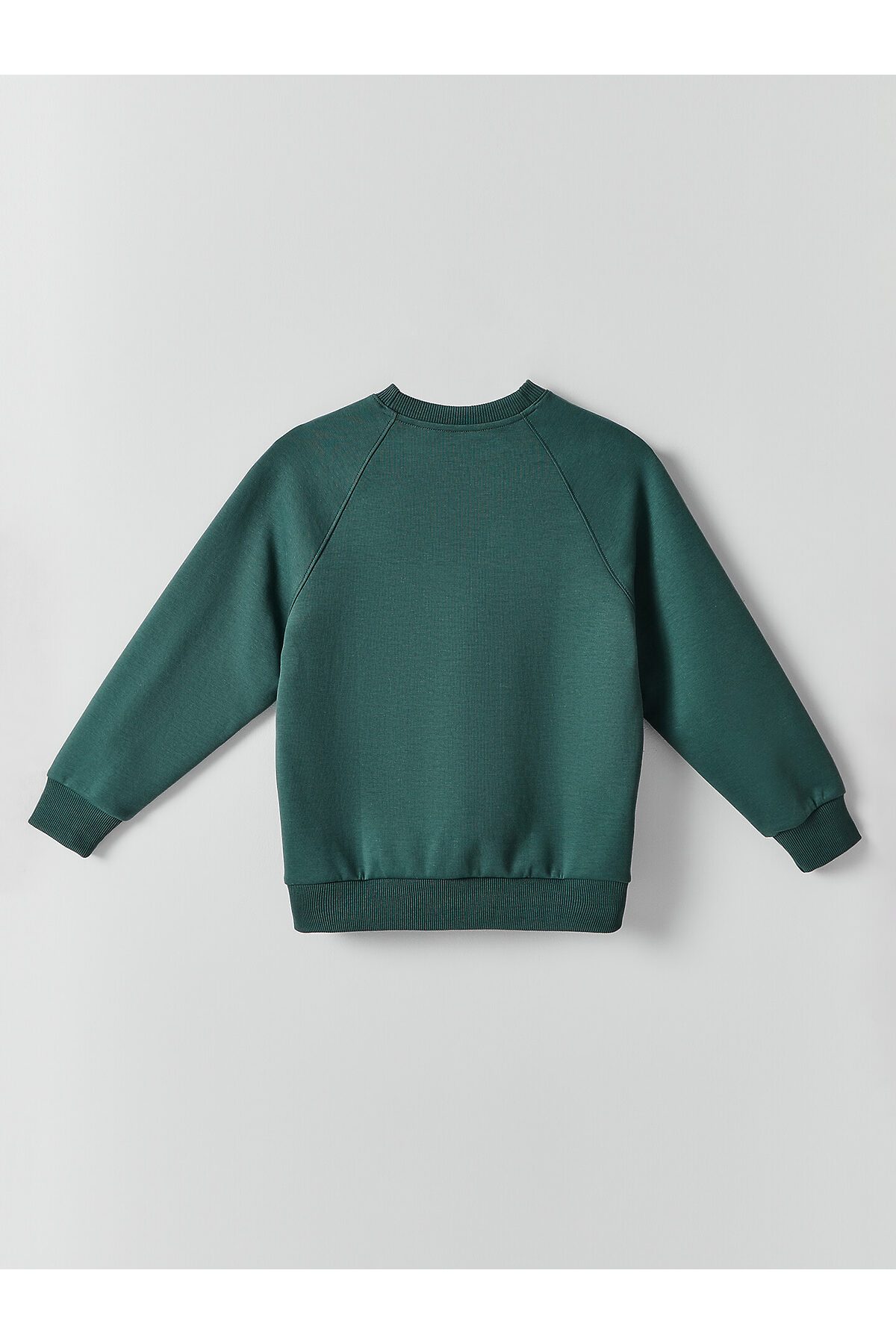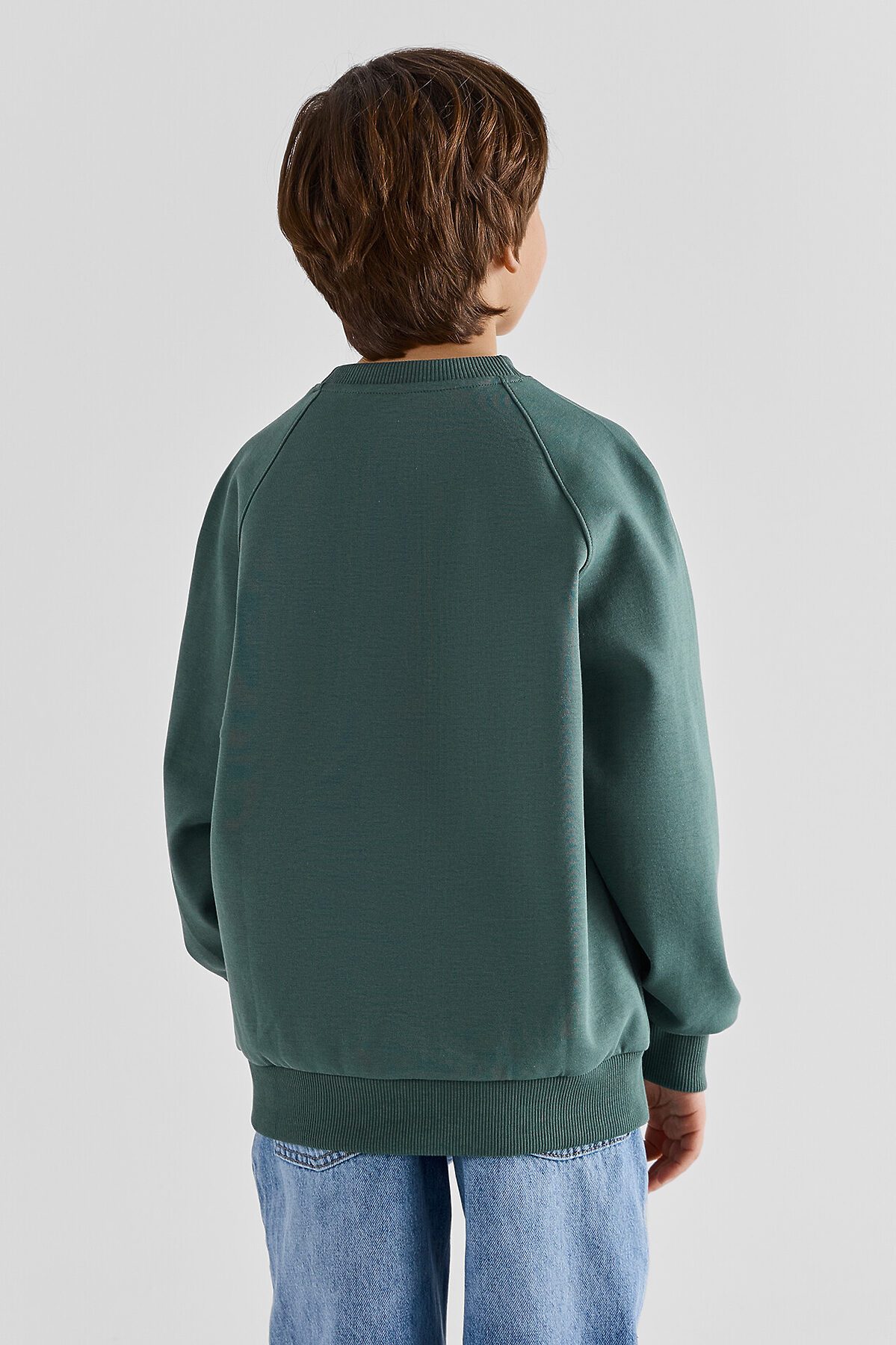 Свитшот для мальчиков свободного силуэта. Рукава длинные, реглан, с отрезными манжетами из рибаны. По переду отрезные детали вдоль шва притачивания рукава реглан. Горловина круглой формы, обтачка из трикотажного полотна рибаны 2*2. Шов втачивания рибаны по спинке закрыт х/б тесьмой. По нижнему срезу изделия притачен пояс из рибаны.