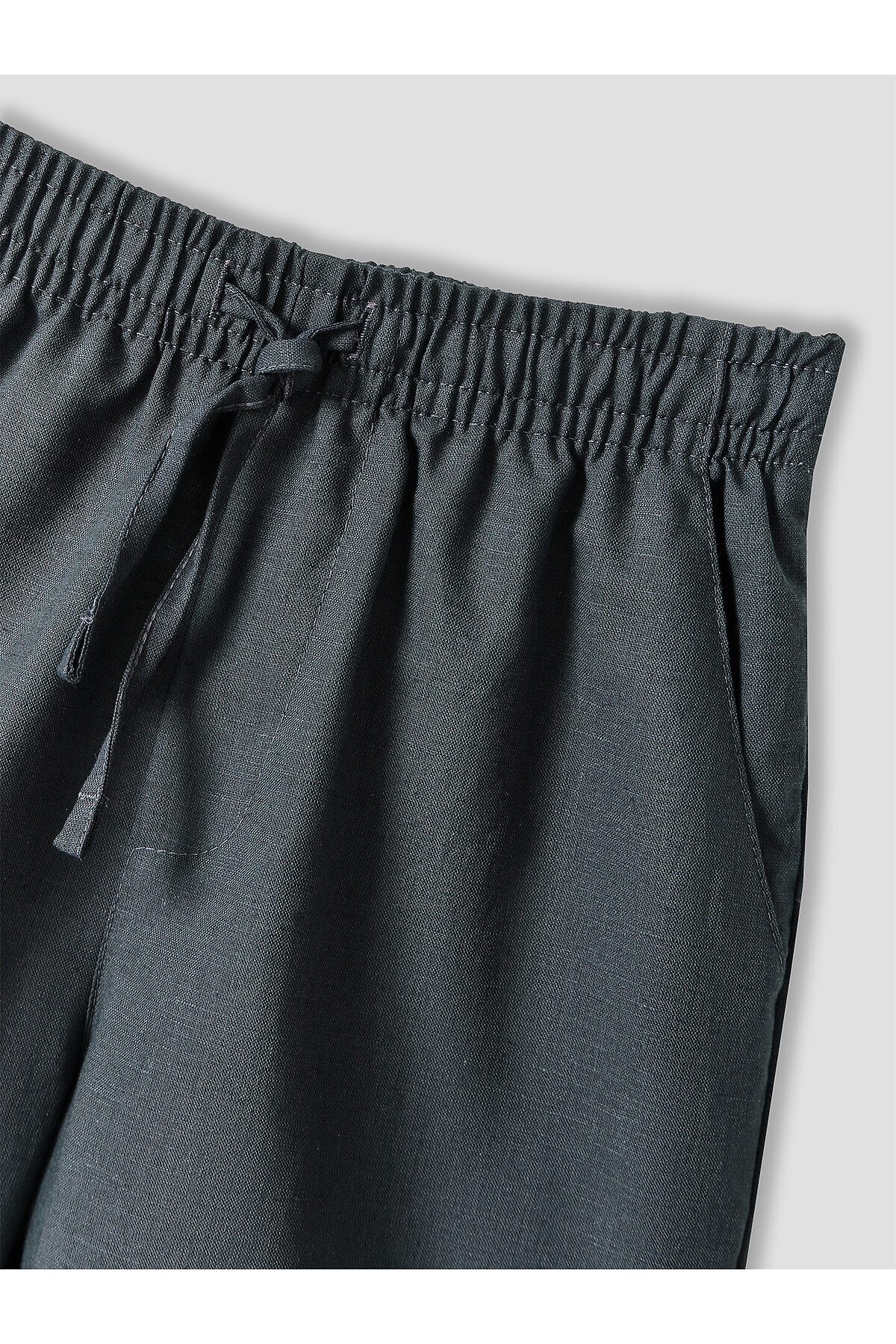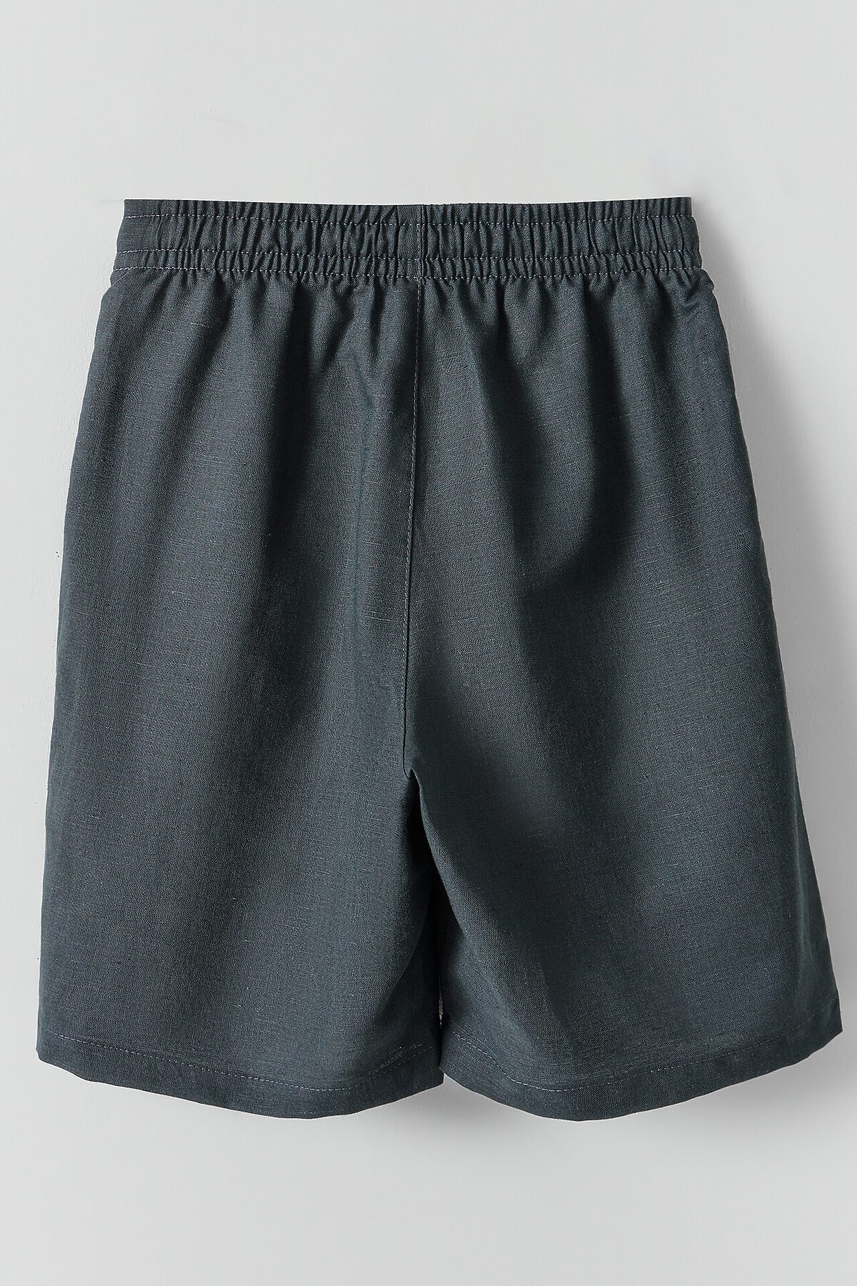Шорты прямого силуэта. Посадка средняя. Пояс цельнокроеный с эластичной тесьмой внутри. Шов сидения шорт распошит. На поясе пробиты петли, заправлен шнур из основного полотна. По переду имитация гульфика, обработаны карманы с наклонным входом от боковых швов. Низ шорт обработан швом в подгибку.