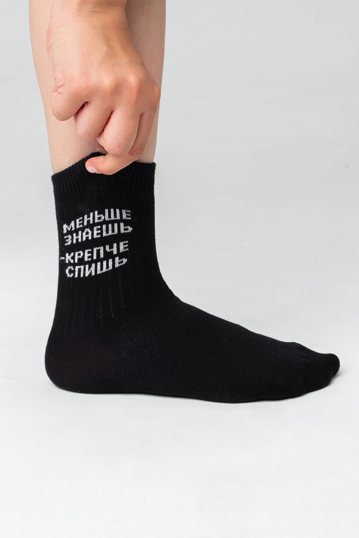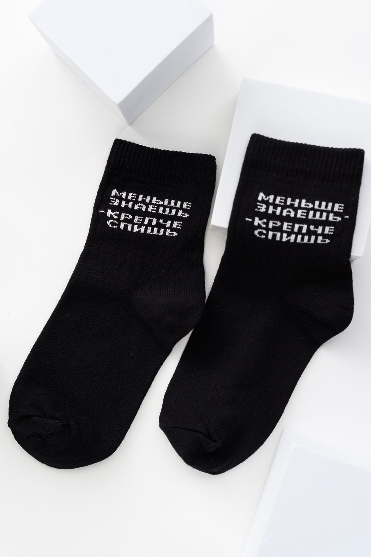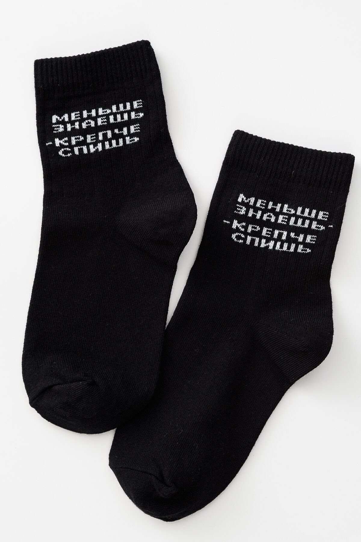 Подростковые носочки с надписью Меньше знаешь - крепче спишь, связанные из натурального хлопка. Креативная модель мягко облегает ногу, не доставляя дискомфорт в течение всего дня. Носки сочетаются с разной обувью, подходят как мальчикам, так и девочкам.